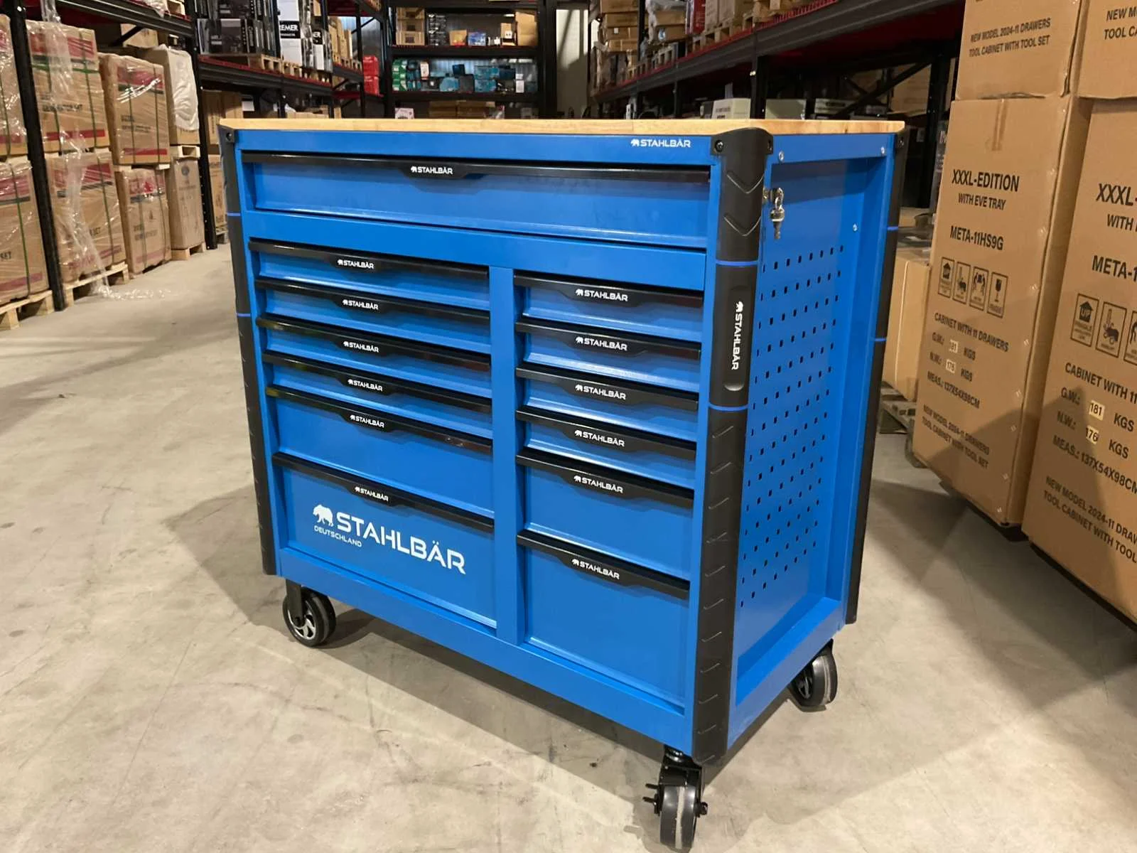 Voorzien van 13 lades waarvan 10 gevuld met gereedschap; professioneel chroom-vanadium gereedschap; heavy duty gereedschapswagen; houten werkblad; 4 wielen; stevig handvat; ongebruikt in doos (transport afmetingen 115x50x100 cm) Merk: Stahlbär Type: Deutschland XXXL PRO Bouwjaar: 2025 Aantal laden: 13 Met inhoud: true Eigen gewicht: 138kg Totale afmeting L: 1150mm Totale afmeting Breedte: 500mm Totale afmeting Hoogte: 1000mm