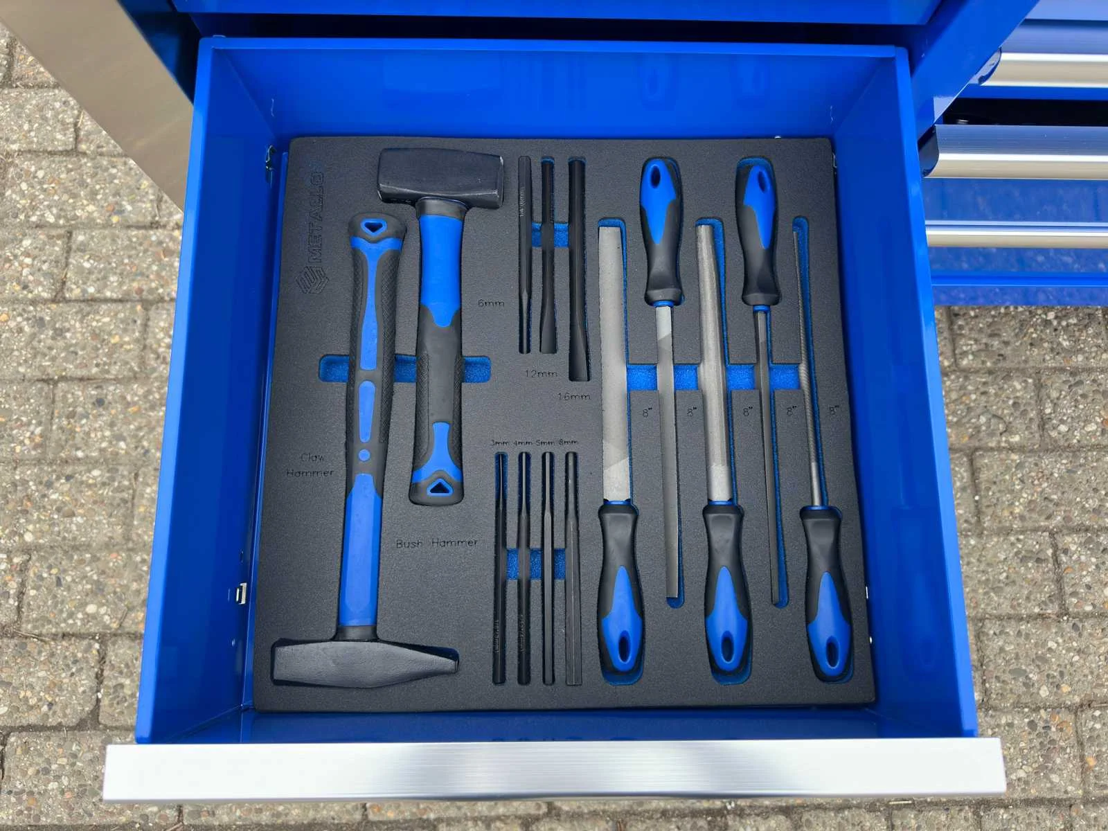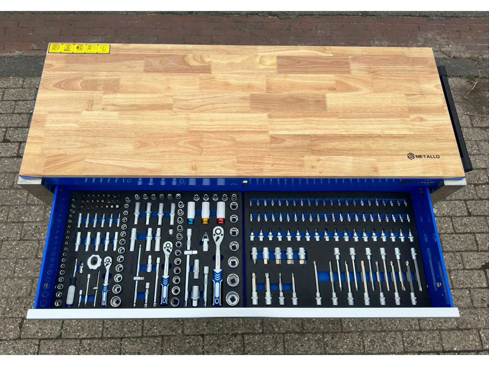 Voorzien van 11 lades waarvan 9 gevuld; Chrome vanadium; Houten werkblad; 4 wielen waarvan 2 zwenkwielen; Handvat; Ongebruikt in doos Merk: Metallo Type: Jumbo Kleur: grijs Lengte: 146cm Breedte: 55cm Hoogte: 110cm