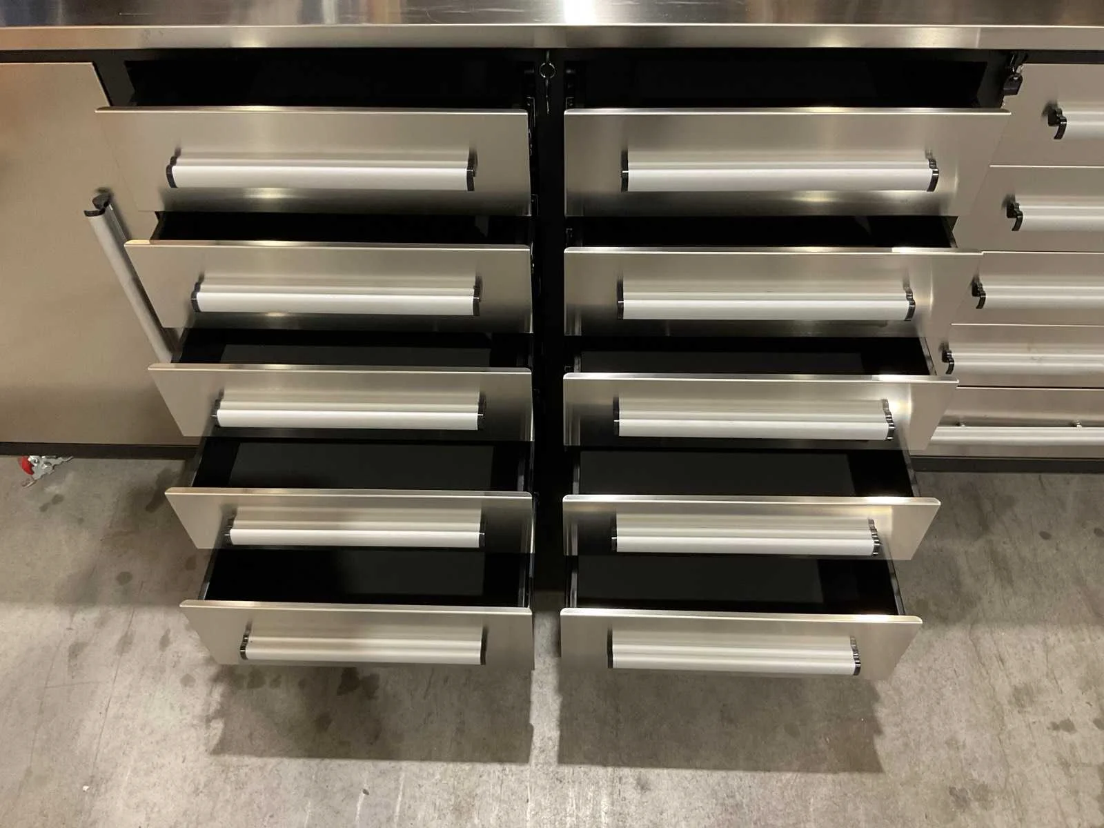 RVS werkbank met 15 lades en 2 deurkasten; 5cm opstaande rand. Merk: Stahlworks Model: RVS Product type: 10-15 0/C Breedte: 30000mm Lengte: 600mm Hoogte: 1075mm Materiaal: RVS