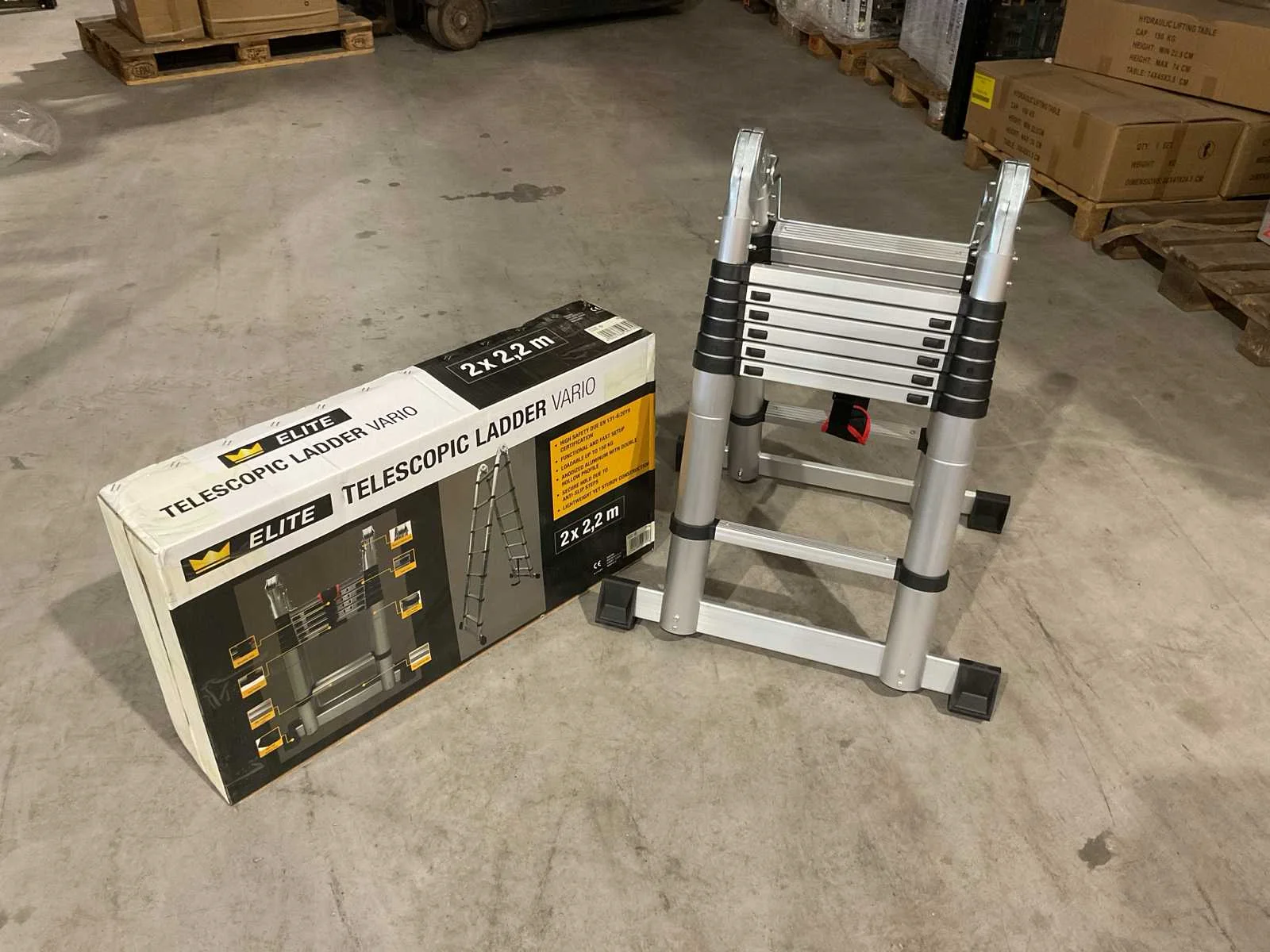 Voorzien van anti slip tredes; veiligheid band; ongebruikt in doos (transport afmetingen 90x50x20 cm) Merk: Elite Type: Vario 2x2,2 m Bouwjaar: 2025 Aantal treden: 16 Eigen gewicht: 18kg