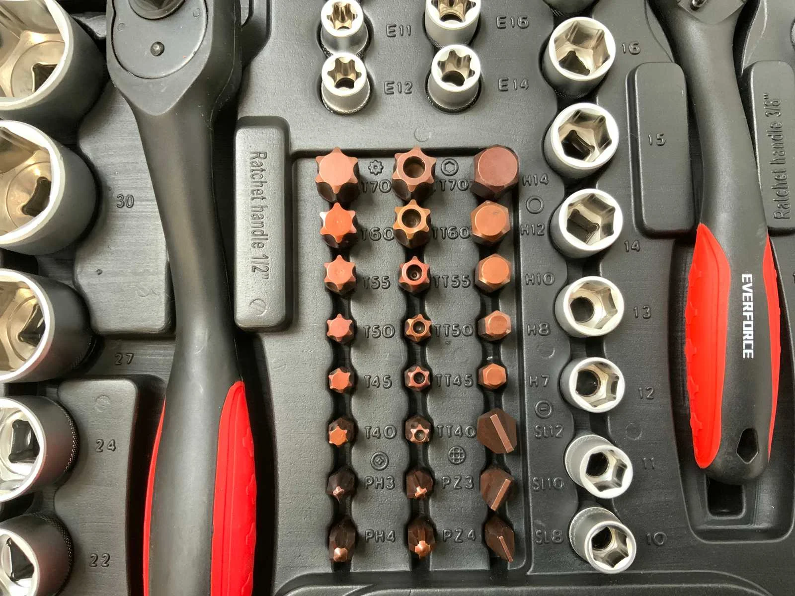 Chrome-vanadium; Doppenset 1/4” 4-4.5-5-5.5-6-7-8-9-10-11-12-13-14; Doppenset 1/2” 10-11-12-13-14-15-16-17-19-20-21-22-23-24-27-30-32- E20-E24; Doppenset 3/8” 10-11-12-13-14-15-16-17-18-19- E10-E11-E12-E14-E16-E18; koppelstukken; verlengstukken; spinner; bitset; 5972 Merk: Everforce Met koffer: true Delig: 172 Type: EF-1048