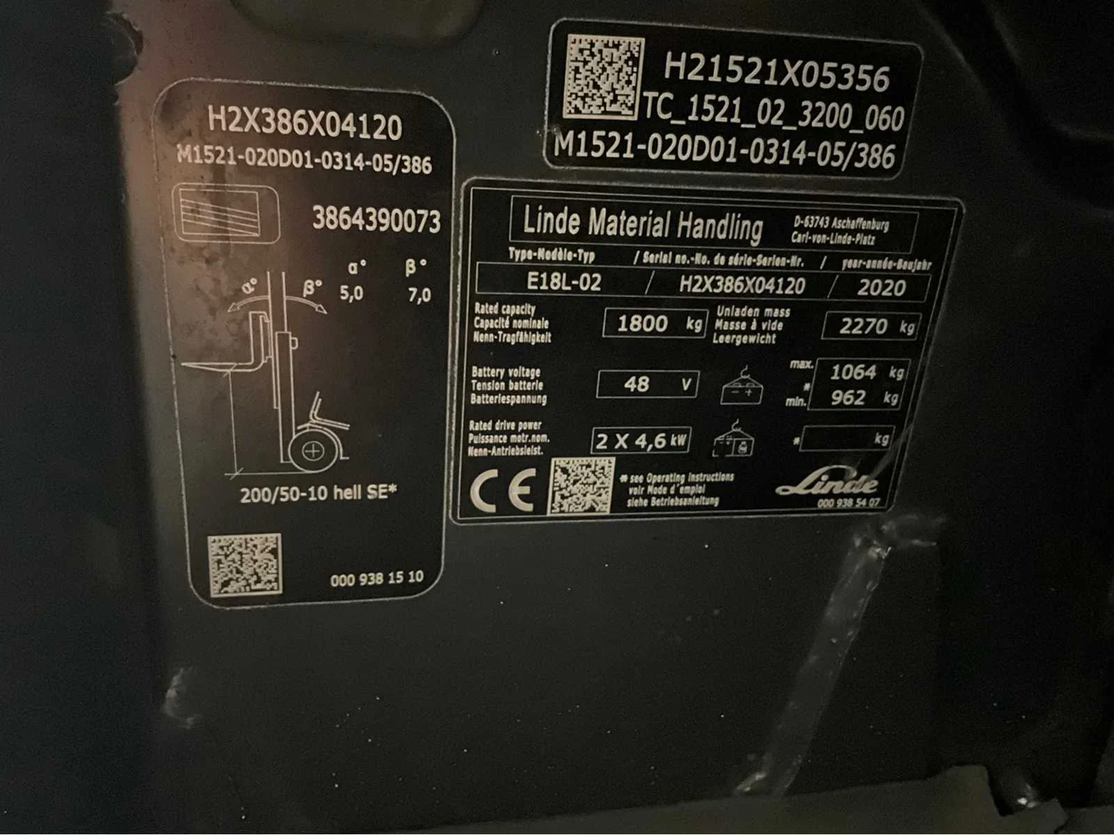 Extra opties : Technisch 100% , altijd bij Motrac linde in onderhoudt geweest , uitschuifbare lepels , 4 functies , led verlichting achter , blue spot achter , comfort seat , joy stick , stoel verwarming , Reach vorken , non-marking banden , recent gekeurd Merk: Linde E18 Type: E18L-02 Bouwjaar: 2020 Serienummer: H2X386X04120 Aantal wielen: 3 Free-lift: true Side-shift: true Eigen gewicht: 3334kg Hefvermogen: 1800kg Hefhoogte: 3200mm Vol rubber banden: true Totale afmeting L: 3310mm Totale afmeting Breedte: 1130mm Totale afmeting Hoogte: 2120mm