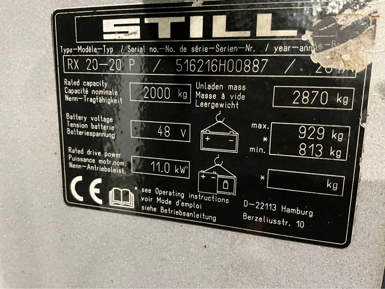 Extra opties : volledige cabine , Rondom led verlichting , verwarming , zeer lage uren , cabine verlichting Merk: Still Type: RX 20-20 Bouwjaar: 2017 Serienummer: 516216H00887 Mast: Triple Soort band: Volrubber banden Aantal wielen: 4 Afgelezen urenstand: 3494 Free-lift: true Side-shift: true Triple mast: true Eigen gewicht: 3799kg Hefvermogen: 2000kg Hefhoogte: 4680mm Vol rubber banden: true