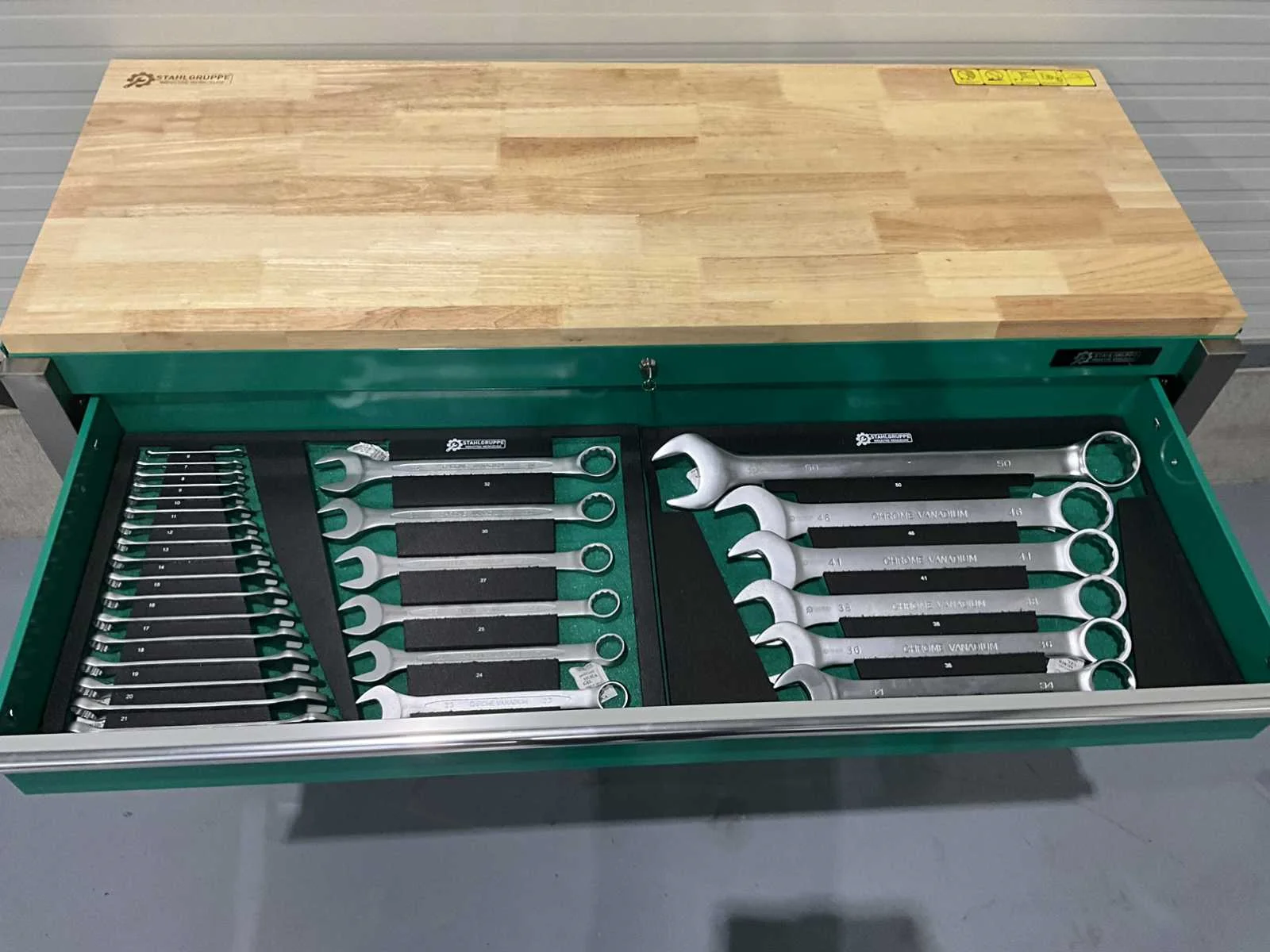Ongebruikt 4 zwenkwielen rattelset en doppenset tot en met maat 50 386 st Heavy Duty gereedschapswagen gebruik: voor professionals aantal laden: 11 laden aantal gevulde laden: 9 gevulde laden gereedschap: chroom-vanadium gereedschap inhoud: 29-delige ring-steeksleutel set (6 mm - 50 mm) 3 ratelsleutel sets met doppen & bitsen (1/4”, 3/8” & 1/2”) 11-delige ring-ringsleutel set (6*7 mm - 30*32 mm) verstelbanre moersleutel 12-delige tangen set 2 hamers & 4 vijlen puntslag en beitel set 12 schroevendraaiers inbussleutels, Torxsleutels, precisiegereedschap 21-delige T-sleutelset 34-delige krachtdoppen set (12 mm - 50 mm) + Torx & inbus doppen & ratelsleutel 3/4,” LED-lamp, zaag, schaar, mes, meetgereedschappen enzovoort... in de originele verpakking Merk: Jumbo Type: SG56 Pro Bouwjaar: 2025 Aantal laden: 11 Met inhoud: true Eigen gewicht: 201kg Totale afmeting L: 1480mm Totale afmeting Breedte: 520mm Totale afmeting Hoogte: 1110mm