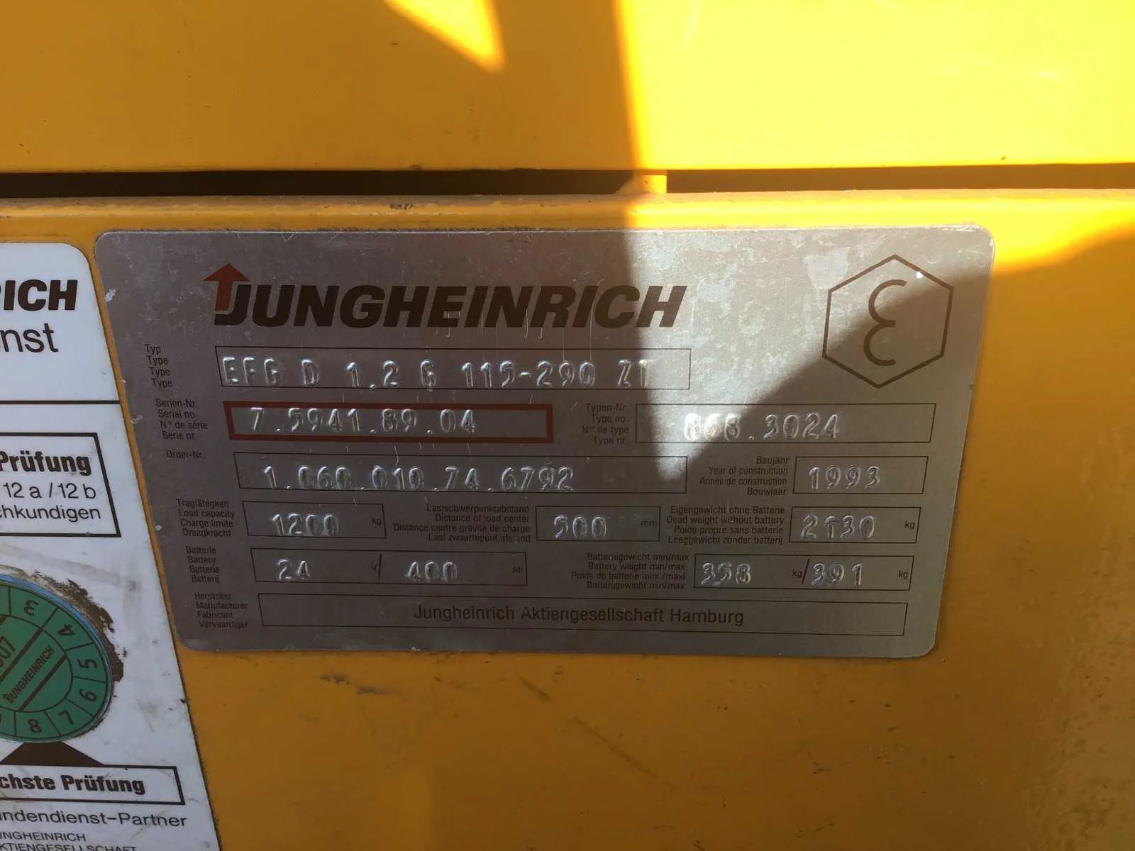 Merk: Jungheinrich Serienummer: 7.5941.89.04 Mast: Duplex Soort band: Volrubber banden Aantal wielen: 3 Hefvermogen: 1200kg Lepellengte: 1100mm Max. hefhoogte: 2900mm Totale afmeting L: 990mm Totale afmeting Breedte: 2850mm Totale afmeting Hoogte: 1940mm