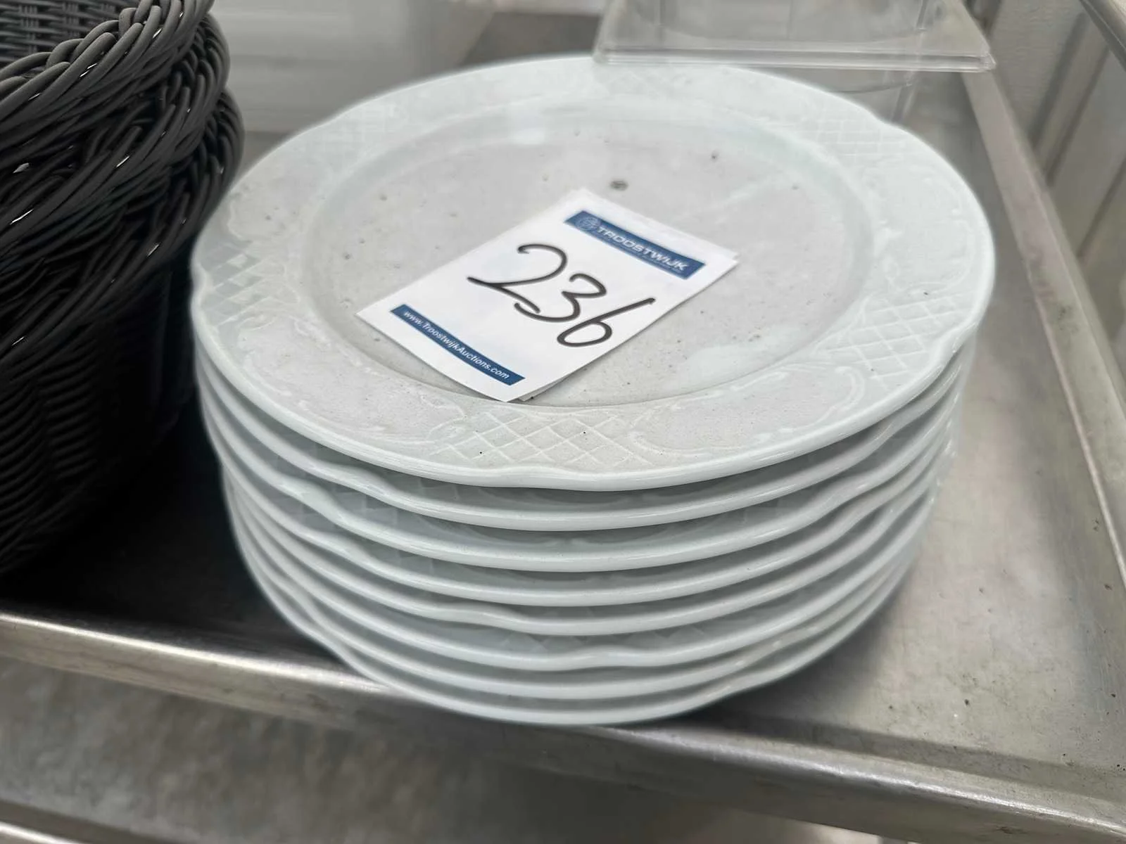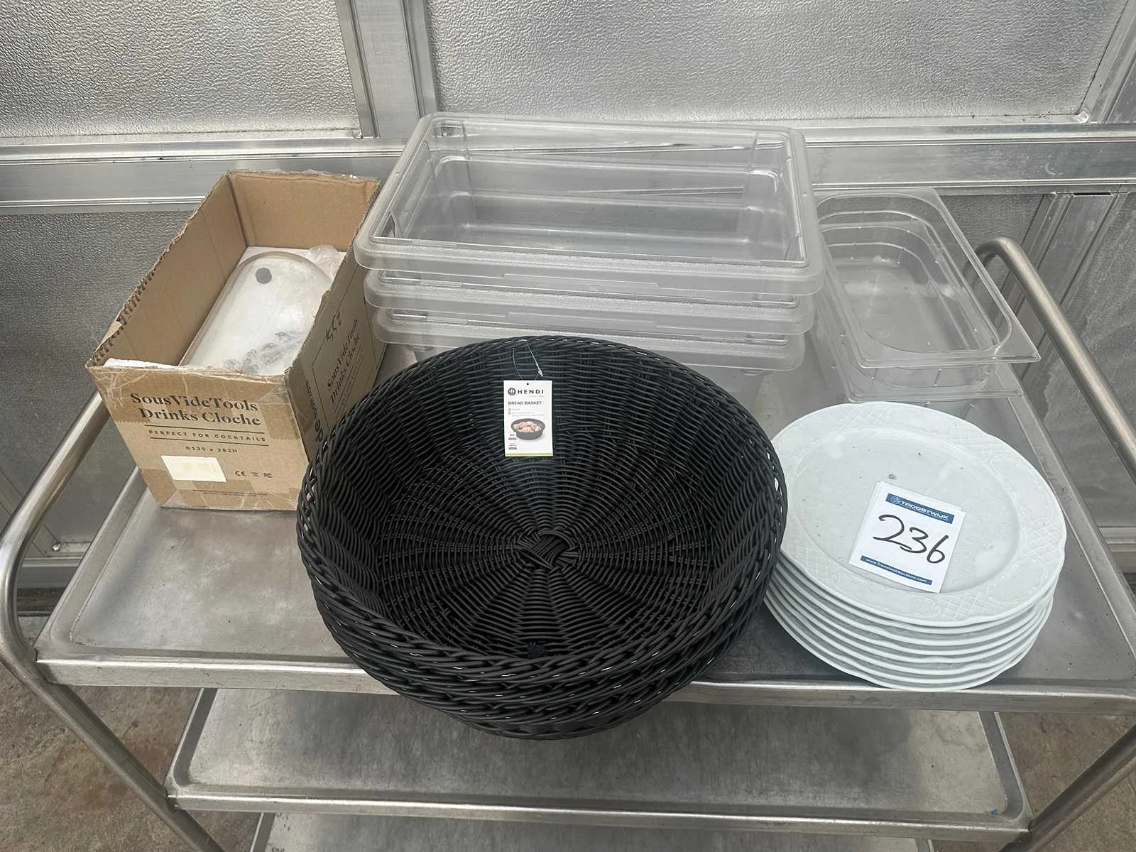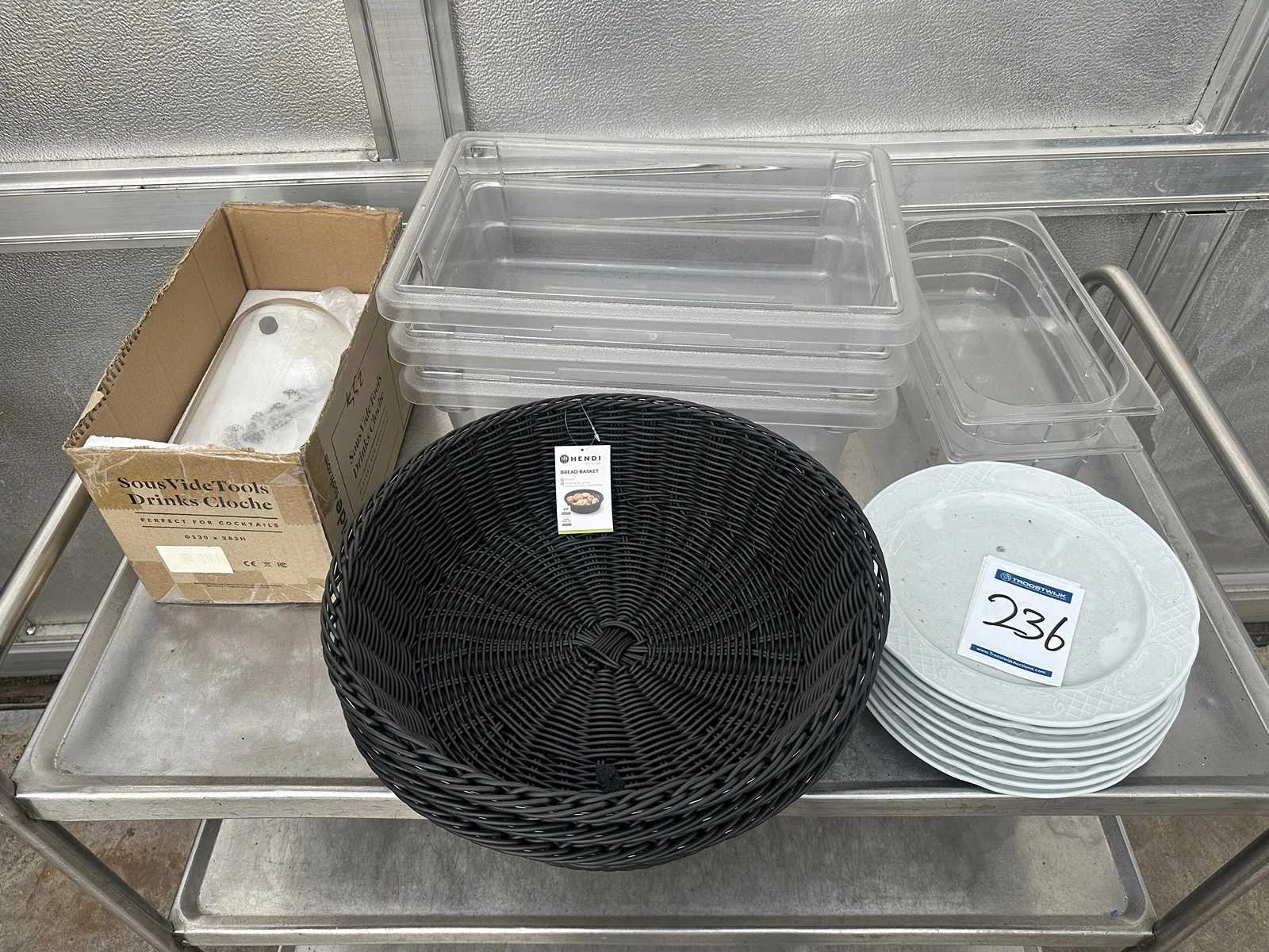 Bestaande uit acht porseleinen restaurant borden , drie broodmandjes , drie gastronoom bakken 11,3 l , glazen stolp , twee gastronoom bakken 1/3 GN Merk: Hendi