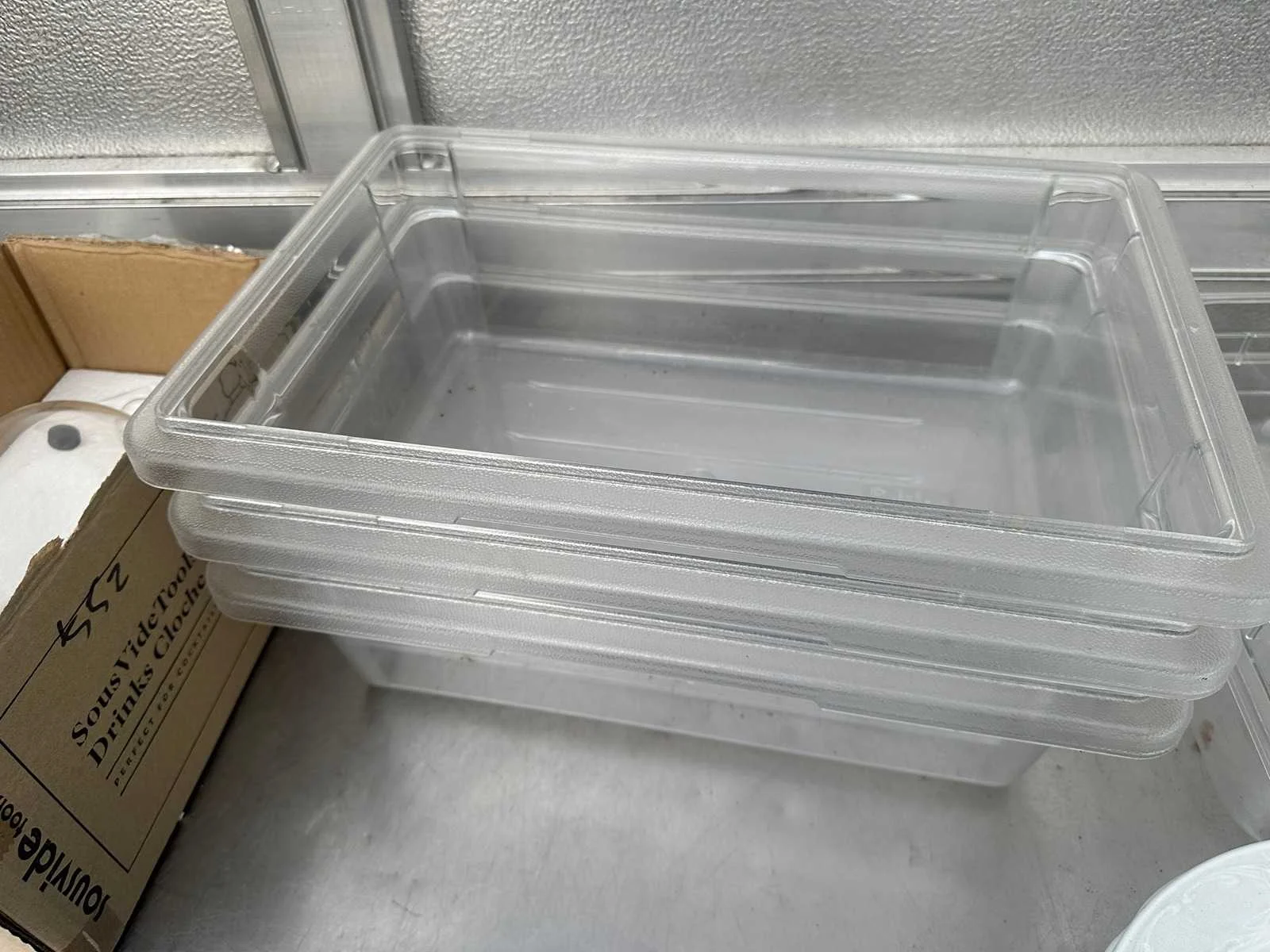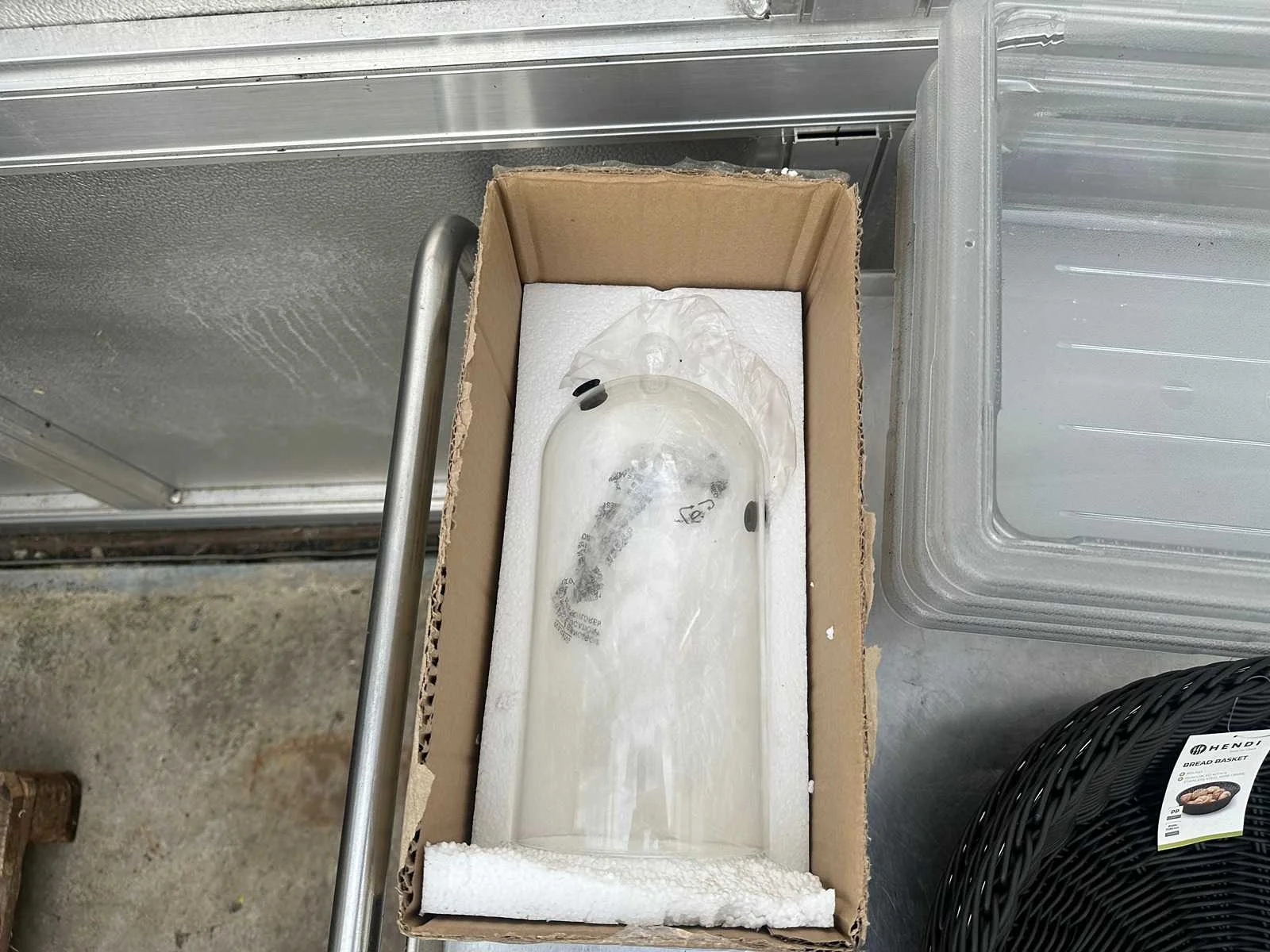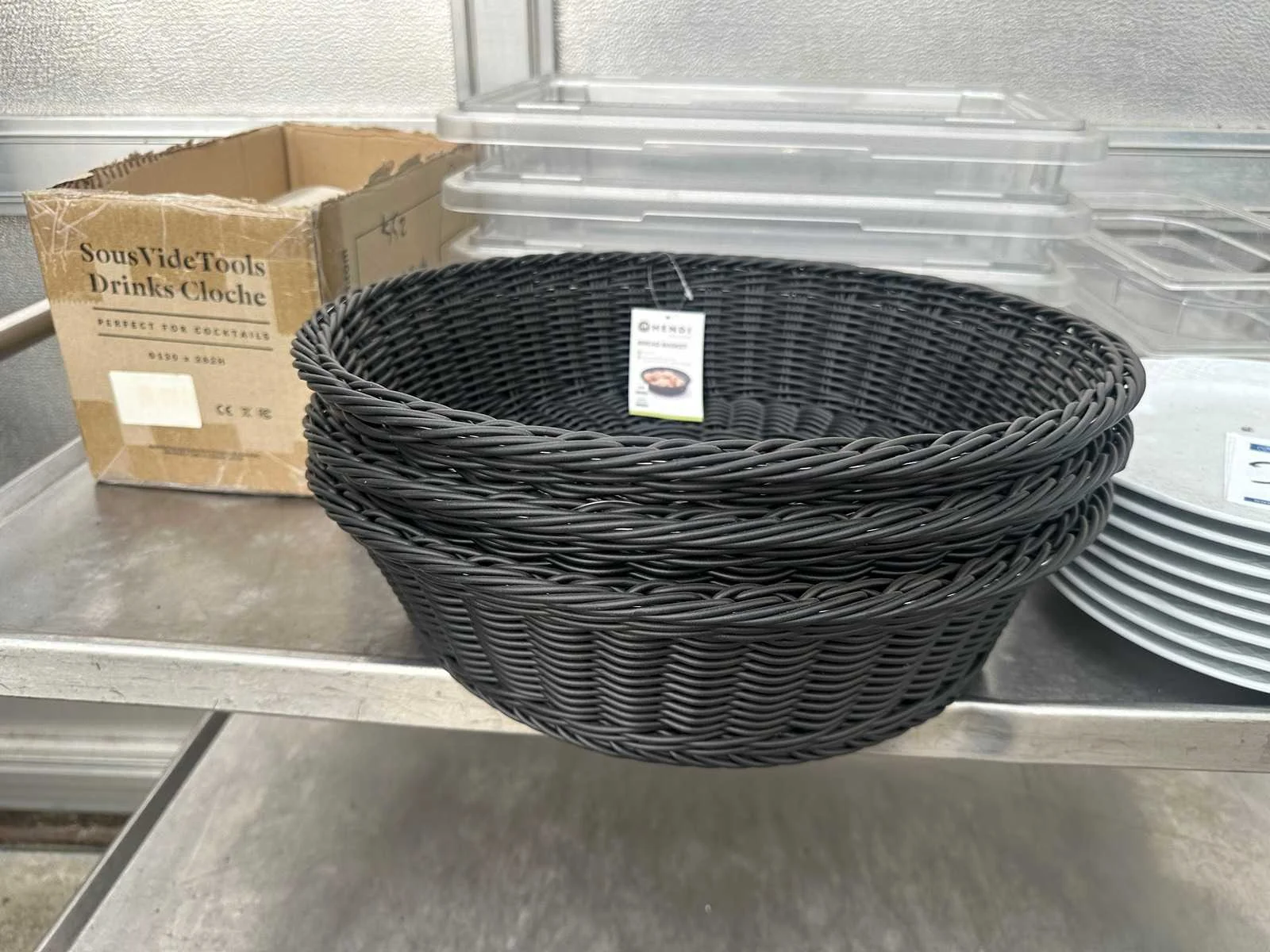 Bestaande uit acht porseleinen restaurant borden , drie broodmandjes , drie gastronoom bakken 11,3 l , glazen stolp , twee gastronoom bakken 1/3 GN Merk: Hendi