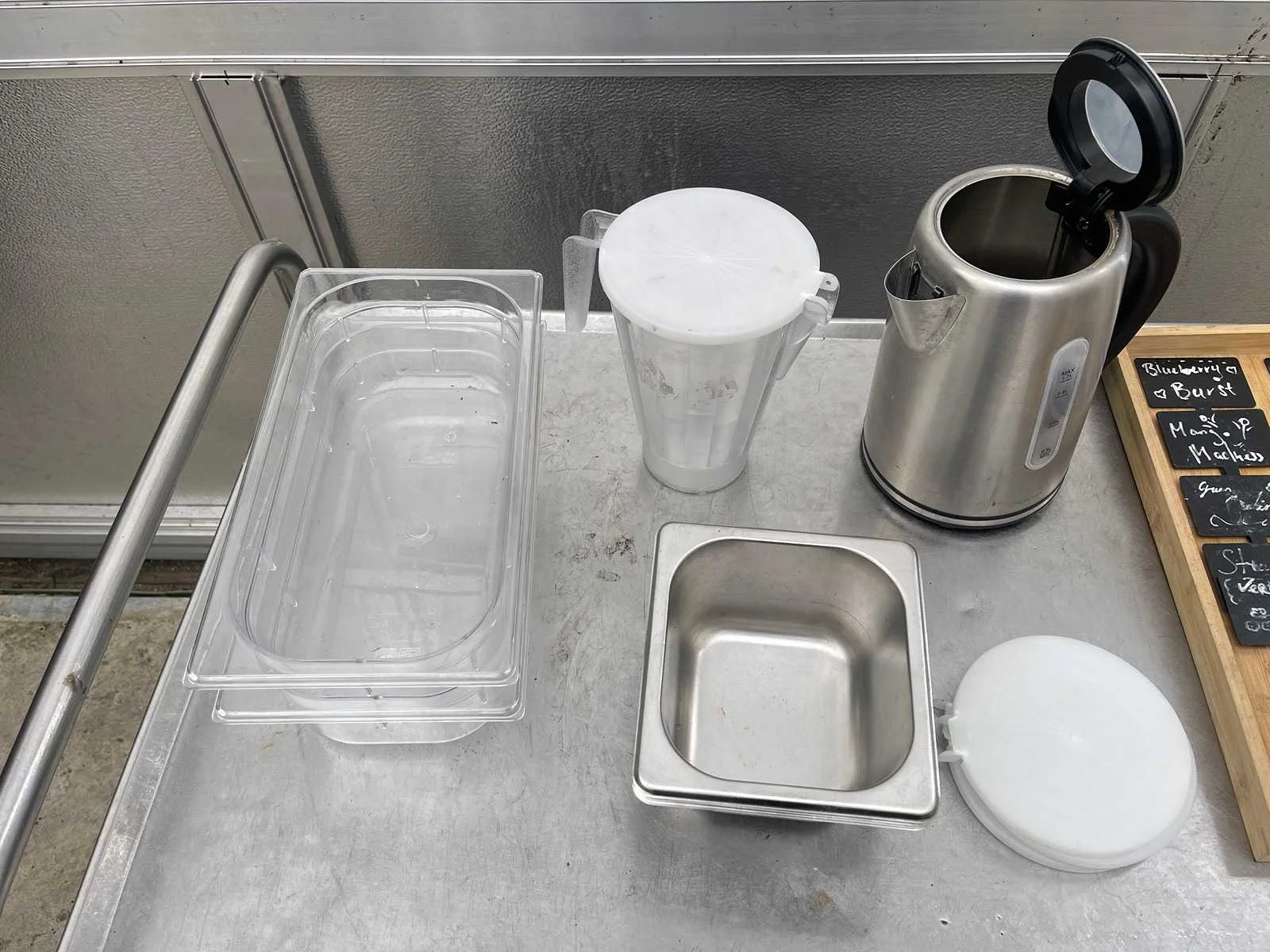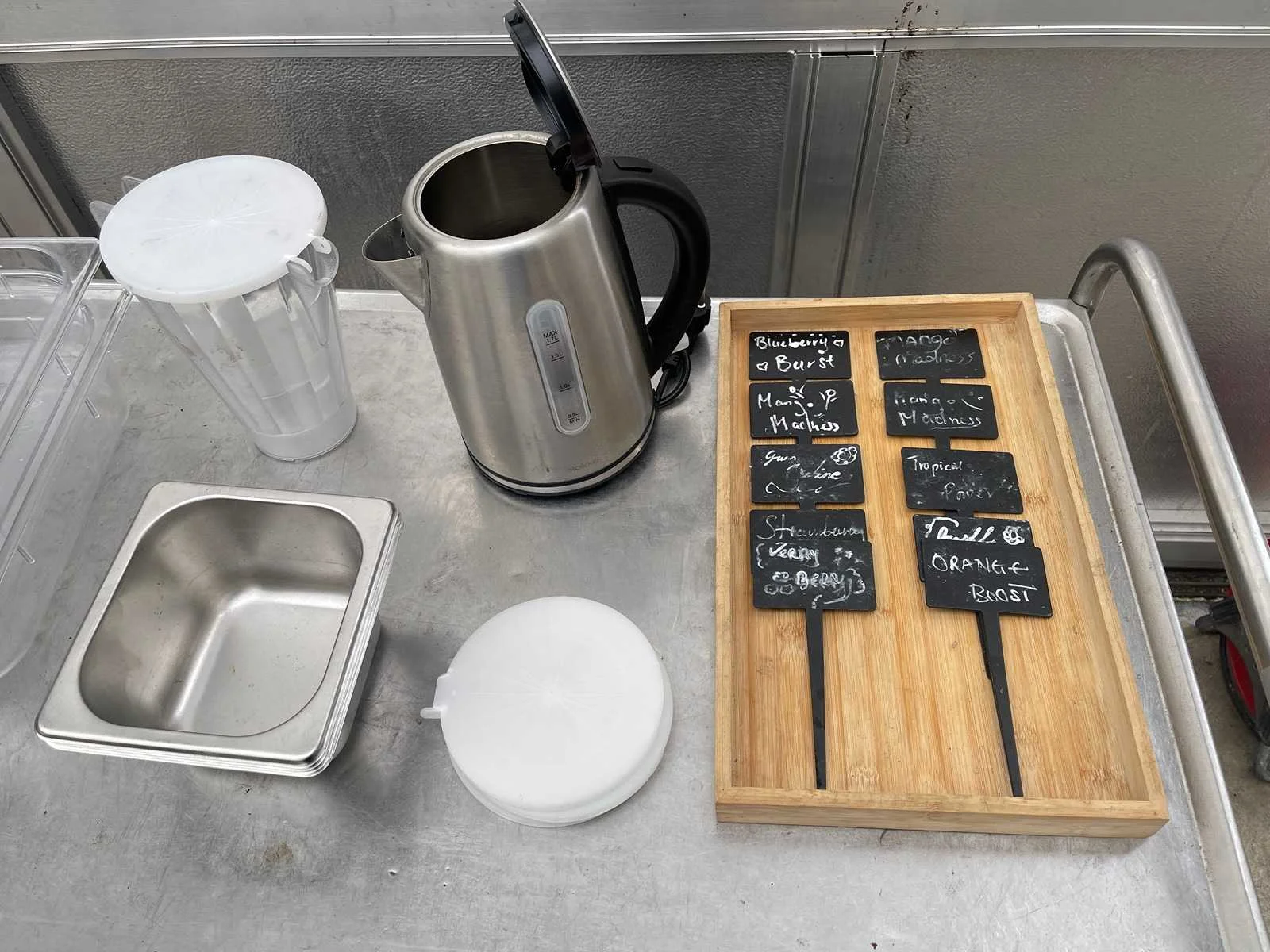 Bestaande uit 2 gastronorm 1/3 GN bakken, 4x 1/6 GN bakken, waterkoker, houten bak , 10 ingredientenkaartjes, maatbeker met deksels