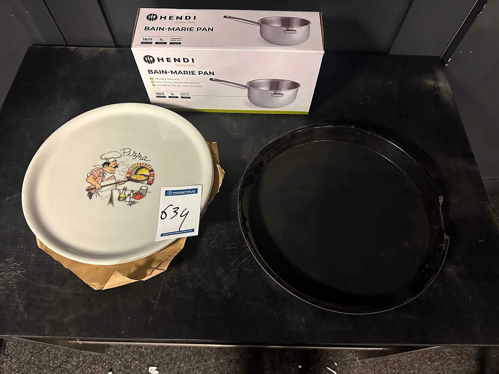 Bestaande uit twee pizza bord met tekening twee pizza bord zonder tekening een dienblad lichte schade een au bain marie pan 330 mm Speciale Merk: Hendi Serienummer: 774847