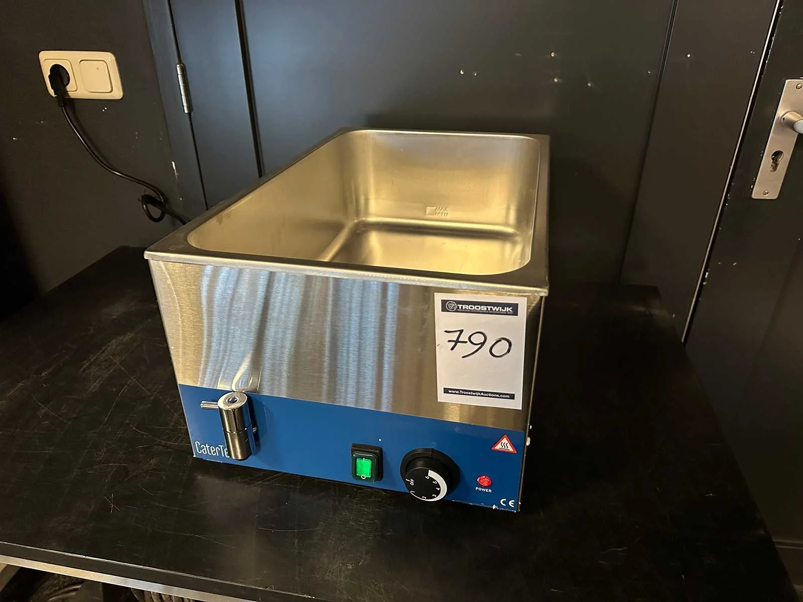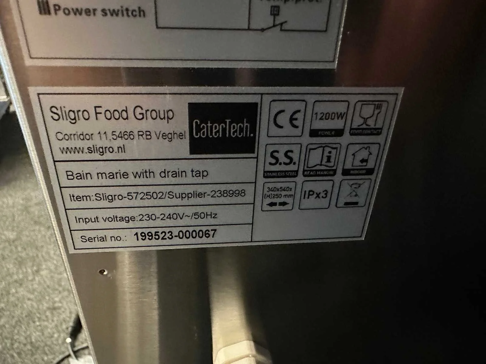 1200W met aftapkraan ; traploos instelbaar tot 85°C 1/1 GN 340x540x250mm Merk: Caterchef Vrijstaand: true Rvs: true Regelbare thermostaat: true Aansluiting: 230V