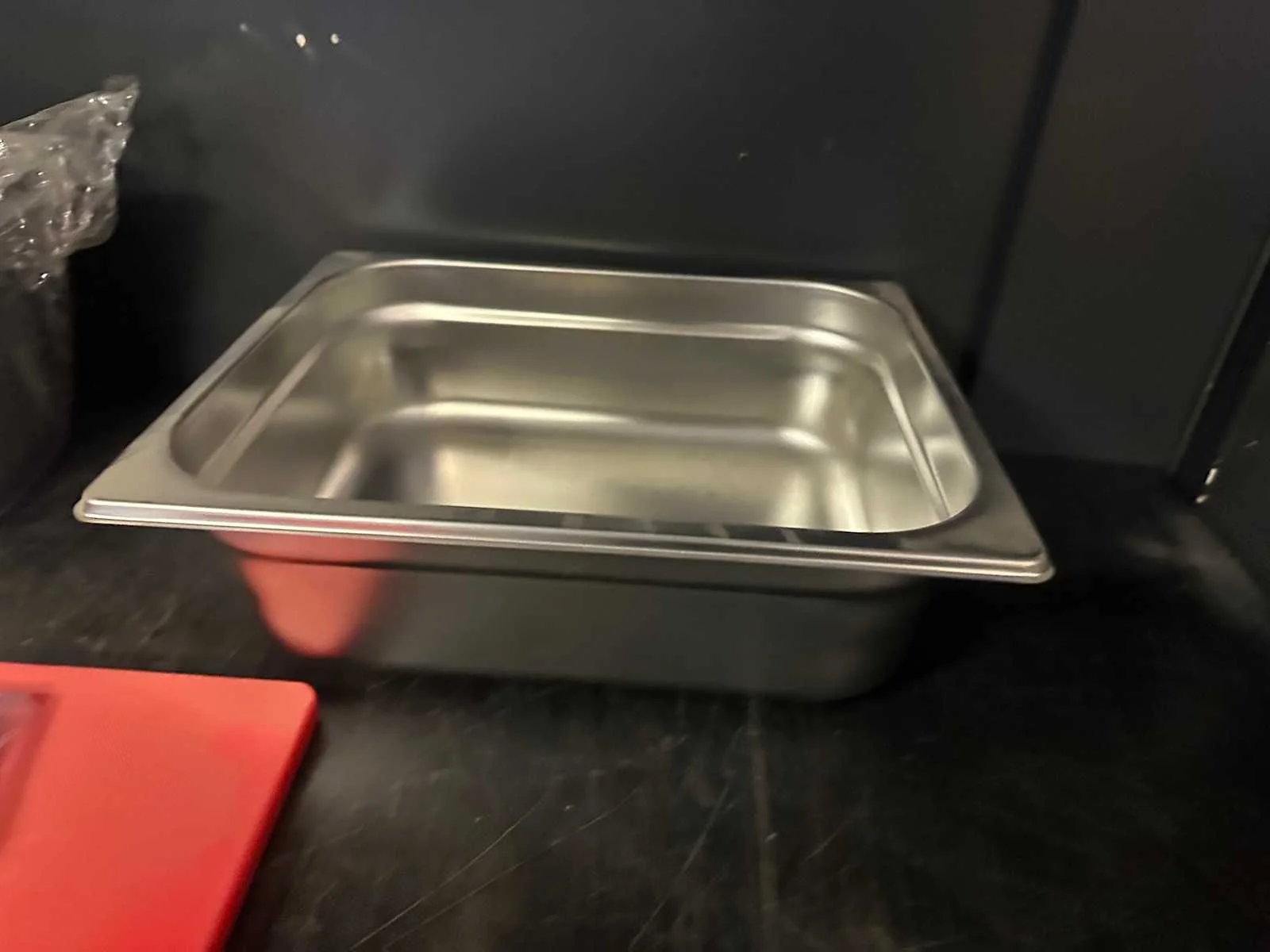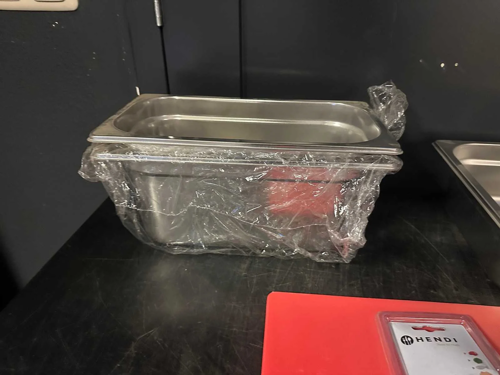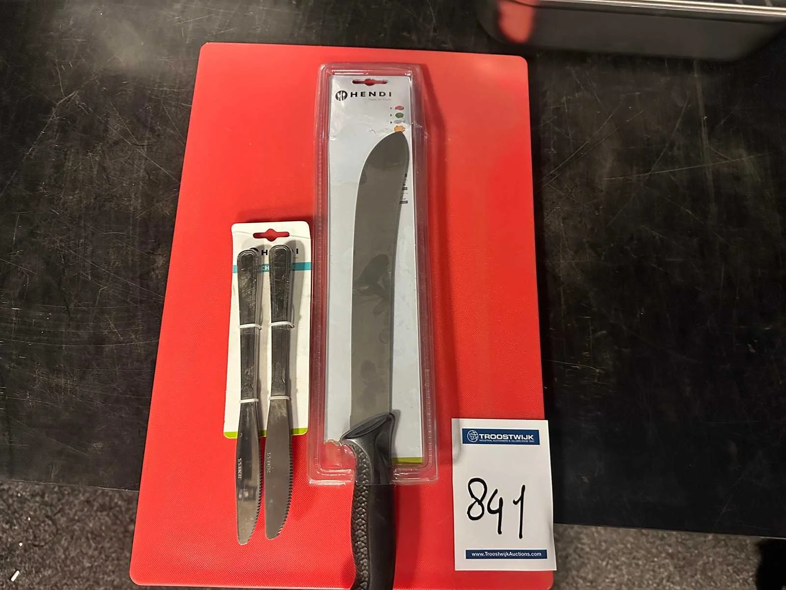 Bestaande uit drie GN bakken een mes een snijplank ; 6 tafelmessen Merk: Hendi Serienummer: 764015
