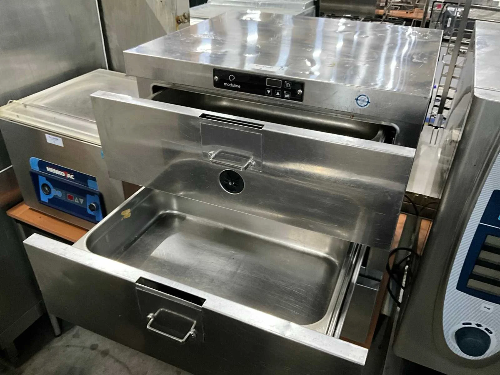 1 kW ; voor 3 x 1/1 GN ; bouwjaar 2017. Merk: Moduline Type: HSW013E Materiaal: rvs Totale afmeting L: 66cm Totale afmeting Breedte: 60cm Totale afmeting Hoogte: 70cm Rvs: true Aansluiting: 230V