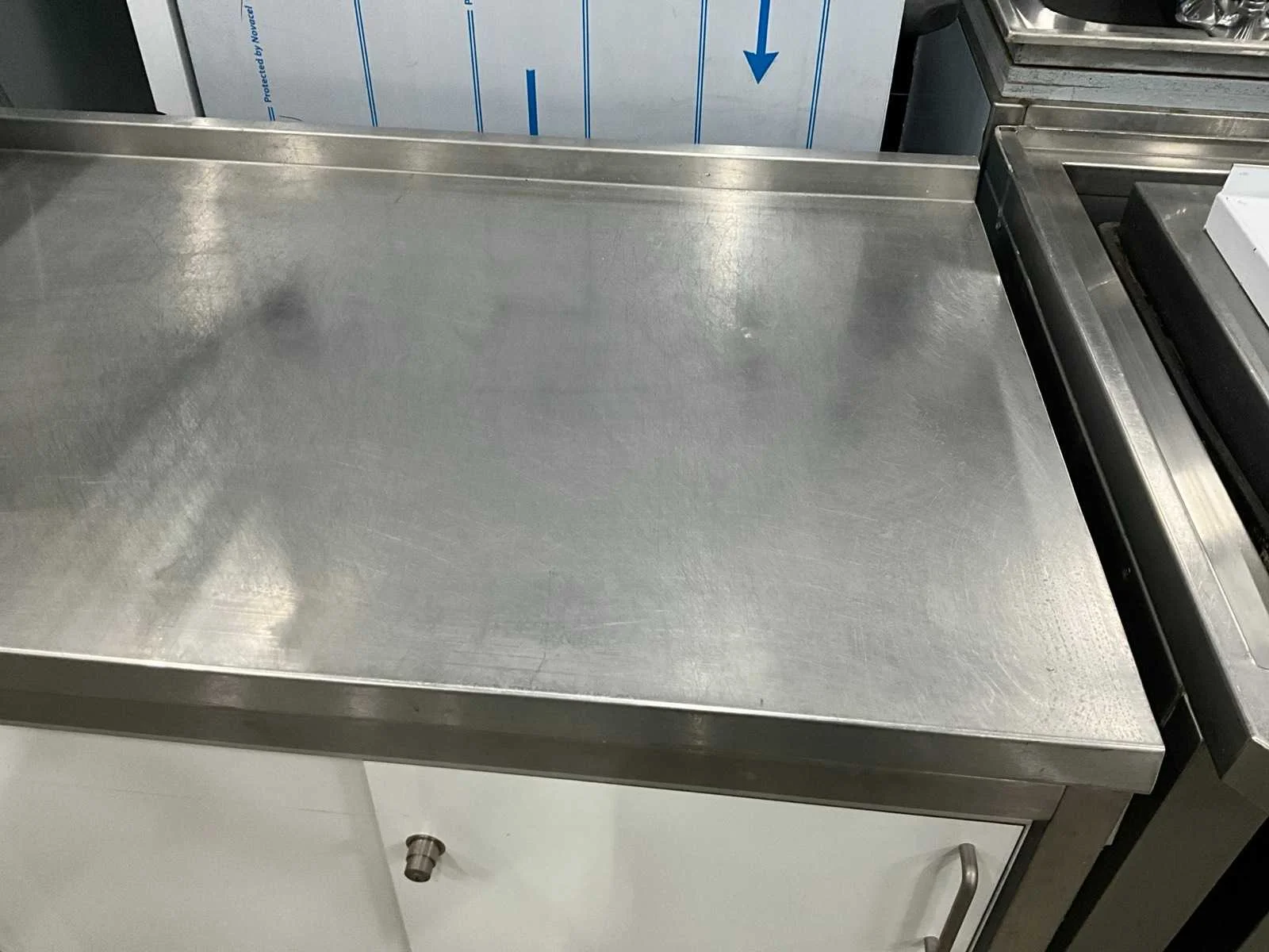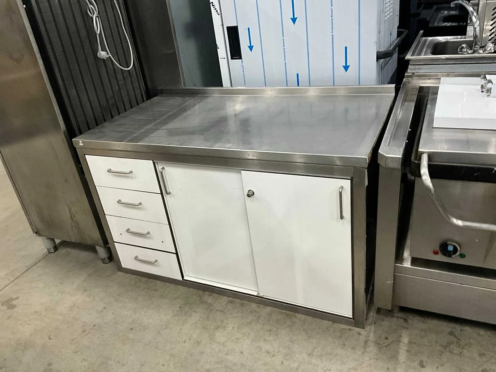 Voorzien volkern kunststof schuifdeuren en 4 lades.; 1 kant van het blad is afgeslepen Totale afmeting L: 1370mm Totale afmeting Breedte: 750mm Totale afmeting Hoogte: 900mm