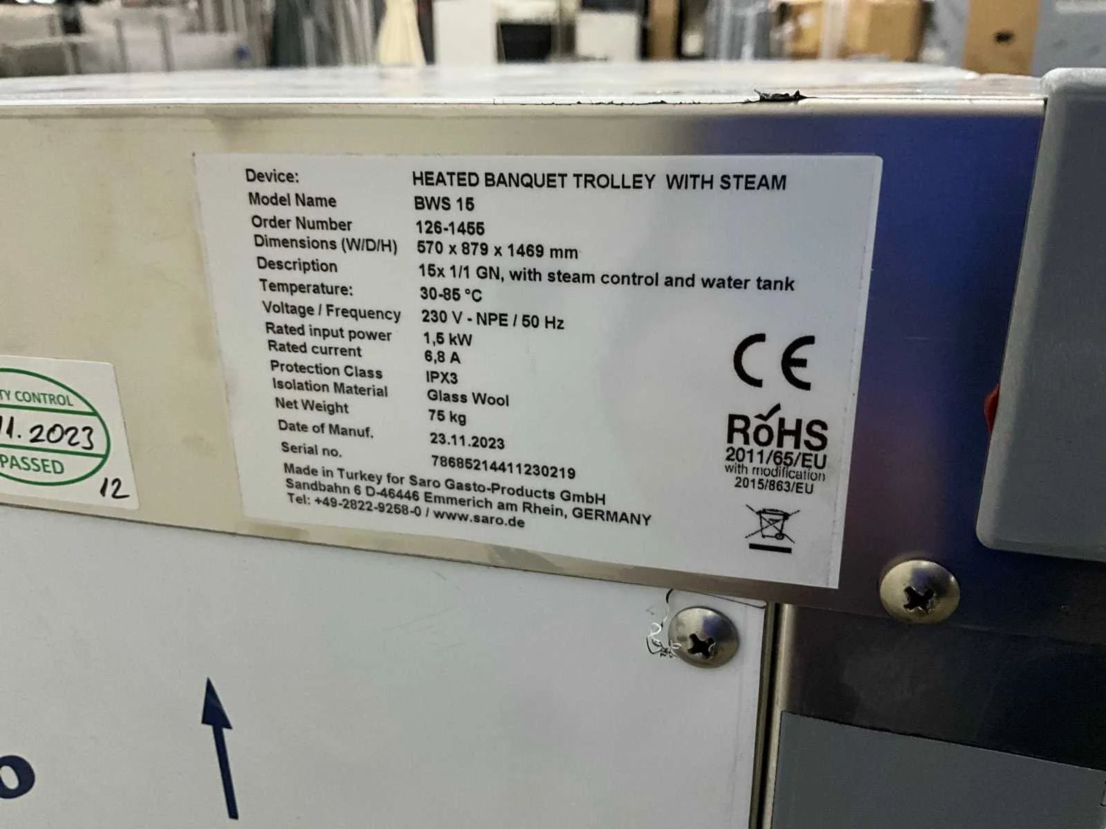 Ongebruikt ; verrijdbaar 1500 watt.; voor 15 x 1/1 gn. Merk: Saro Type: BWS 15 Totale afmeting L: 57cm Totale afmeting Breedte: 90cm Totale afmeting Hoogte: 147cm Rvs: true Mobiel: true Aansluiting: 230V Eigen gewicht: 75kg