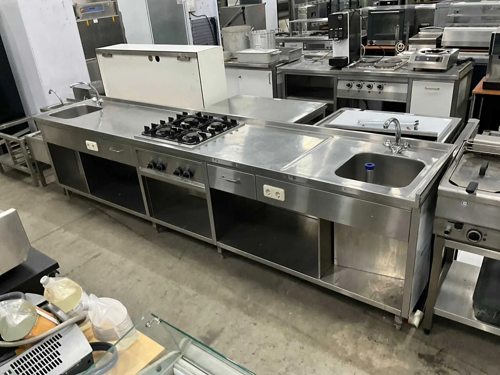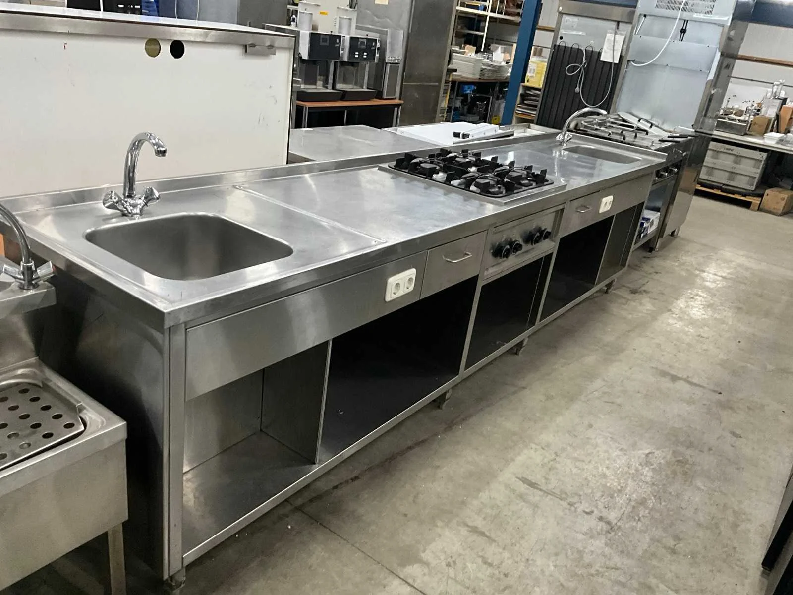 Voorzien van 2 spoelbak met kraan ; 4-pits gasfornuis Materiaal: rvs Totale afmeting Breedte: 359mm Totale afmeting L: 70mm Totale afmeting Hoogte: 90mm