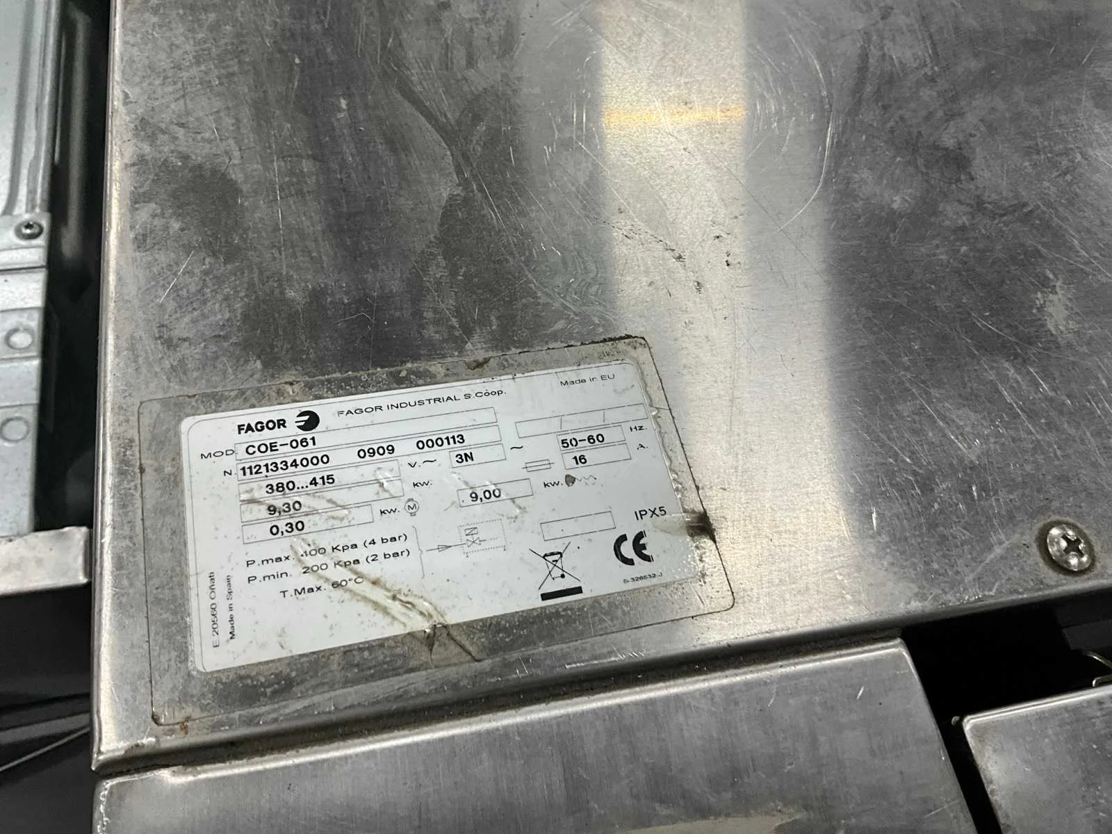 9 kw.; voor 6-laags 1/1 gn. Merk: Fagor Type: COE-61 Aantal niveau's: 6 Vermogen: 9000W Aansluiting: 400V Elektrisch: true Rvs: true Totale afmeting L: 90cm Totale afmeting Breedte: 95cm Totale afmeting Hoogte: 73cm