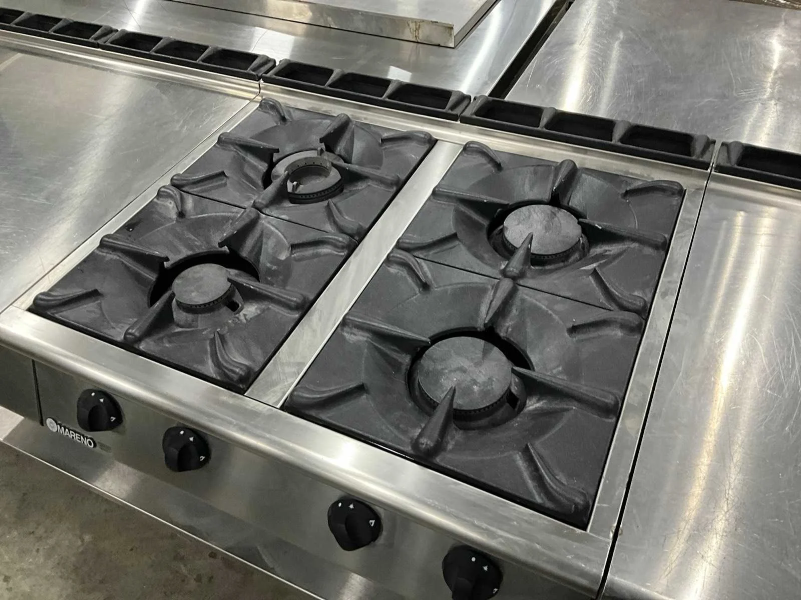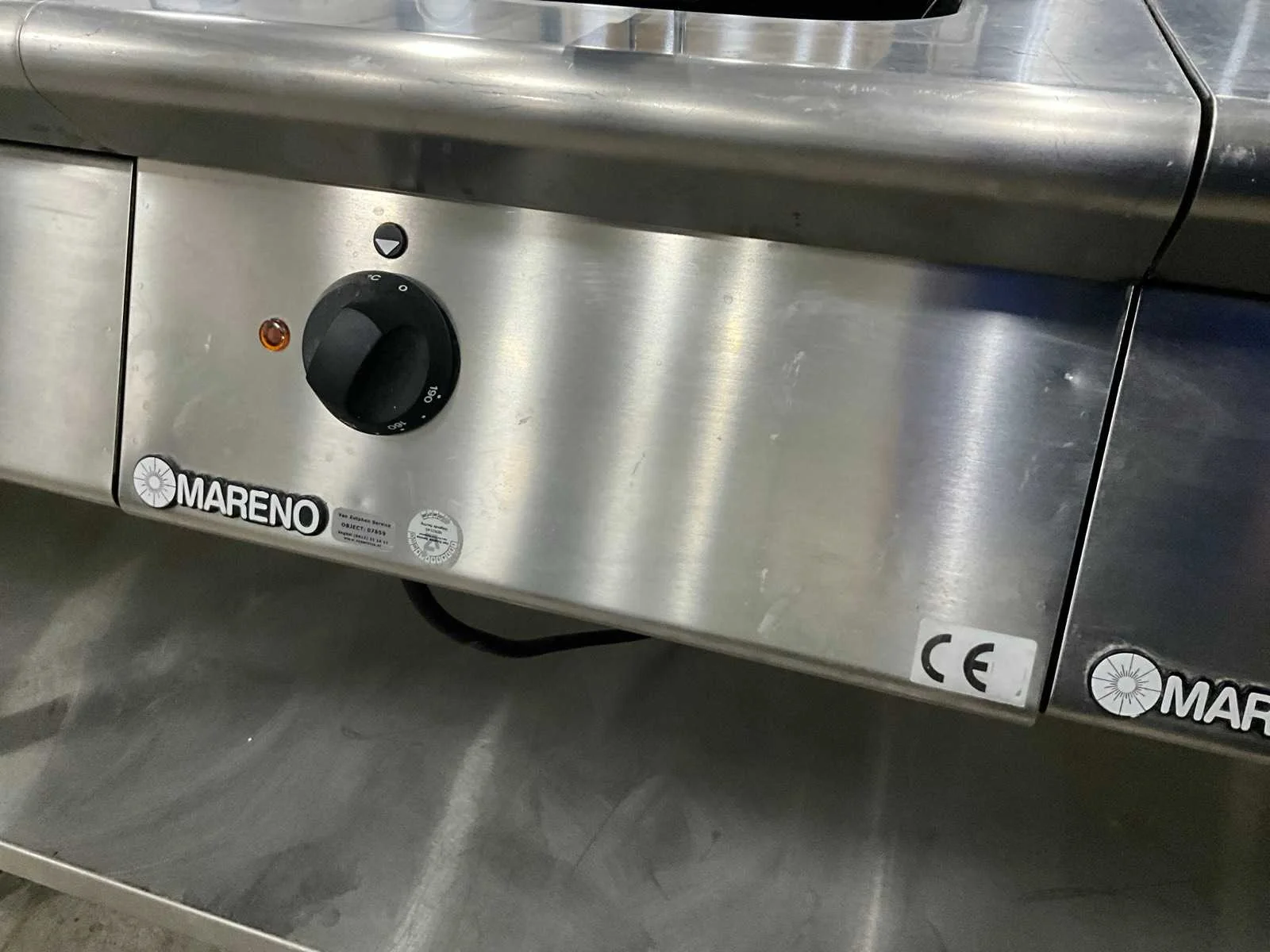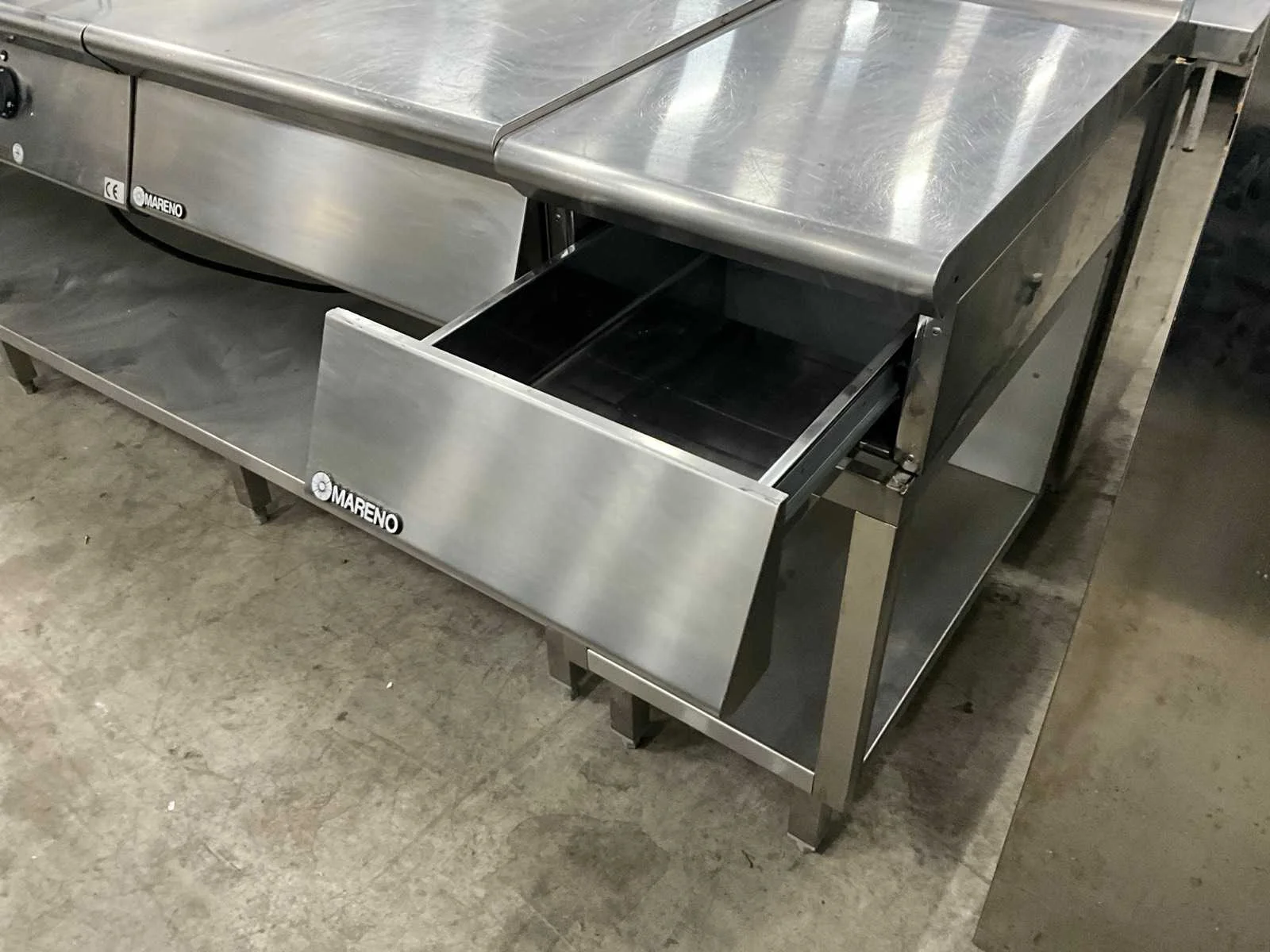 Voorzien van 4-pits gasfornuis en enkele elektrische friteuse; 4 x neutrale unit met lade. Merk: Mareno Model: 07859 Materiaal: rvs Totale afmeting Breedte: 3410mm Totale afmeting L: 750mm Totale afmeting Hoogte: 900mm