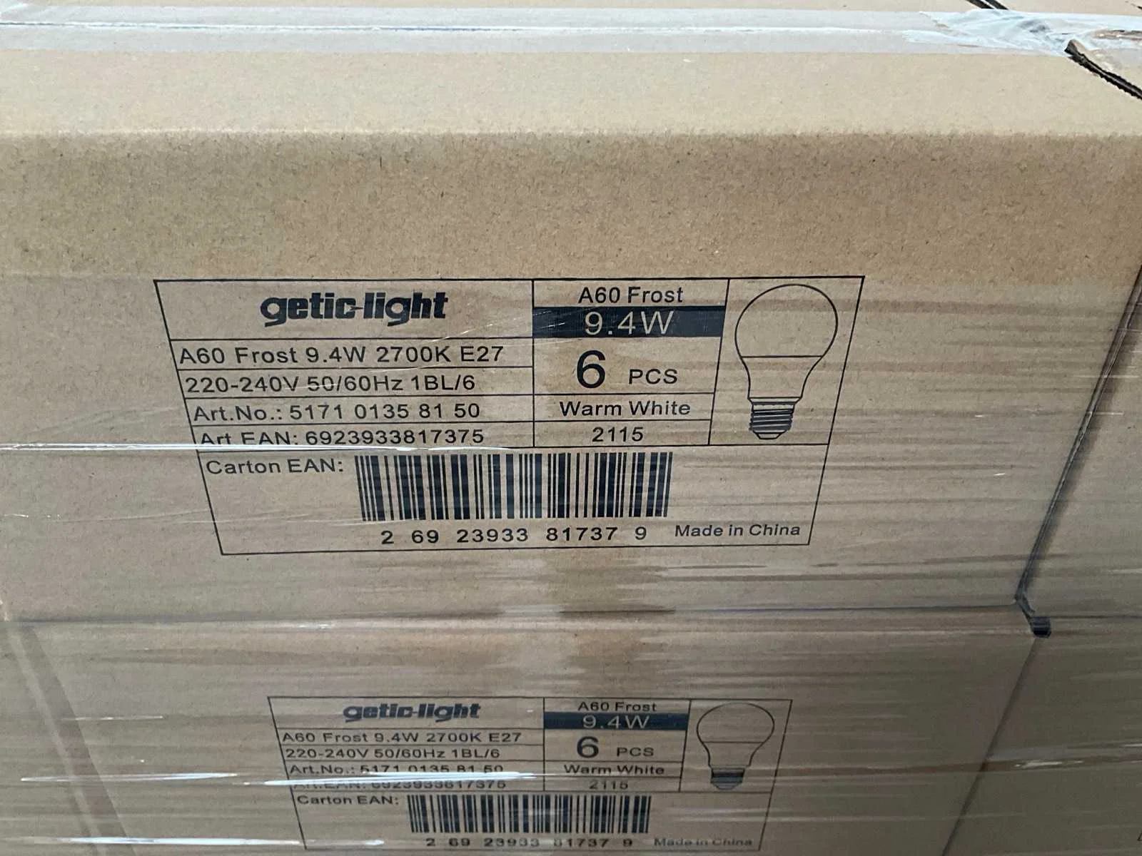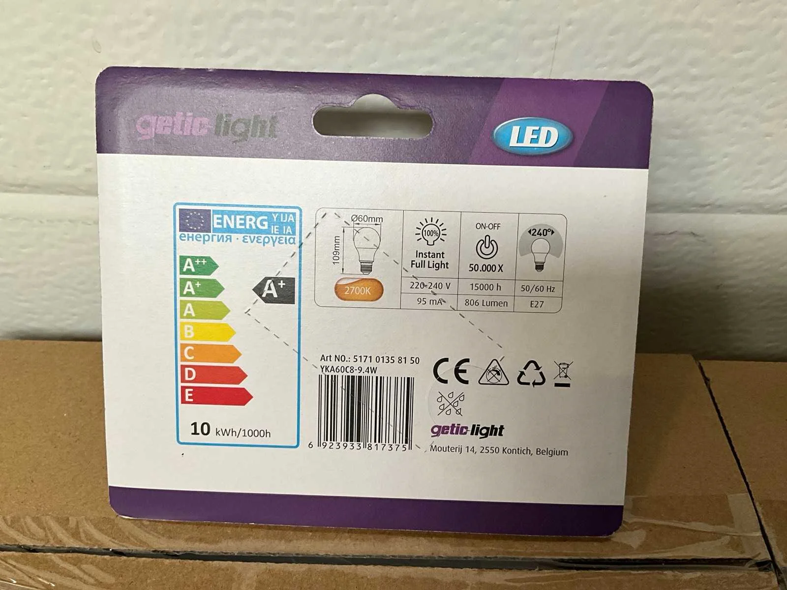 Ongebruikt in originele verpakking. Merk: Getic light Spanning: 240V Kleurtemperatuur: 2700K Lichtopbrengst: 806lm Energielabel: A+ Fitting: E27 Wattage: 9.4W Kleur: Warm Wit Breedte: 6cm Hoogte: 10.9cm