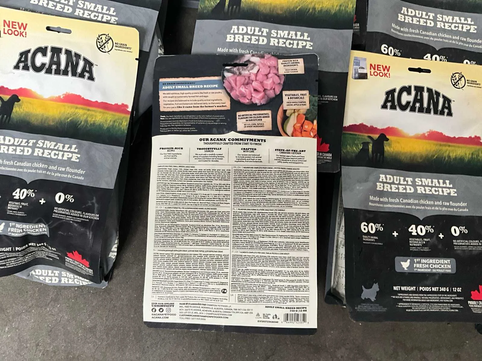 204 zakken van 340 gram. Merk: Acana Model: adult small breed recipe Gewicht: 0.34kg
