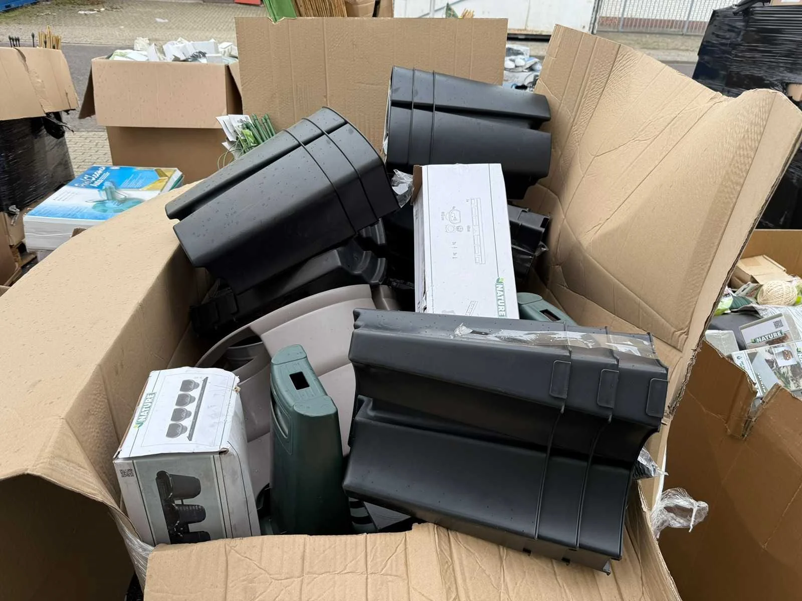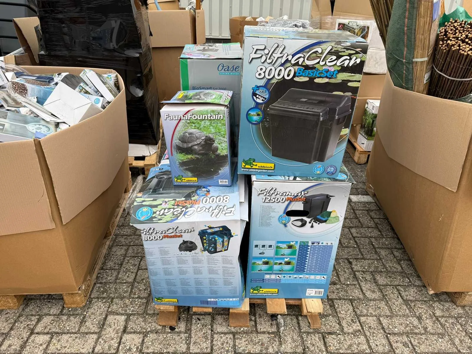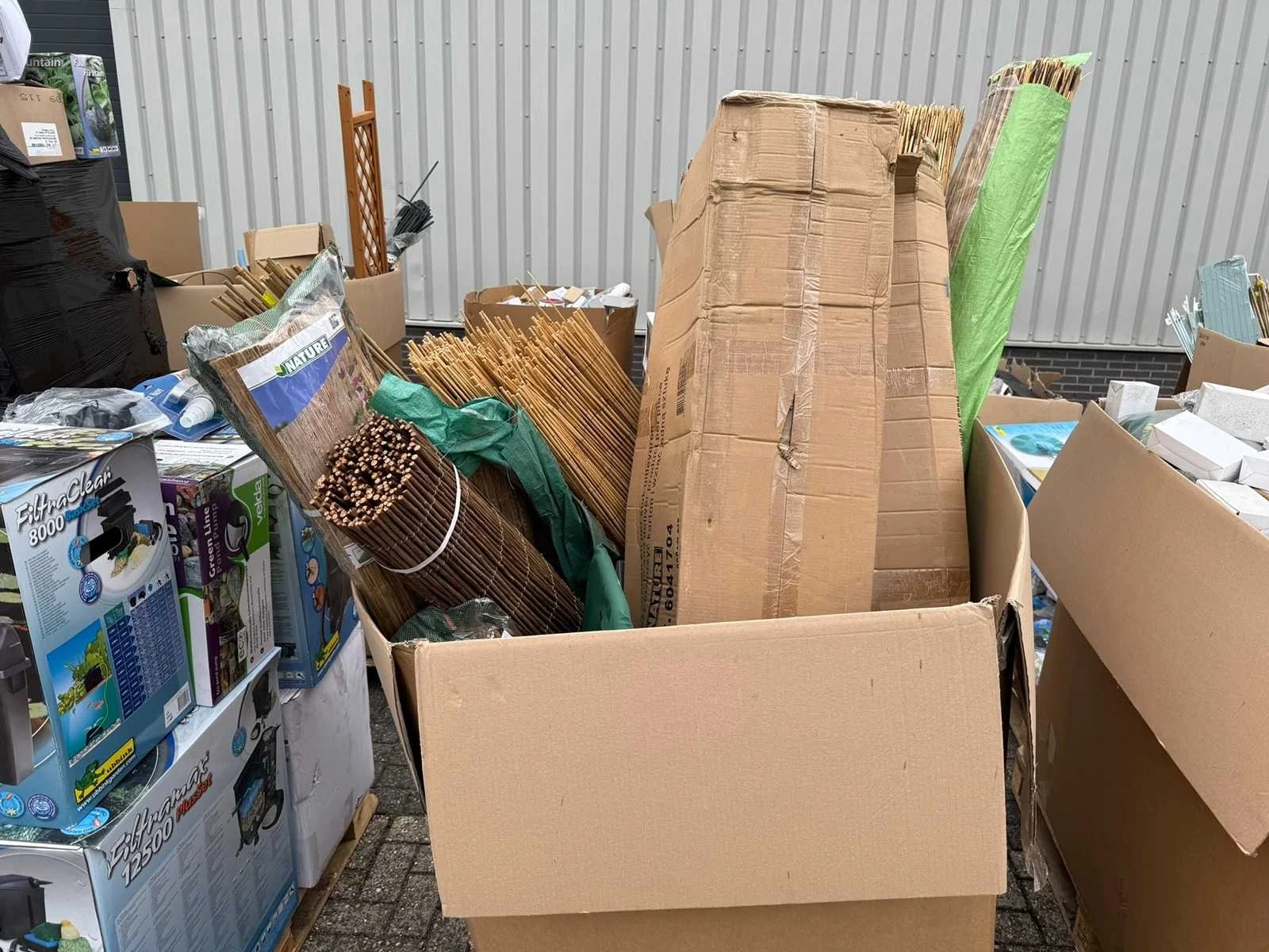 Partij bevat onder andere; Vijverpompen, Vijverfolie, Overige Vijver Benodigdheden, Tuinafscheidingen, Koppelingen, Gieters, Zwembad Stofzuigers, kweekbakken, Tuingereedschap. Partij Bestaat uit 20 europallet. Grootste gedeelte bestaat uit ongebruikte goederen, resterend gedeelte uit showroom modellen en klein beetje retourgoederen.