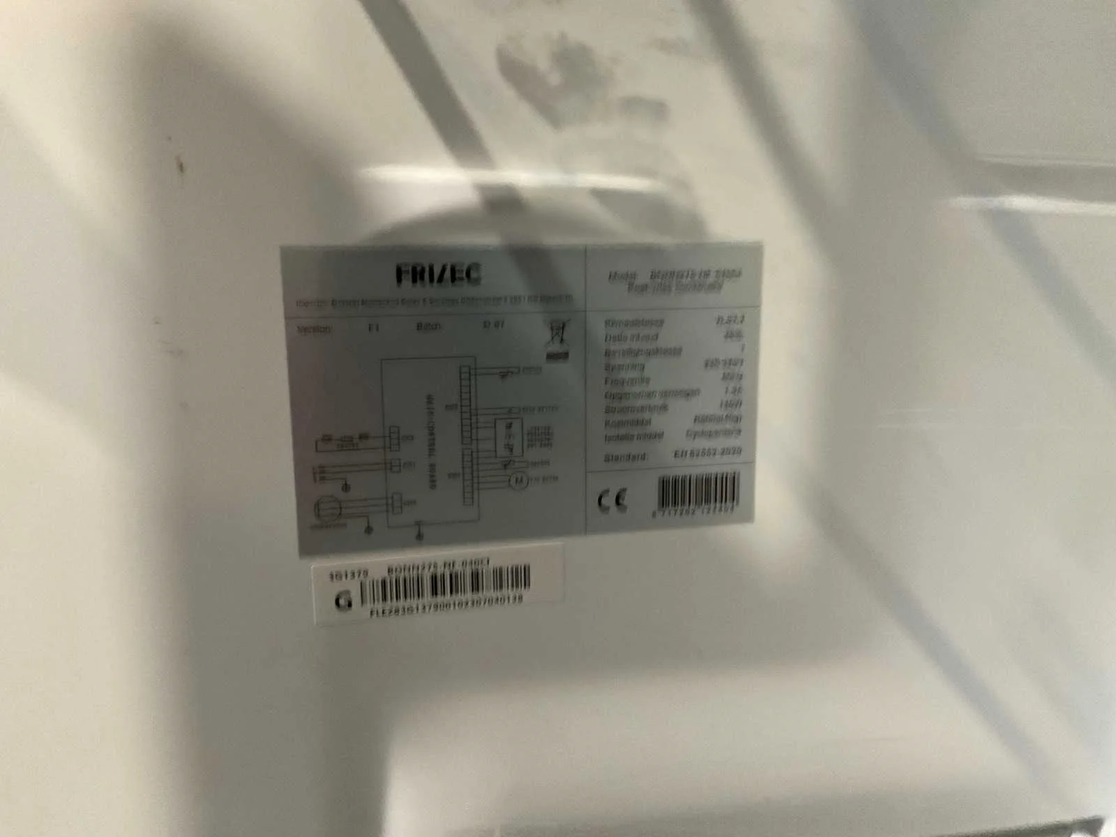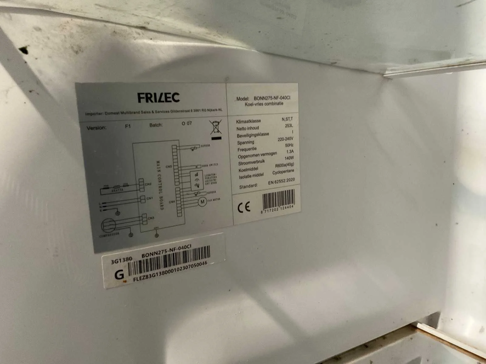 Dit betreffen retourgoederen. Merk: Frizec Model: BONN275-NF-040CI Netto inhoud koelvakken: 182l Netto inhoud Vriesvak: 71l Totaal netto inhoud: 253l Volume: 39dB Energielabel: C Plaats vriesvak: Onder Spanning: 240V Kleur: RVS Gewicht: 60kg Lengte: 60cm Breedte: 54cm Hoogte: 180cm