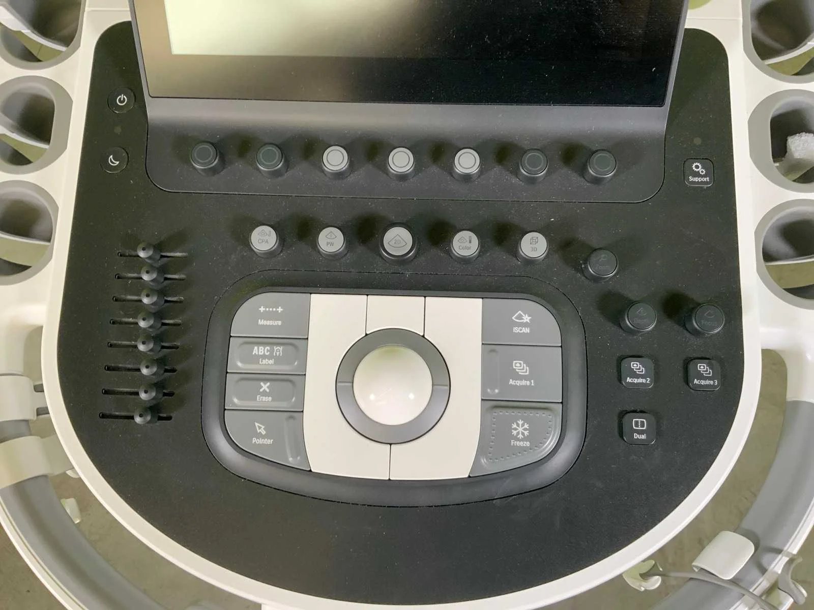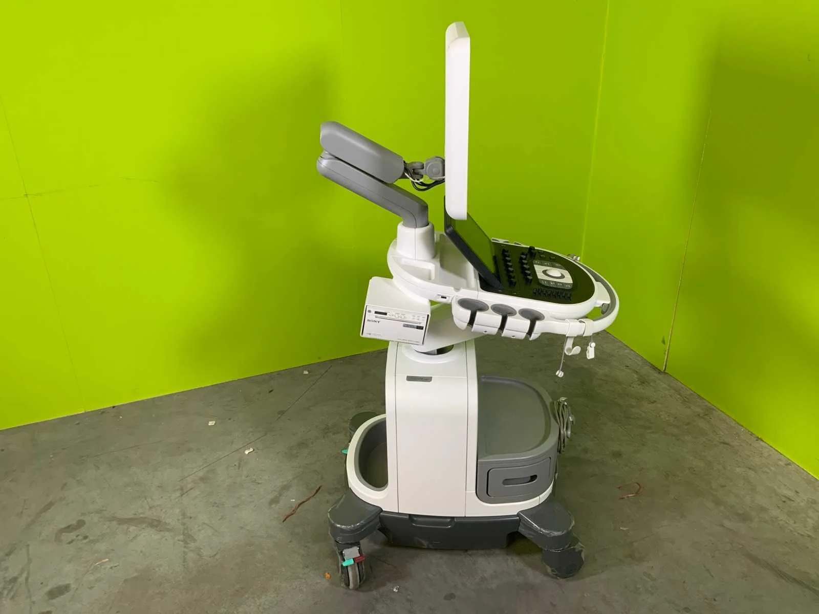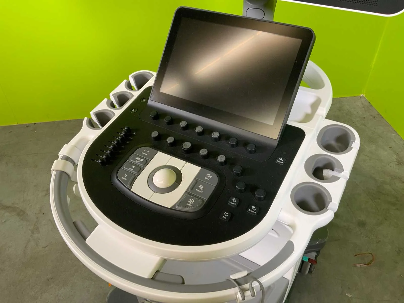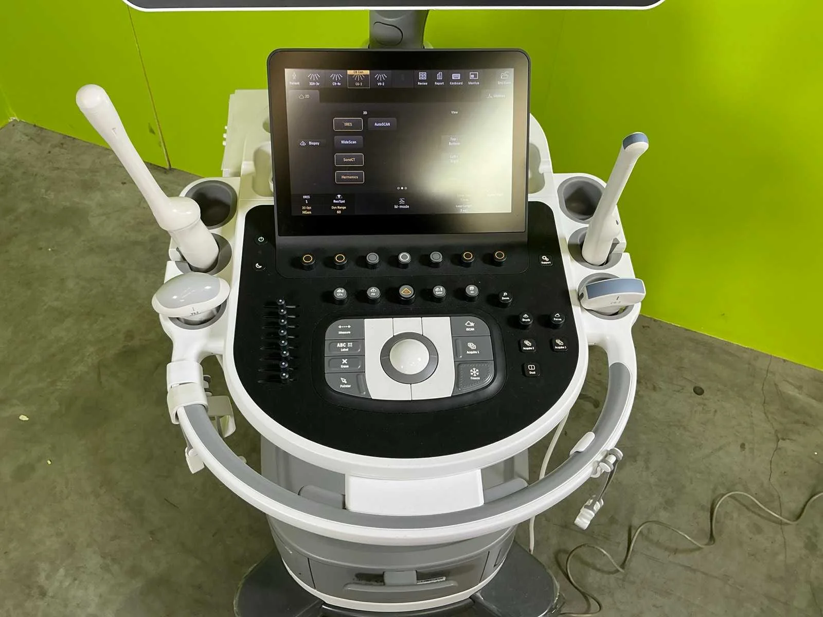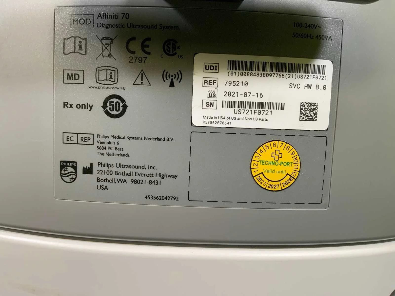 Voorzien van 5 transducers, 21" full optie scherm, 3D9-3V (3D, 4D endovaginal), C5-1 (Breedband abdominaal, 5-1 MHz), C6-2 (Abdominaal, curved sonde 6-2 MHz), C9-4V (Endovaginaal breedband, 9-4 MHZ, beeld van 181 graden), V9-2 (Abdominaal lichtgewicht 2, 3 en 4D) Merk: Philips Type: Affiniti 70W Bouwjaar: 2021 Serienummer: US721F0721 Aansluiting: 230V