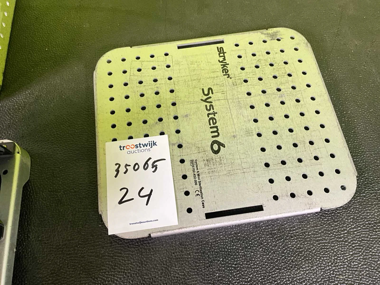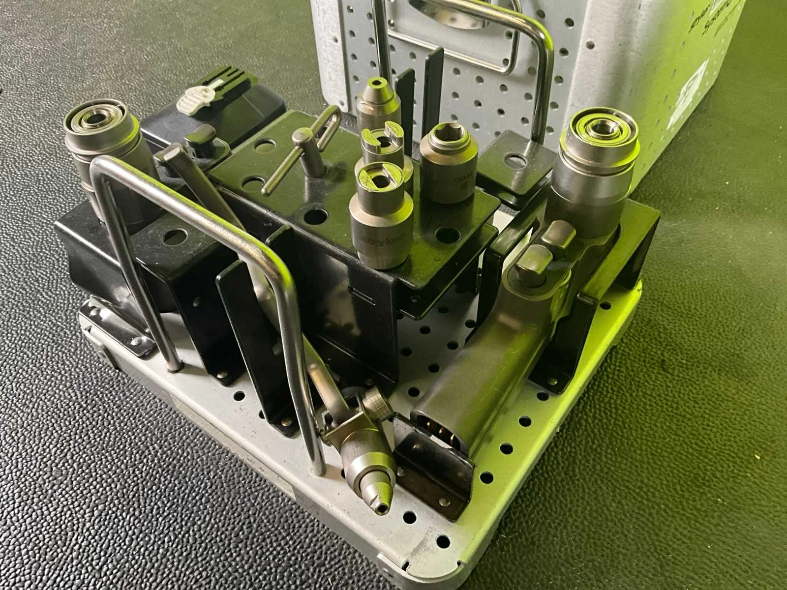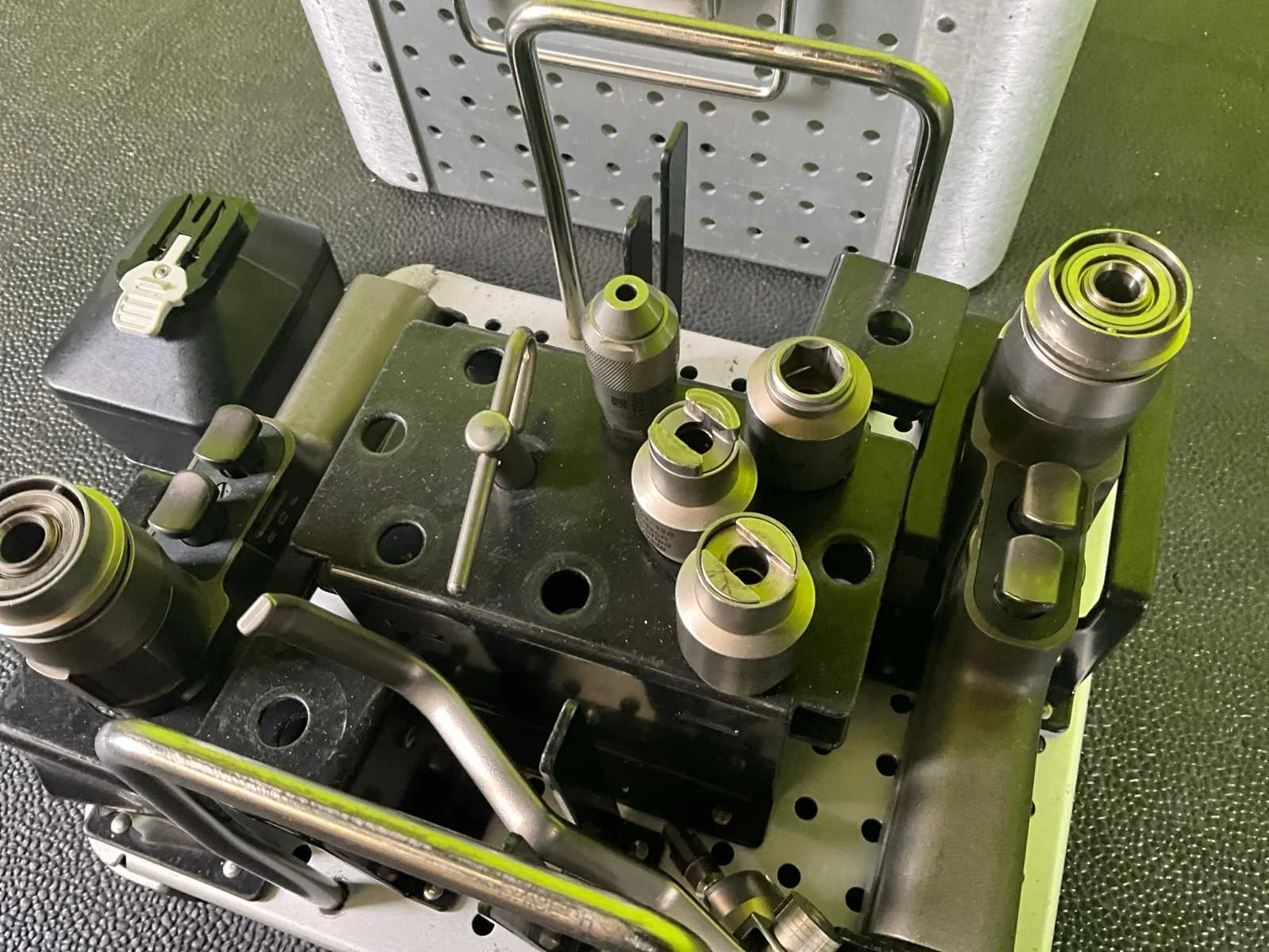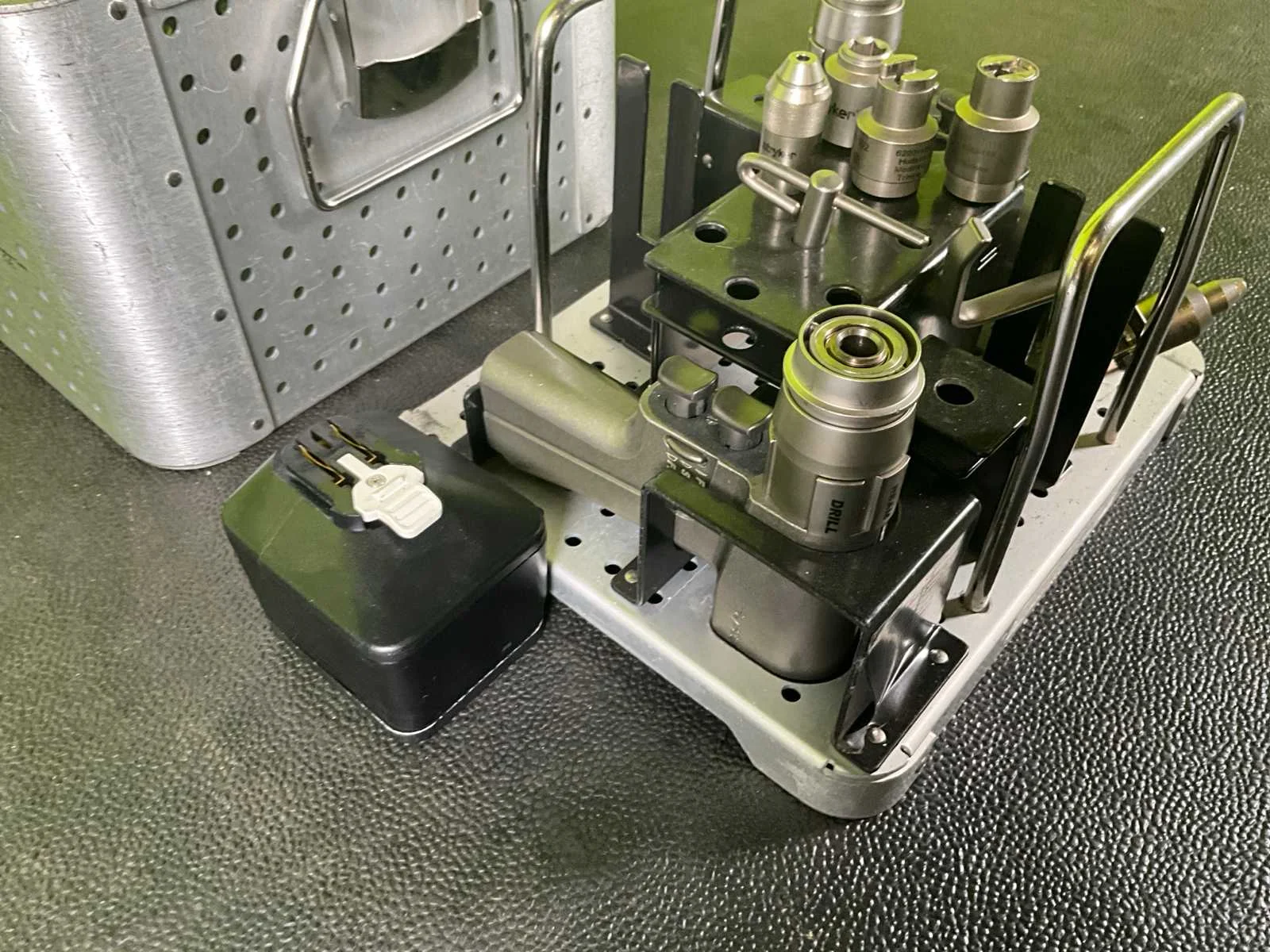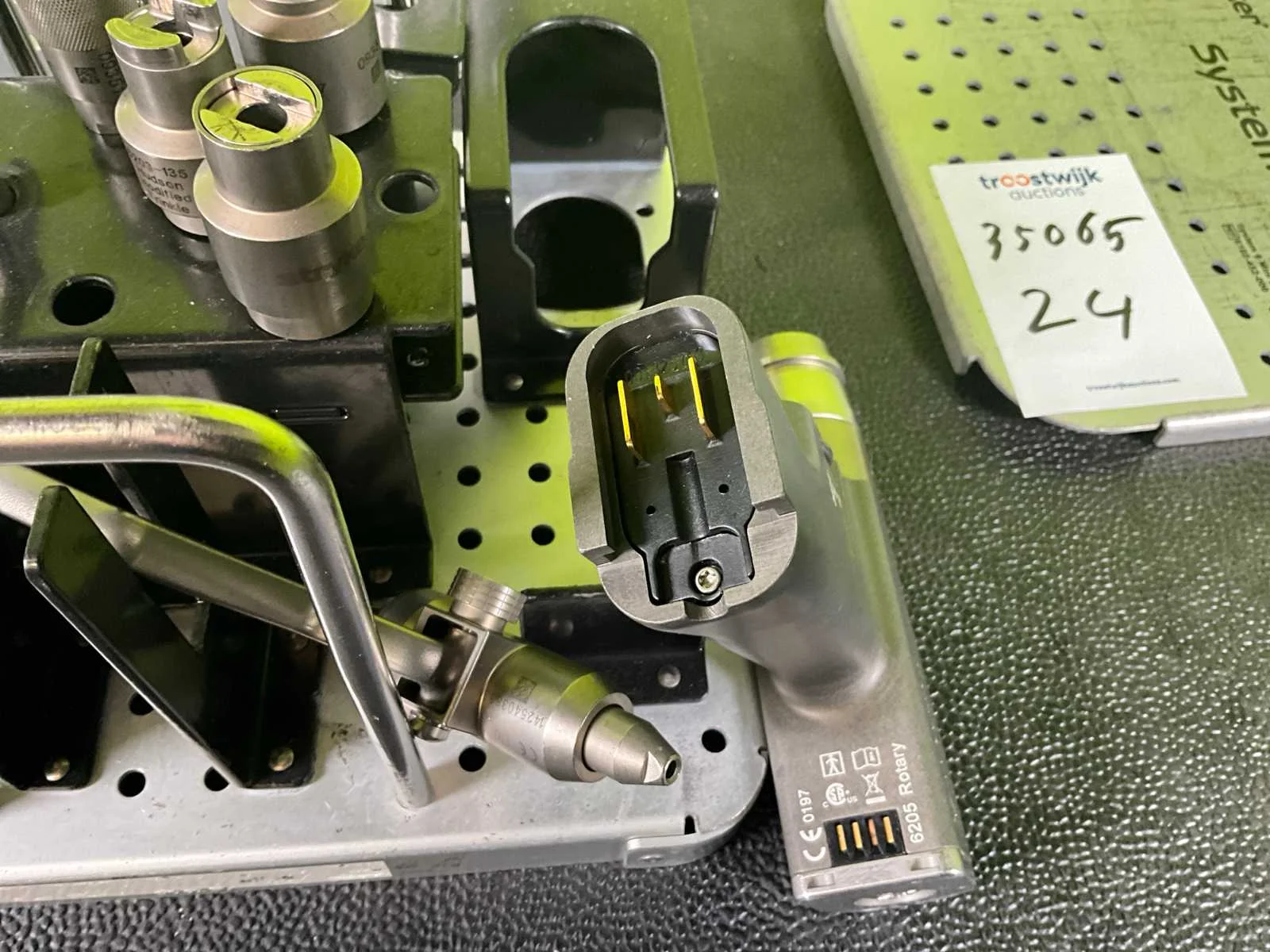 2x elektrisch dubbel knop boor, 5 opzet stukken, 1x batterij houder, in sterilisatie bak Merk: Stryker Type: System 6