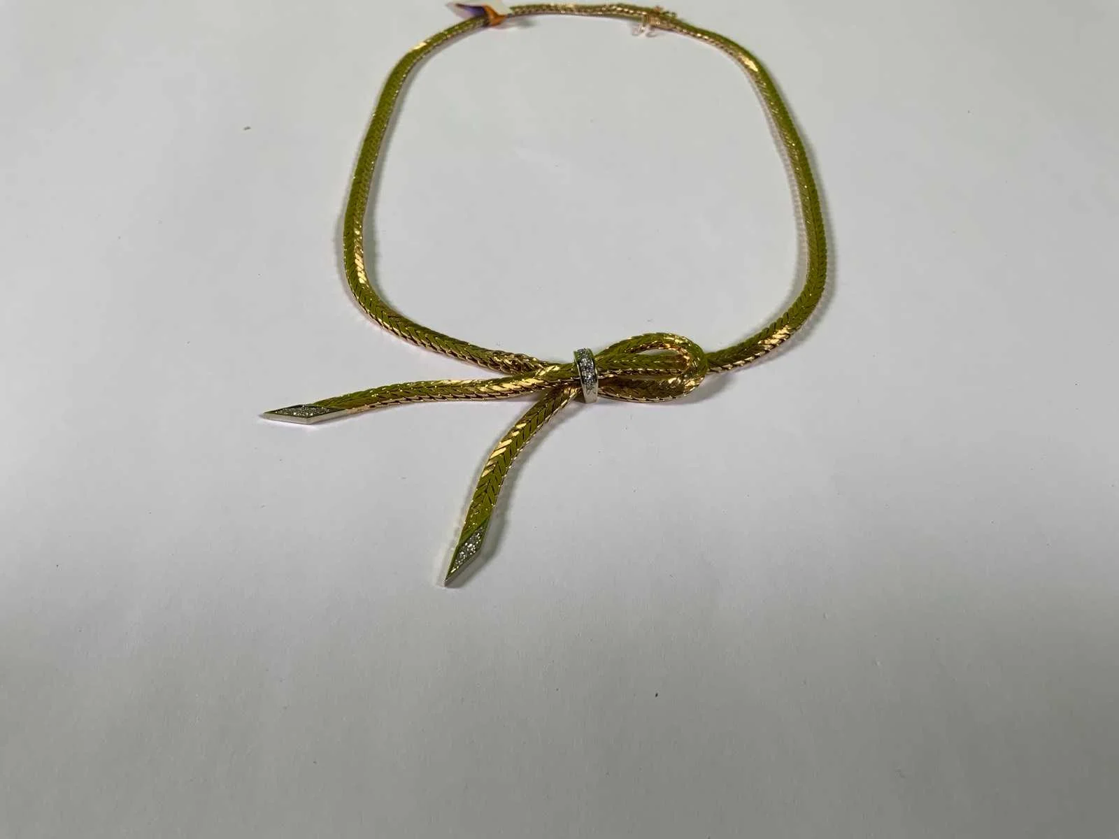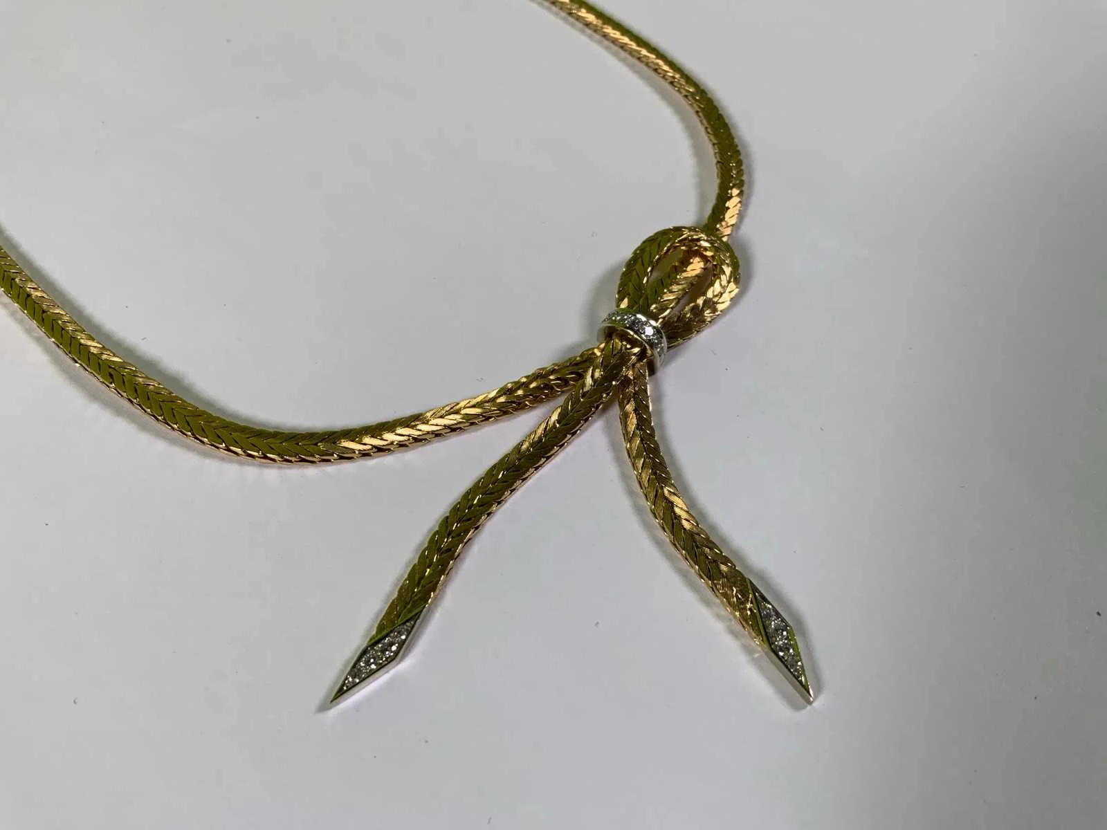 In het midden een knoopvorm met witgouden ornamenten, bezet met briljant en achtkante geslepen diamanten, (750/000) 40 gr Product type: 18 krt geelgouden collier