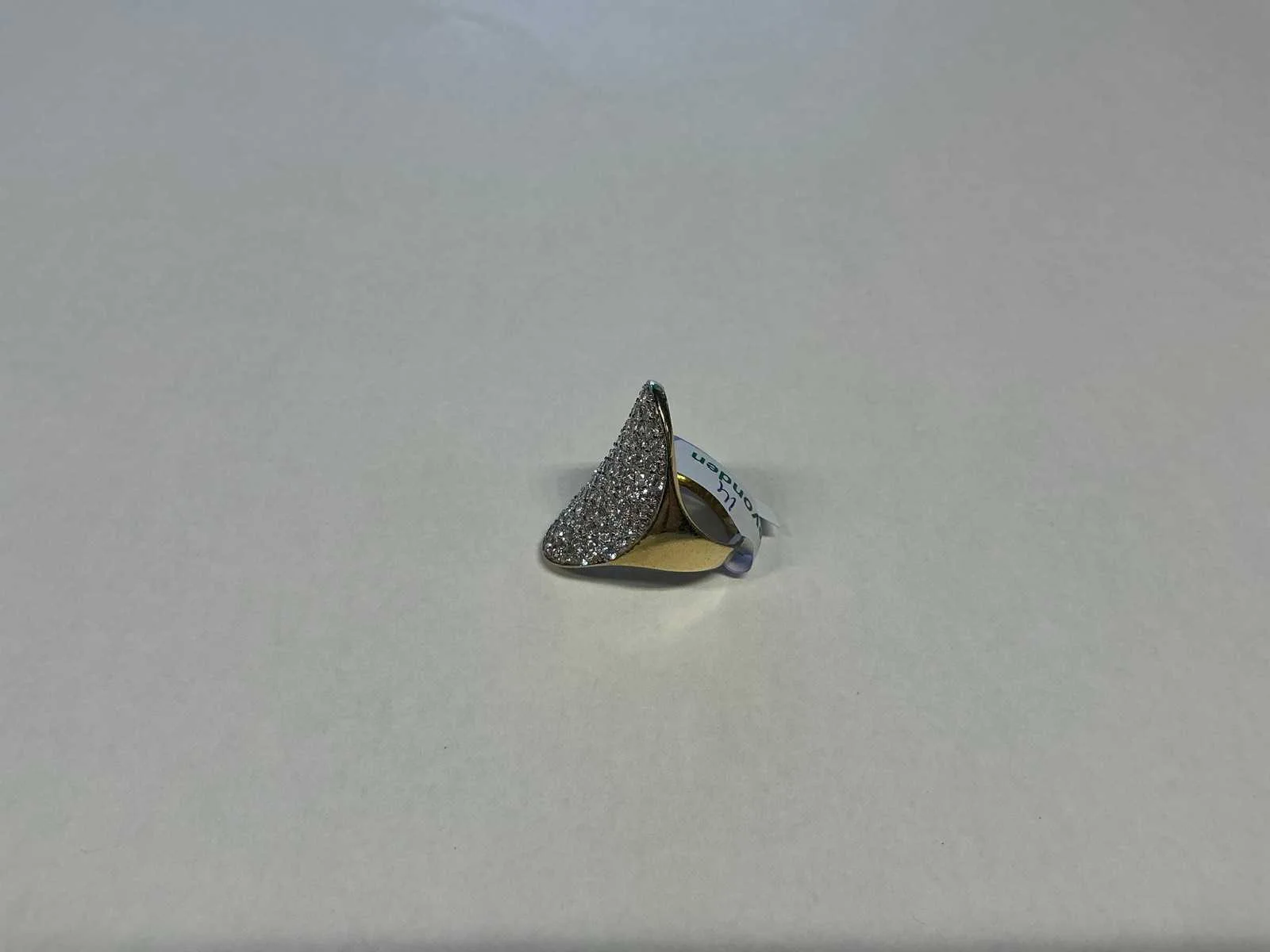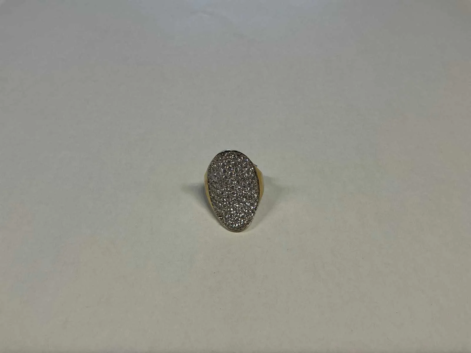 Een 14 karaats (585/000) wit- en geelgouden ring, ovale grove kop, geheel bezet met zirkonia's (mist één). Bruto gewicht: 7,1 gram Product type: 14 krt wit- en geelgouden ring