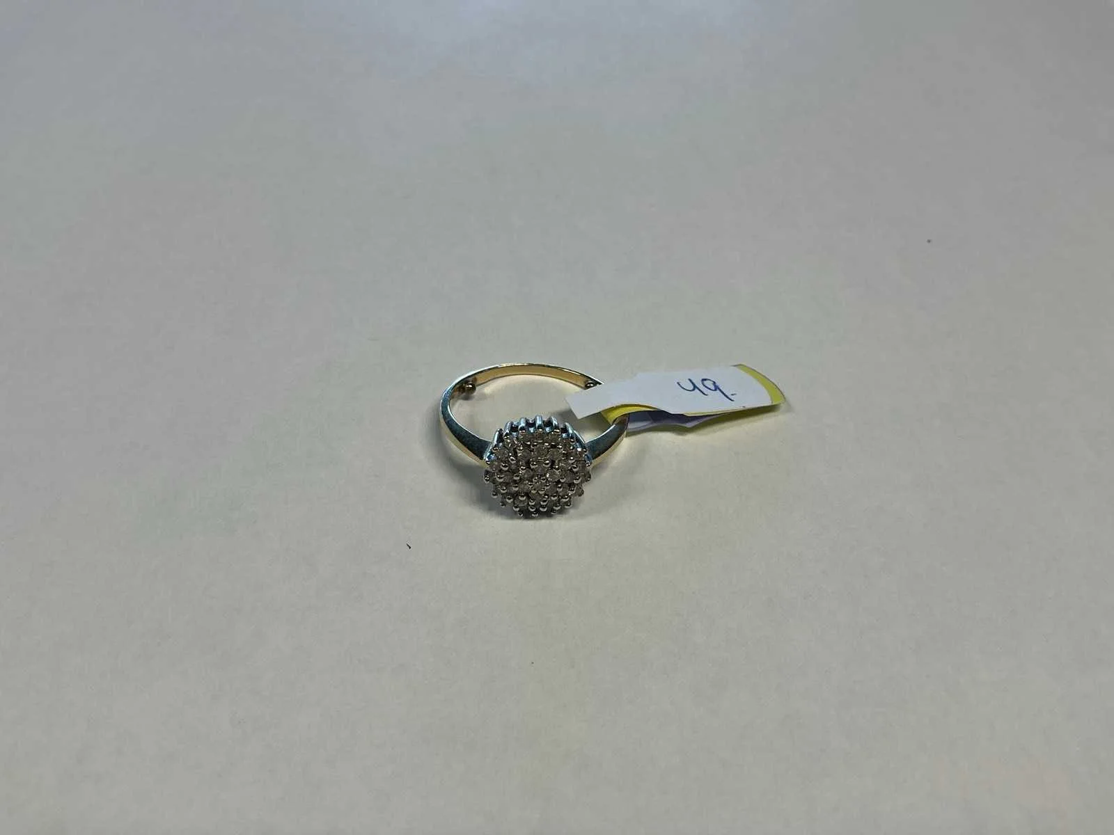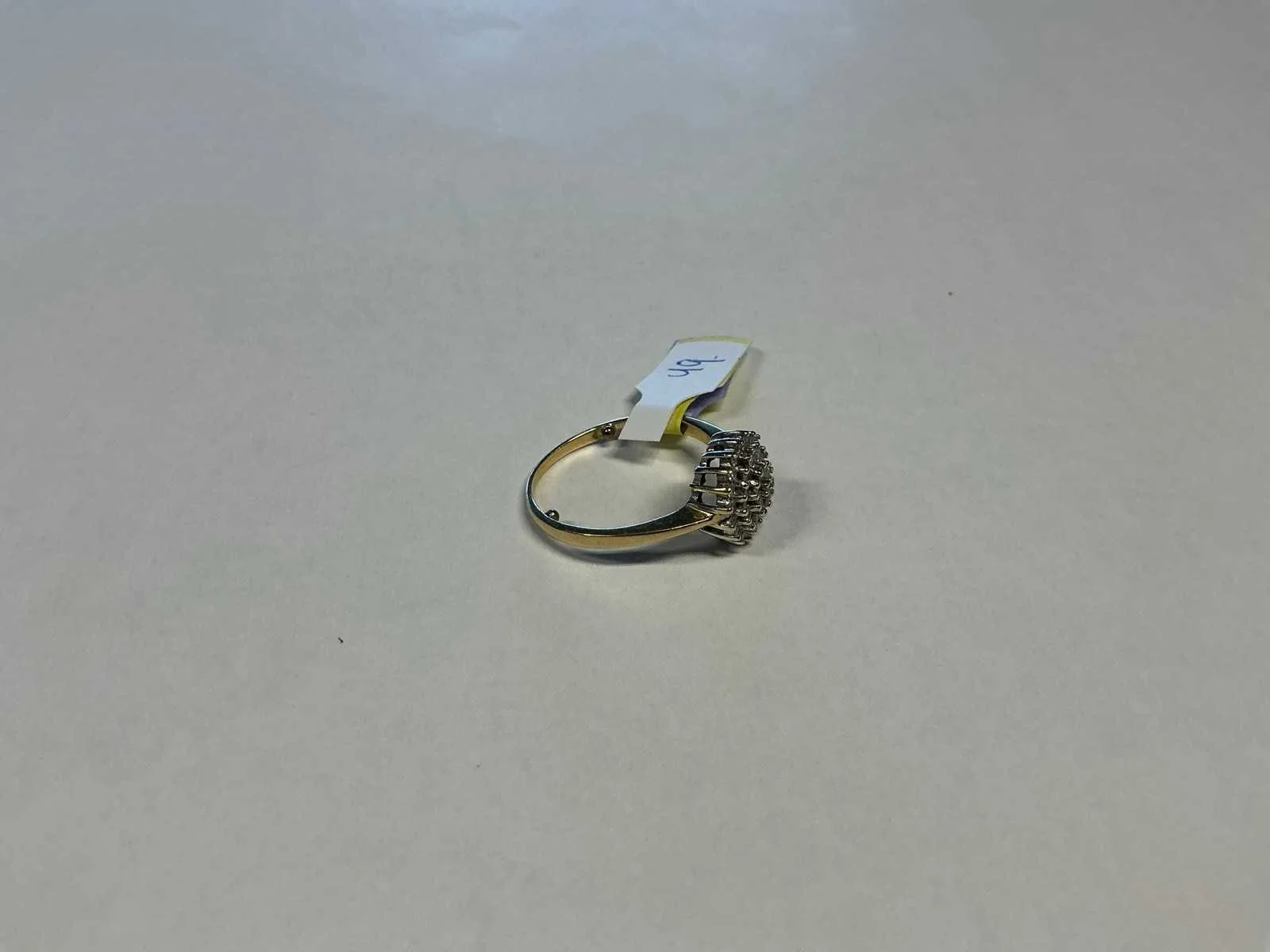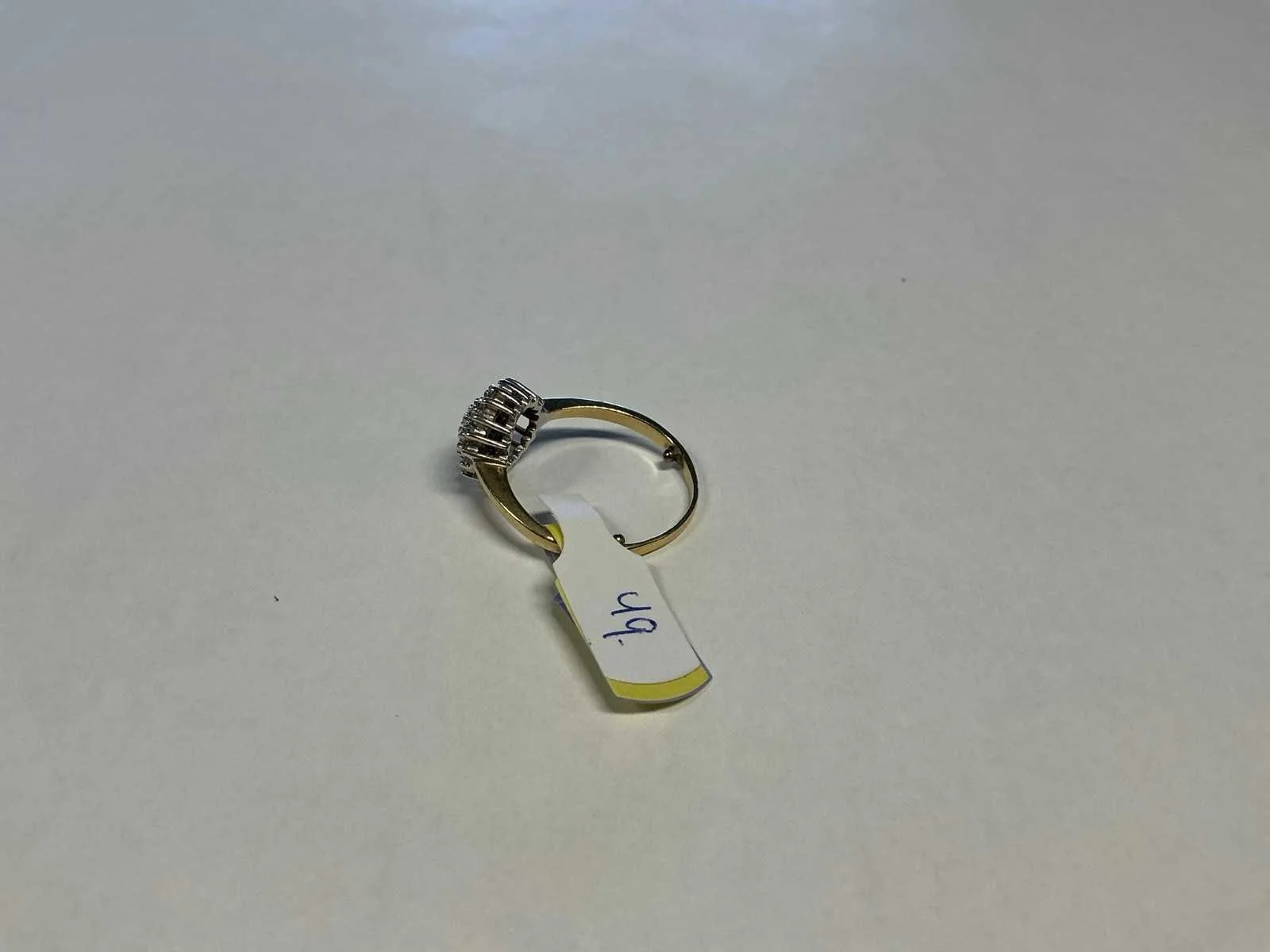 Een 14 karaats (585/000) wit- en geelgouden rozetring, bezet met kleine briljant geslepen diamanten. Bruto gewicht: 3,5 gram. Product type: 14 krt wit- en geelgouden