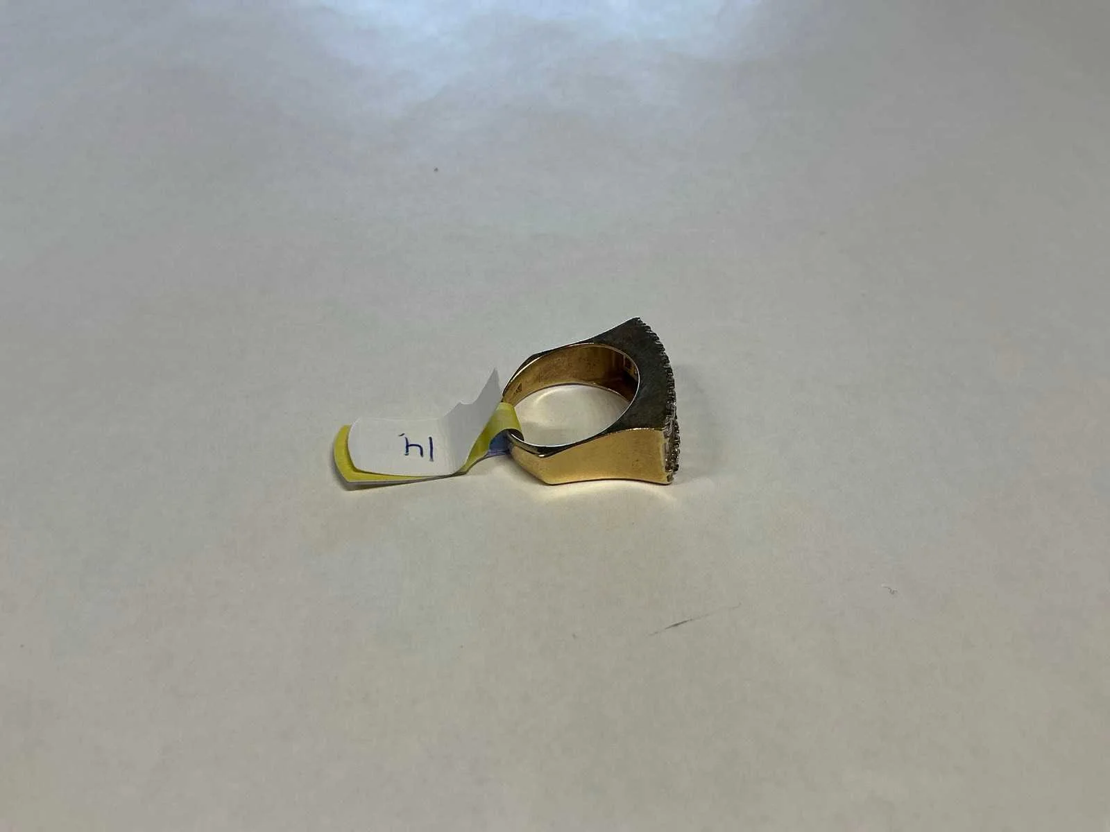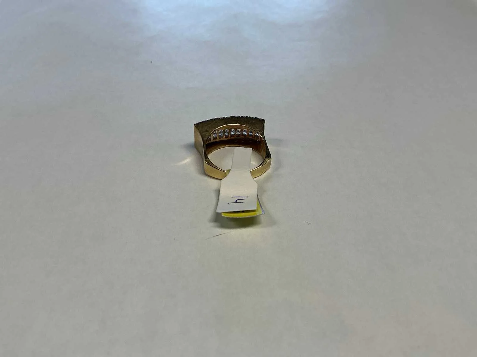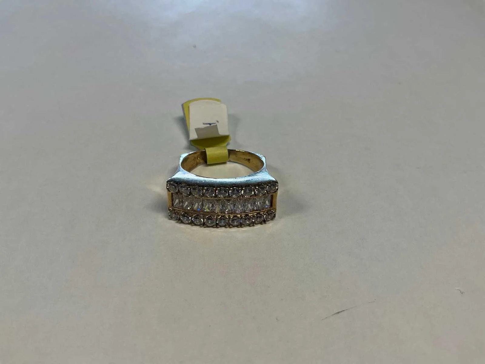 Een 14 karaats (585/000) geelgouden rijring bezet met zirkonia's. Bruto gewicht: 7,4 gram. Product type: 14 krt geelgouden