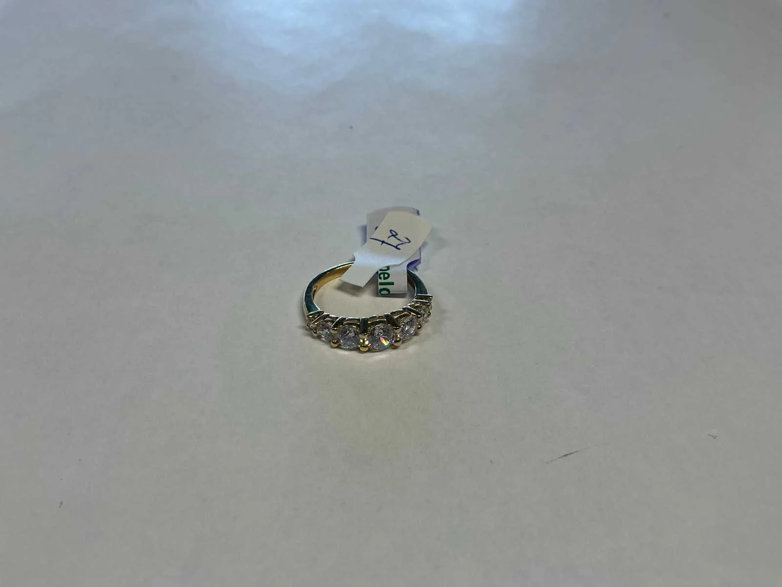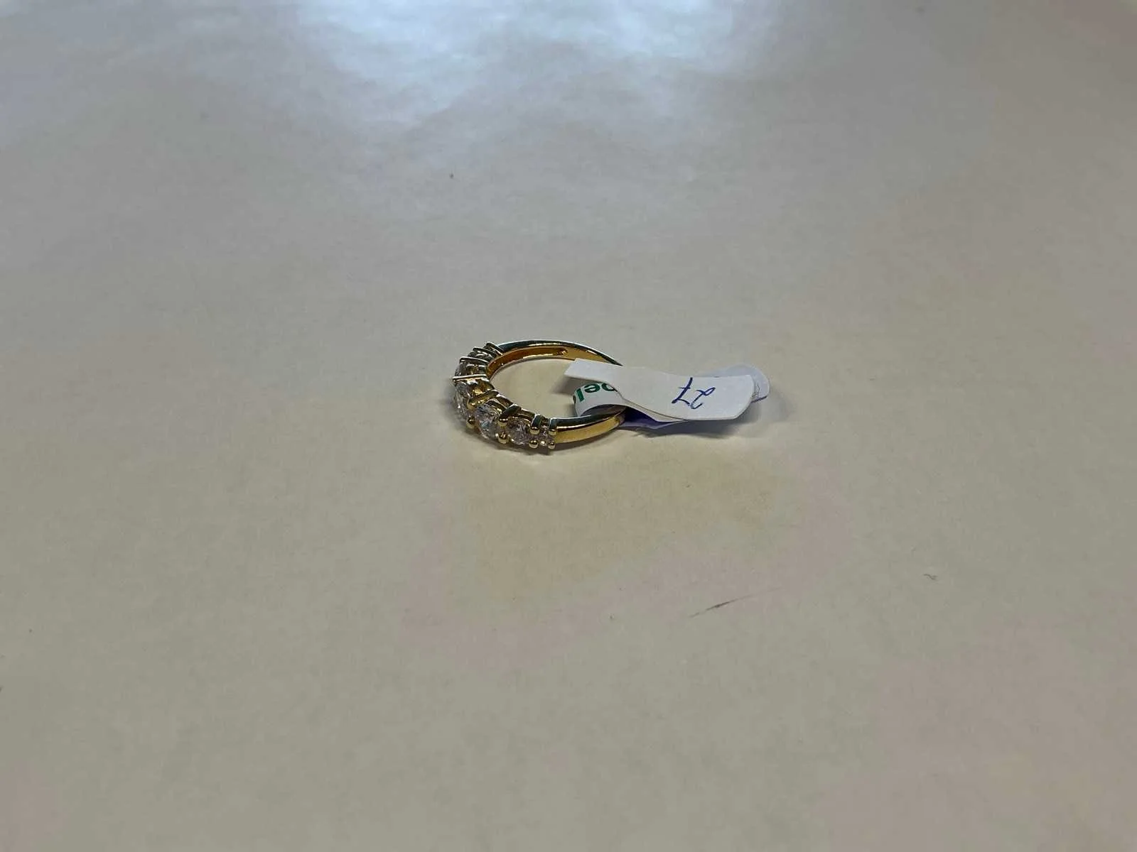 Een 14 karaats (585/000) geelgouden rijring bezet met zeven oplopende geslepen zirkonia's. Bruto gewicht: 3,1 gram Product type: 14 krt geelgouden