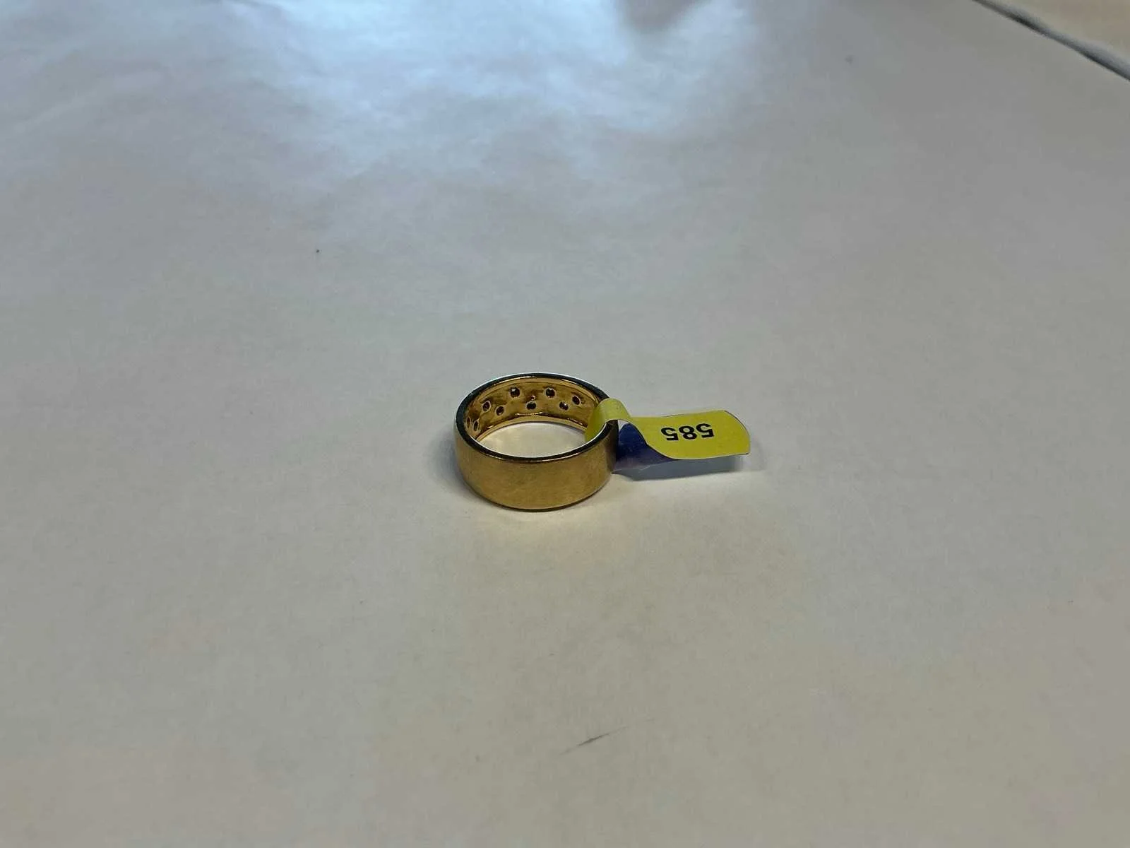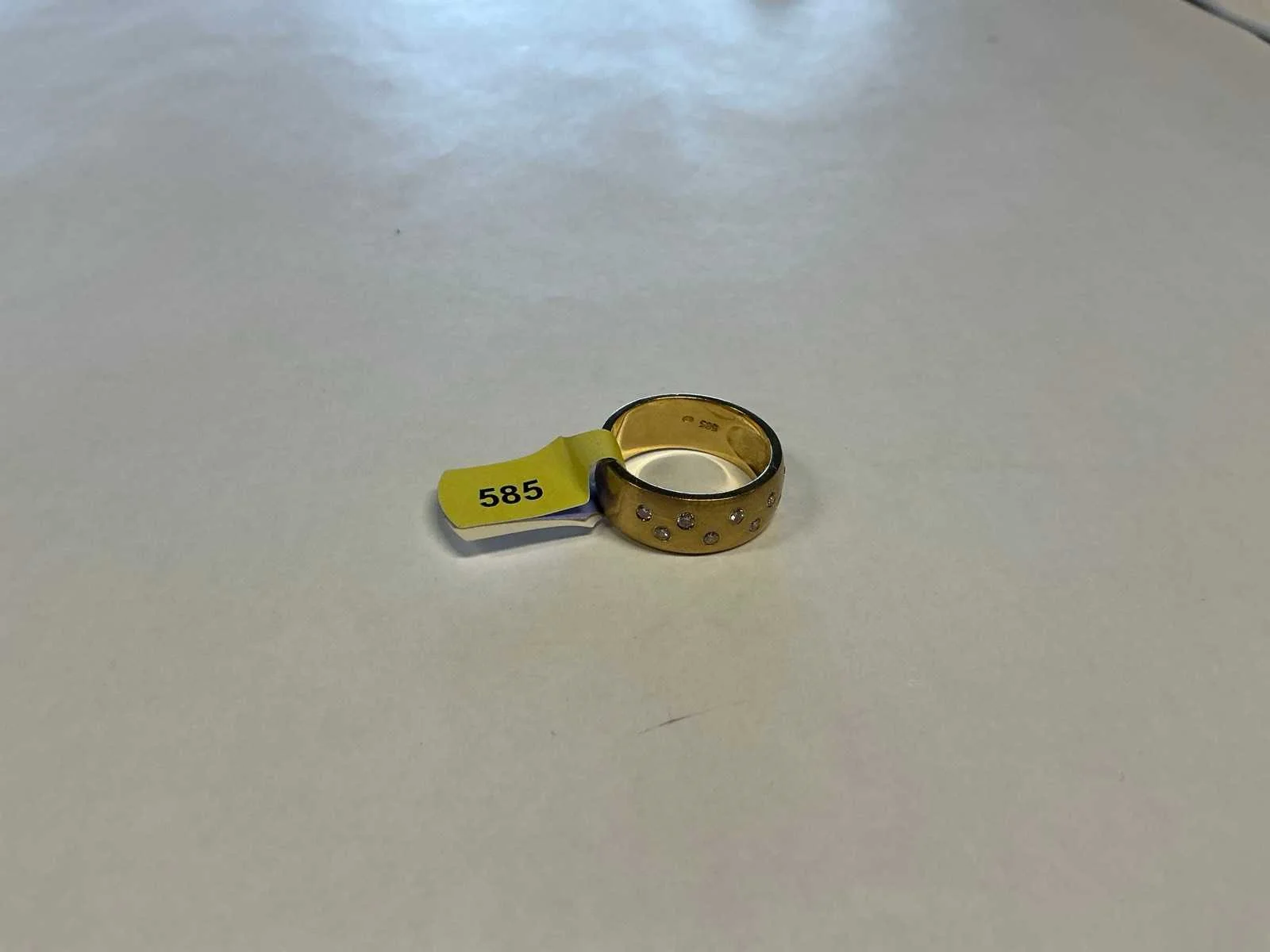 Een 14 karaats (585/000) geelgouden gematteerde bandring, bovenzijde bezet met briljant geslepen diamanten, verdiept gezet. Bruto gewicht: 7,2 gram Product type: 14 krt geelgouden