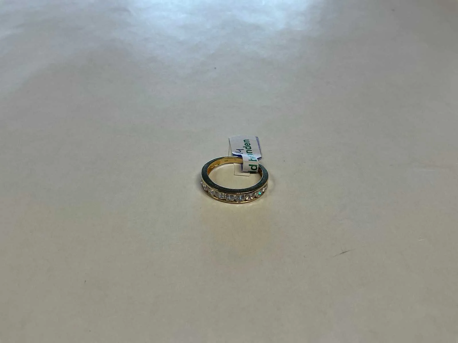 Een 14 karaats (585/000) geelgouden ring, rechthoekige grove kop geheel bezet met zirkonia's. Bruto gewicht: 6,1 gram. Product type: 14 krt geelgouden