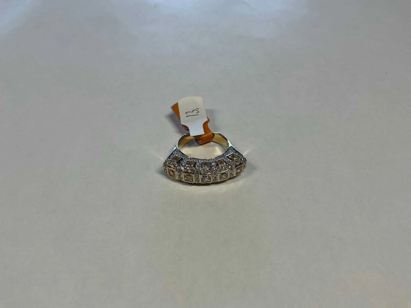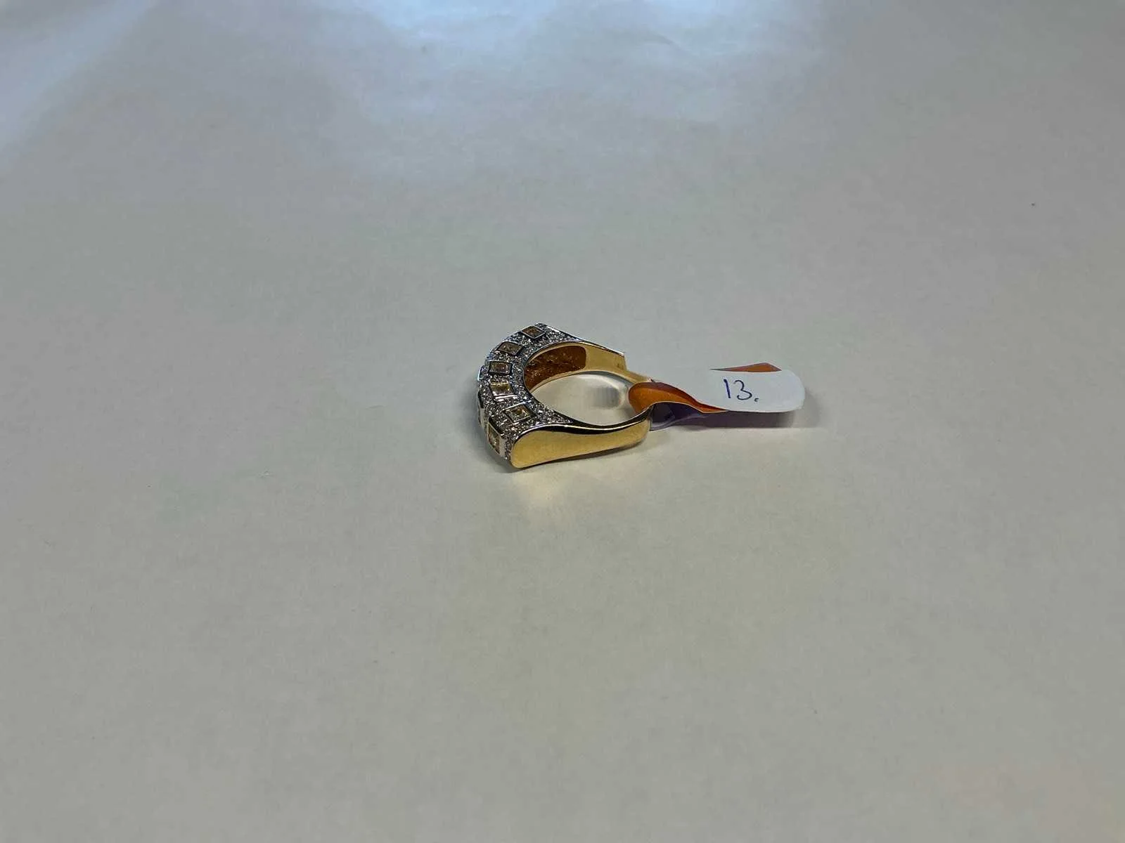 Een 18 karaats (750/000) geelgouden rijring bezet met zirkonia's. Bruto gewicht: 7,8 gram. Product type: 18 krt geelgouden