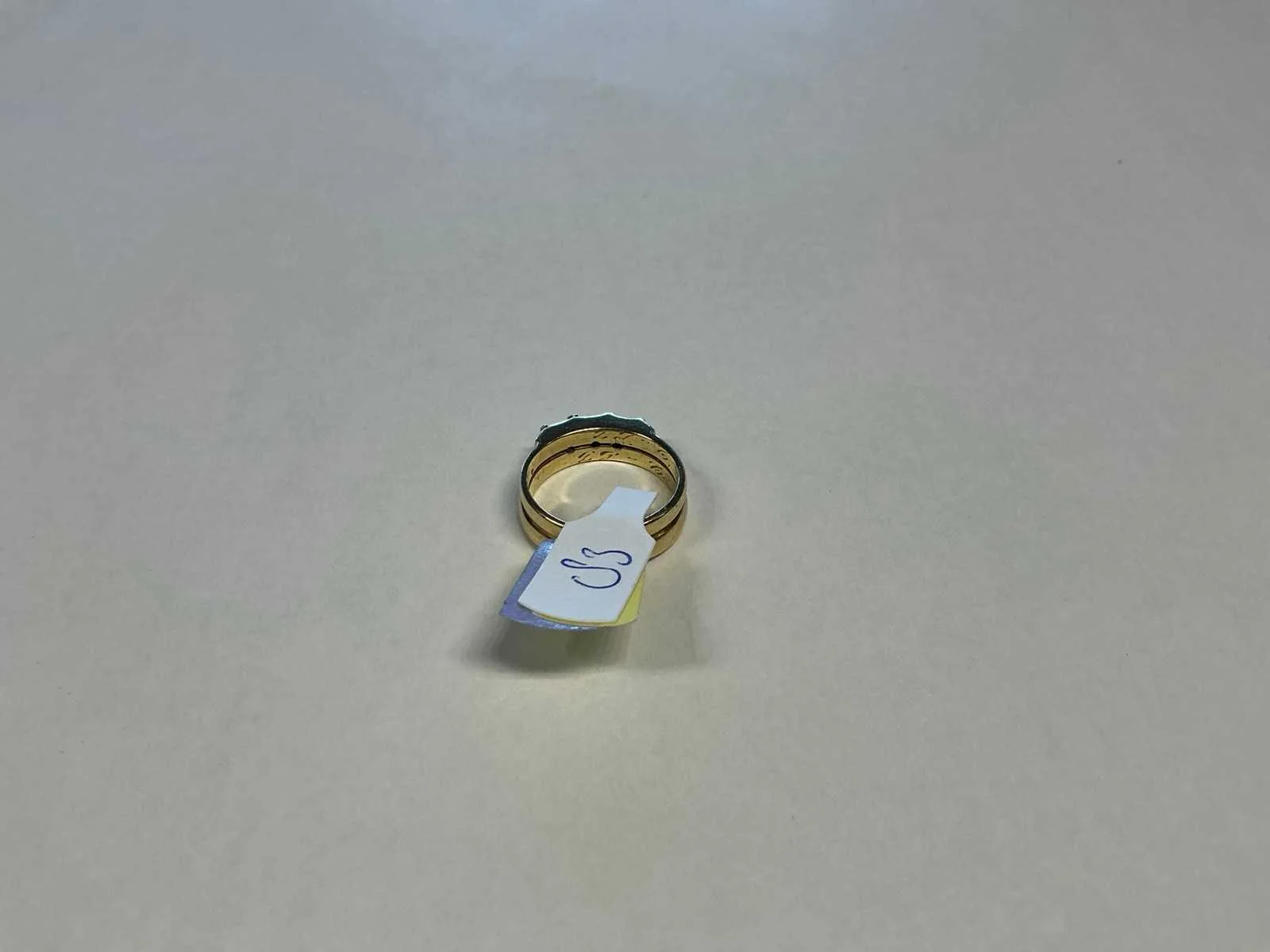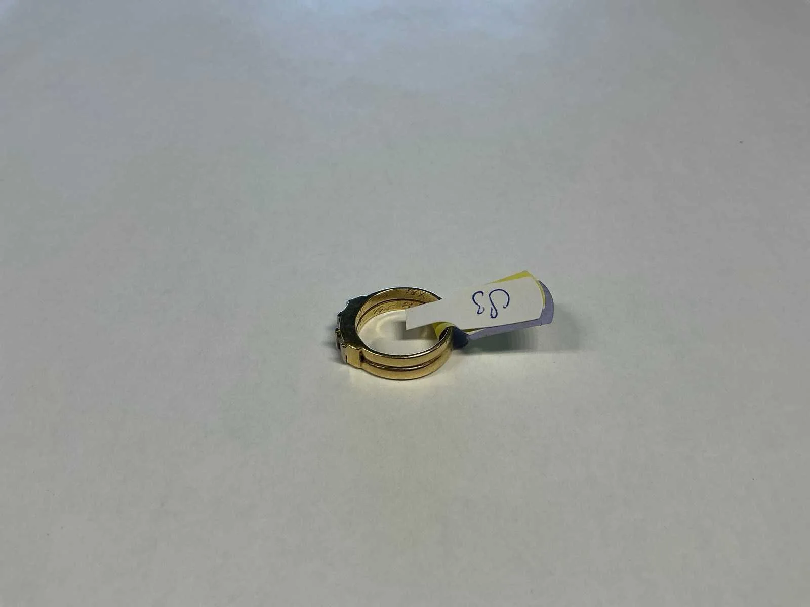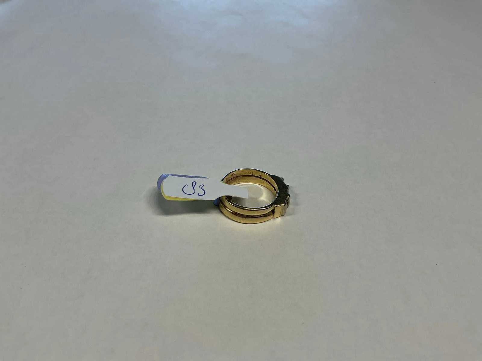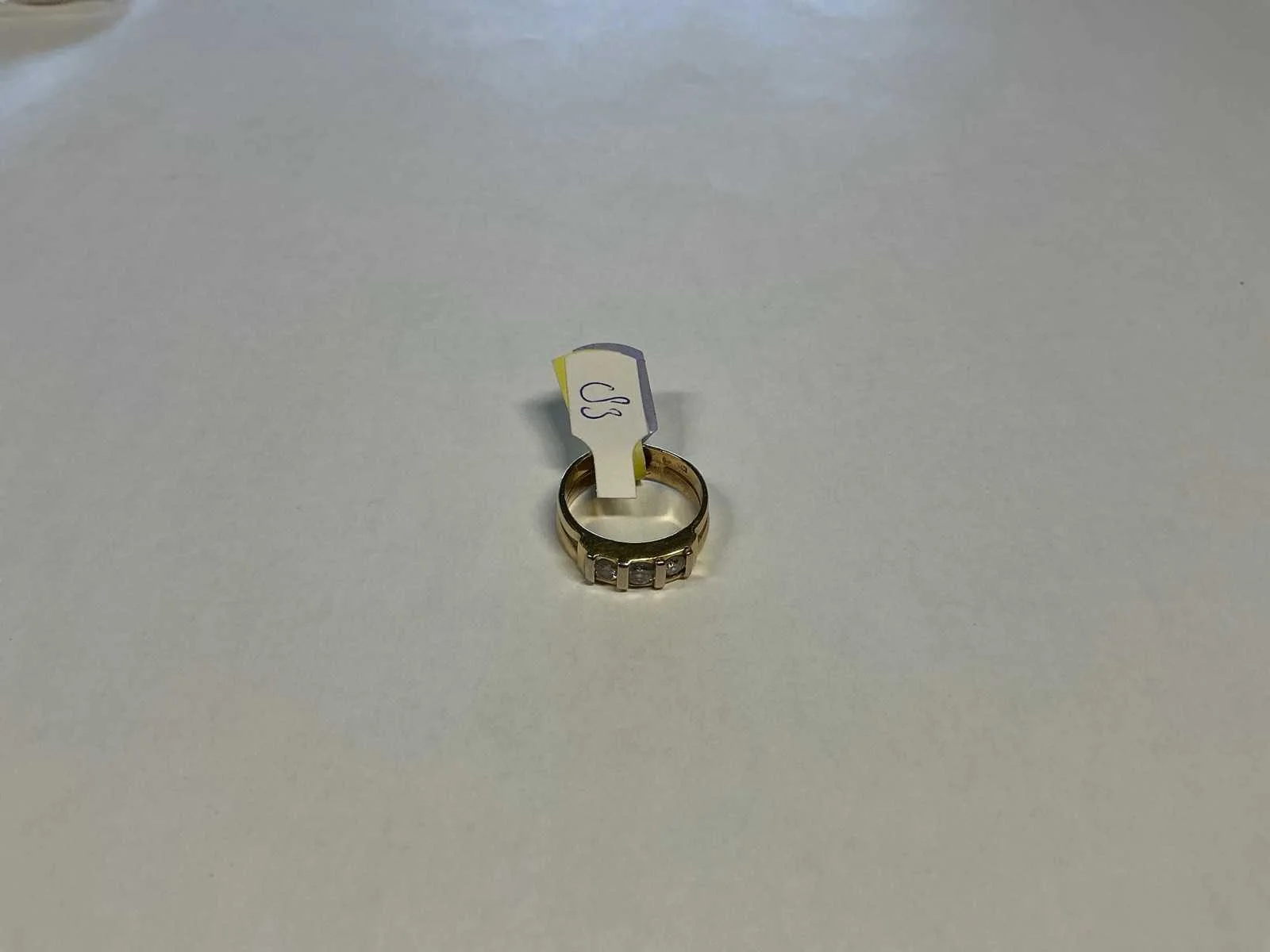Een 14 karaats (585/000) geelgouden rijring, bezet met drie briljant geslepen diamanten, totaal ca. 0,45ct., kleur ca. H, zuiverheid ca. VSI. Ring gemaakt van twee trouwringen. Bruto gewicht: 6,0 gram. Product type: 14 krt geelgouden