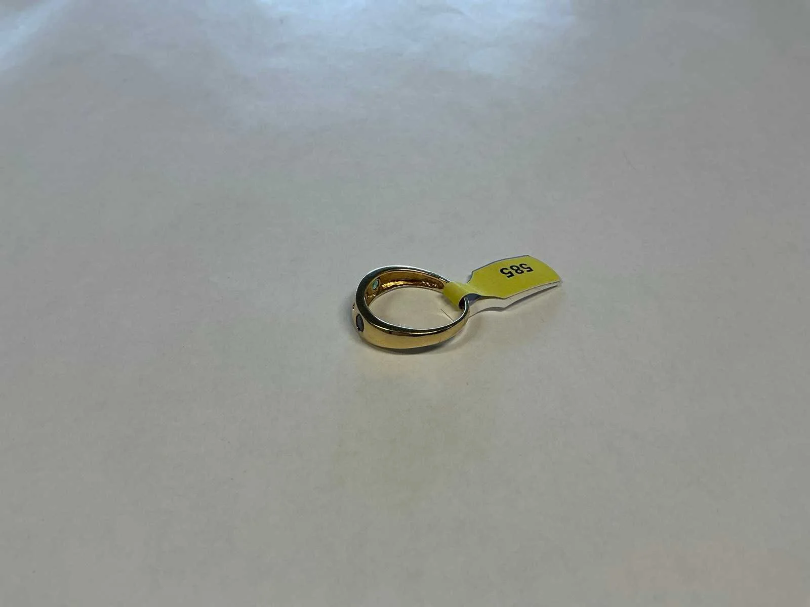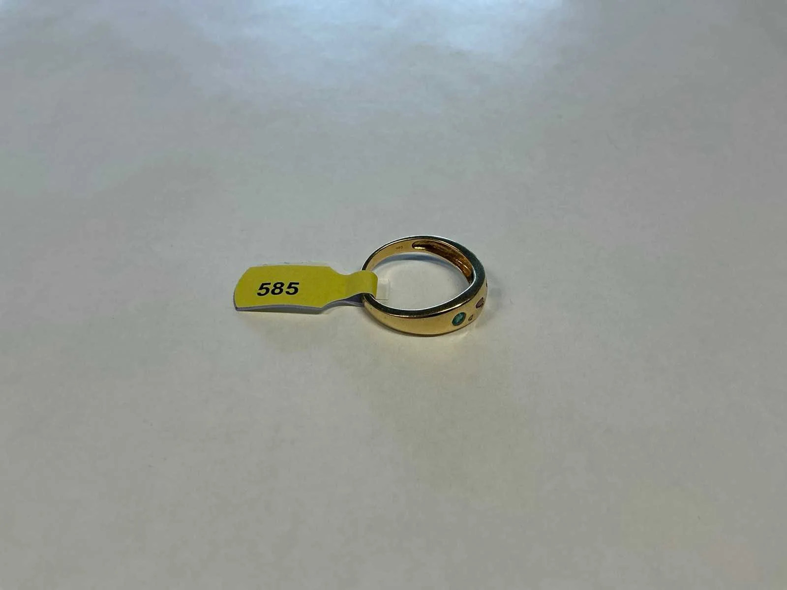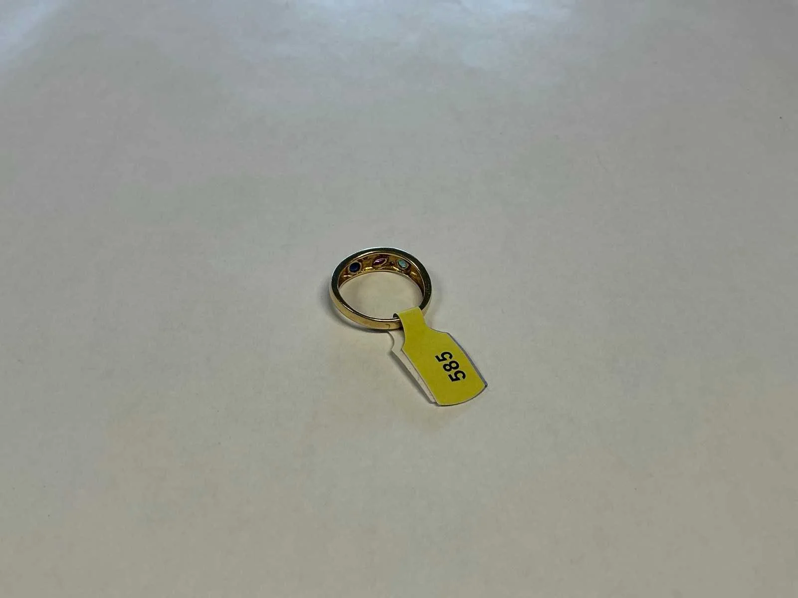 Een 14 karaats (585/000) geelgouden ring, bezet met smaragd, robijn, saffier en briljant geslepen diamanten. Bruto gewicht: 3,3 gram. Product type: 14 krt geelgouden