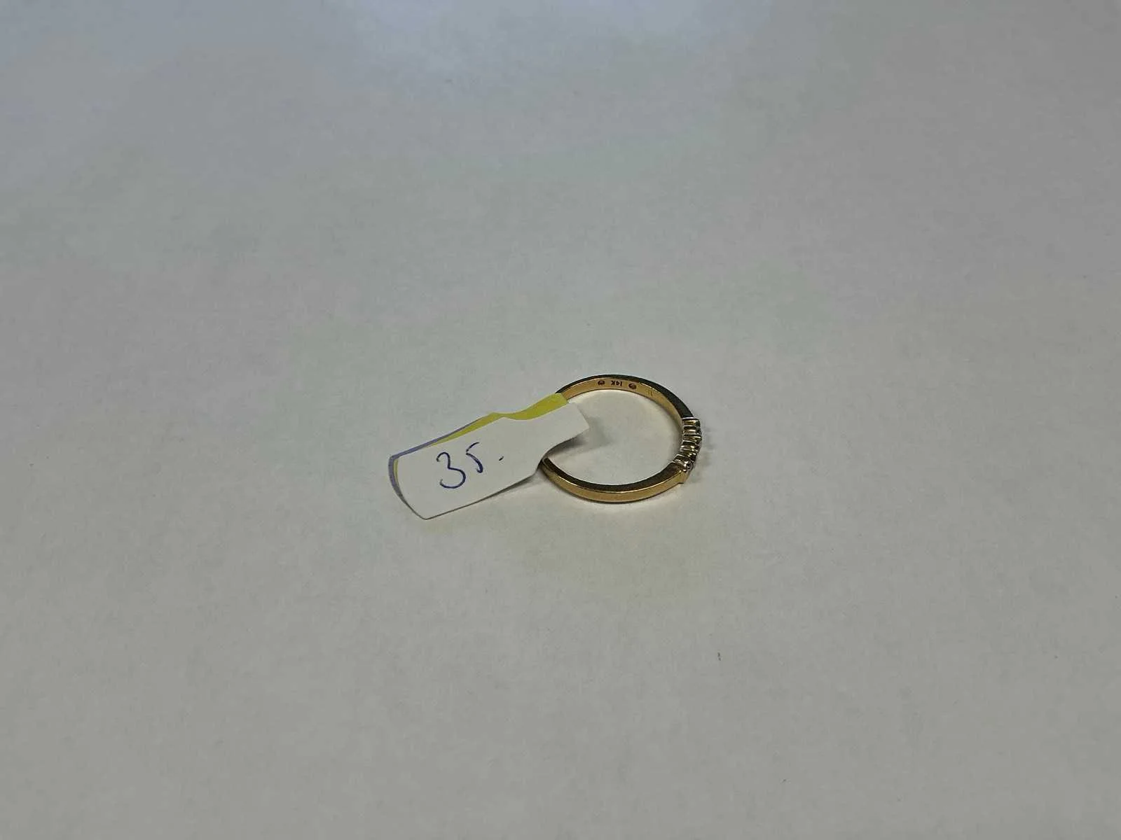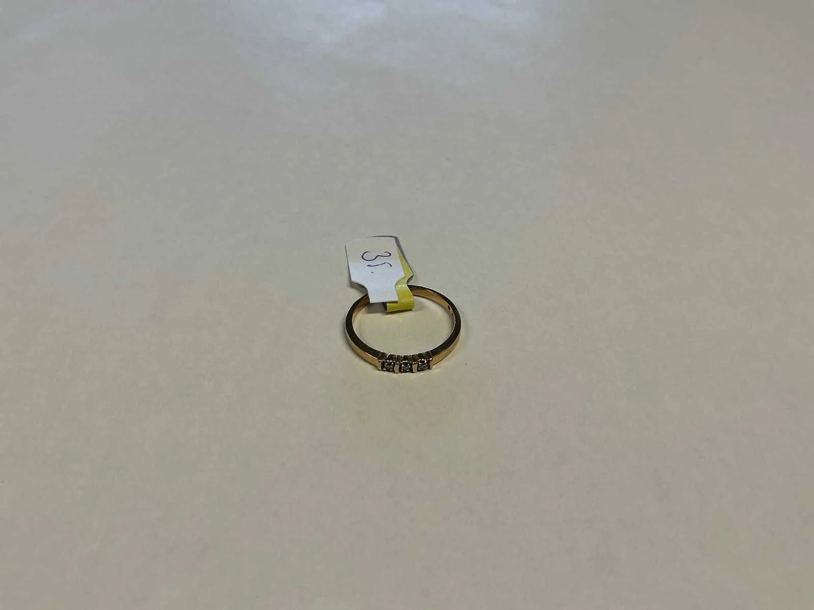 Een 14 karaats (585/000) geelgouden rijirng bezet met drie kleine briljant geslepen diamanten. Bruto gewicht: 1,9 gram. Product type: 14 krt geelgouden