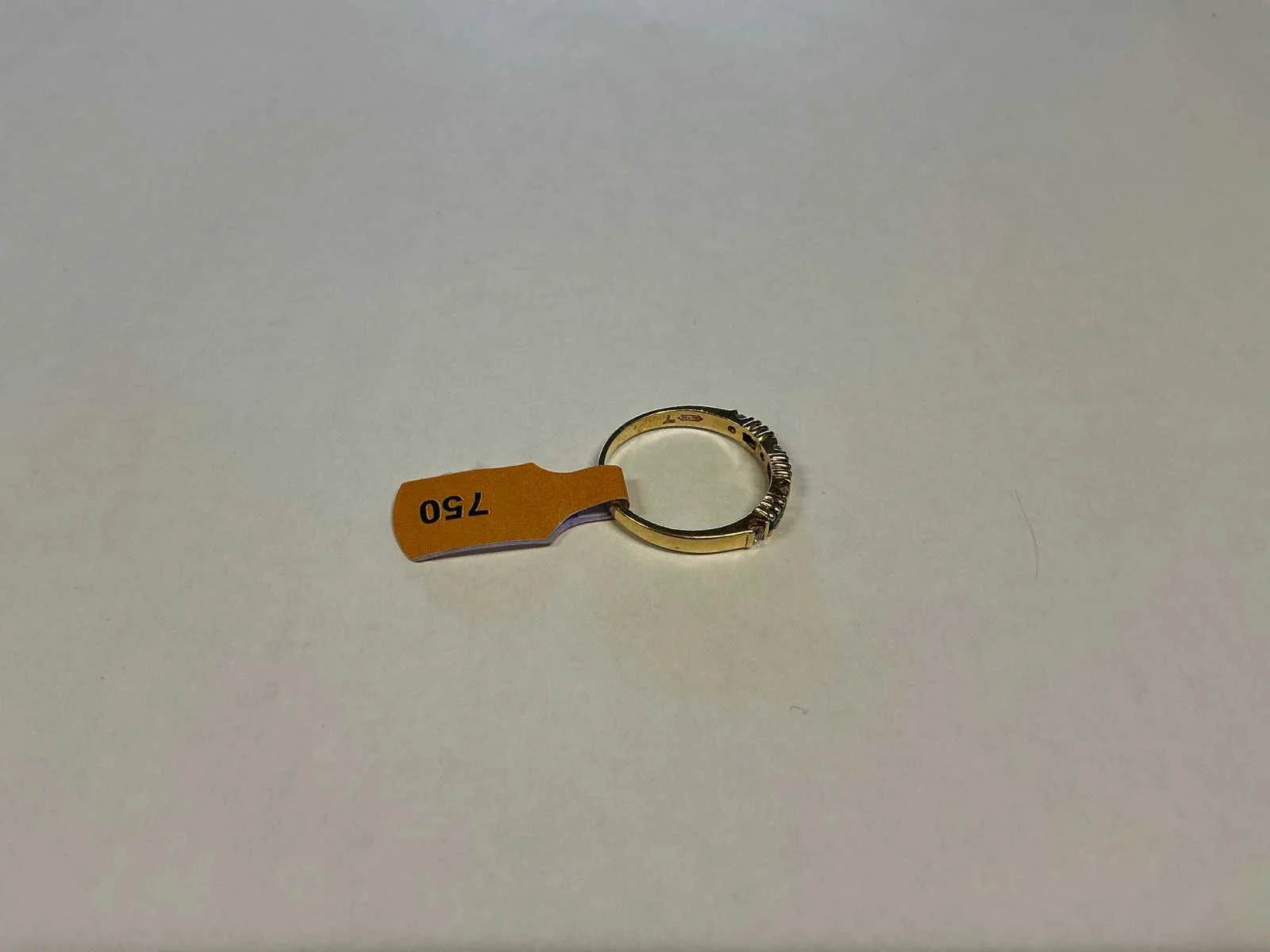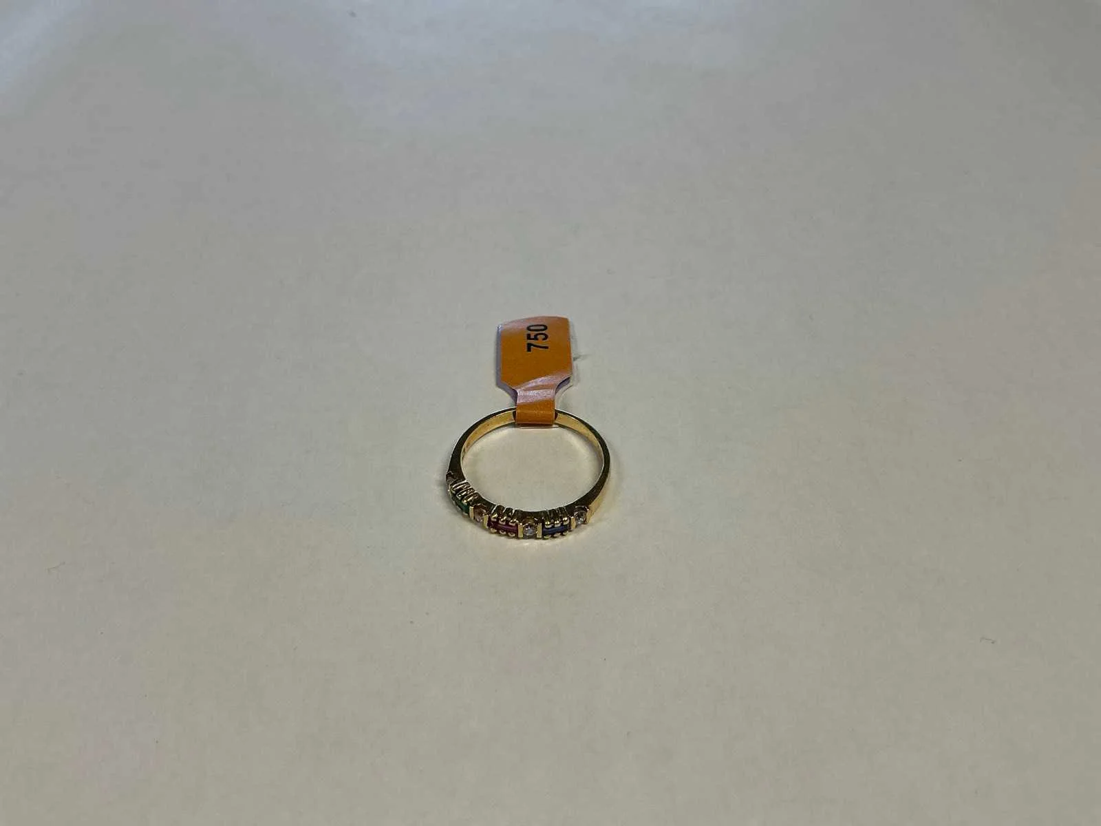Een 18 karaats (750/000) geelgouden rijring bezet met synthetische stenen. Bruto gewicht: 2,5 gram. Product type: 18 krt geelgouden