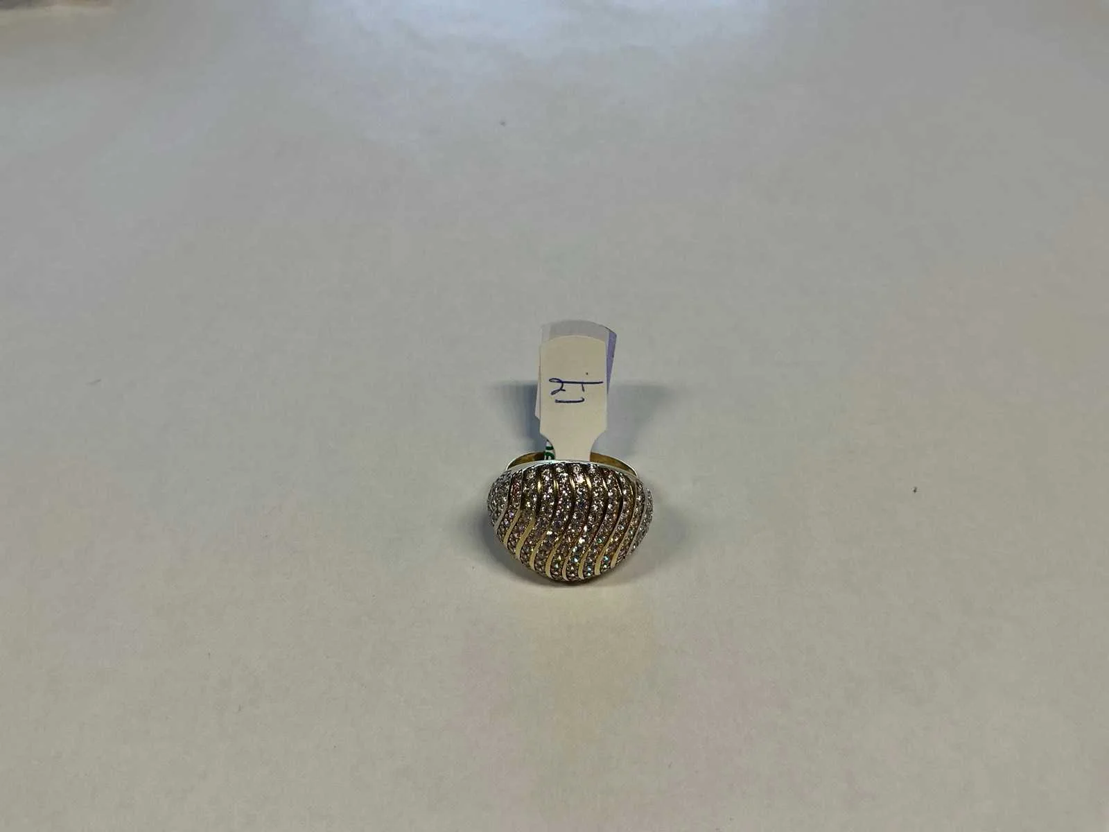 Een 14 karaats (585/000) wit- en geelgouden ring, bolle kop bezet met zirkonia's. Bruto gewicht: 6,5 gram. Product type: 14 krt wit- en geelgouden