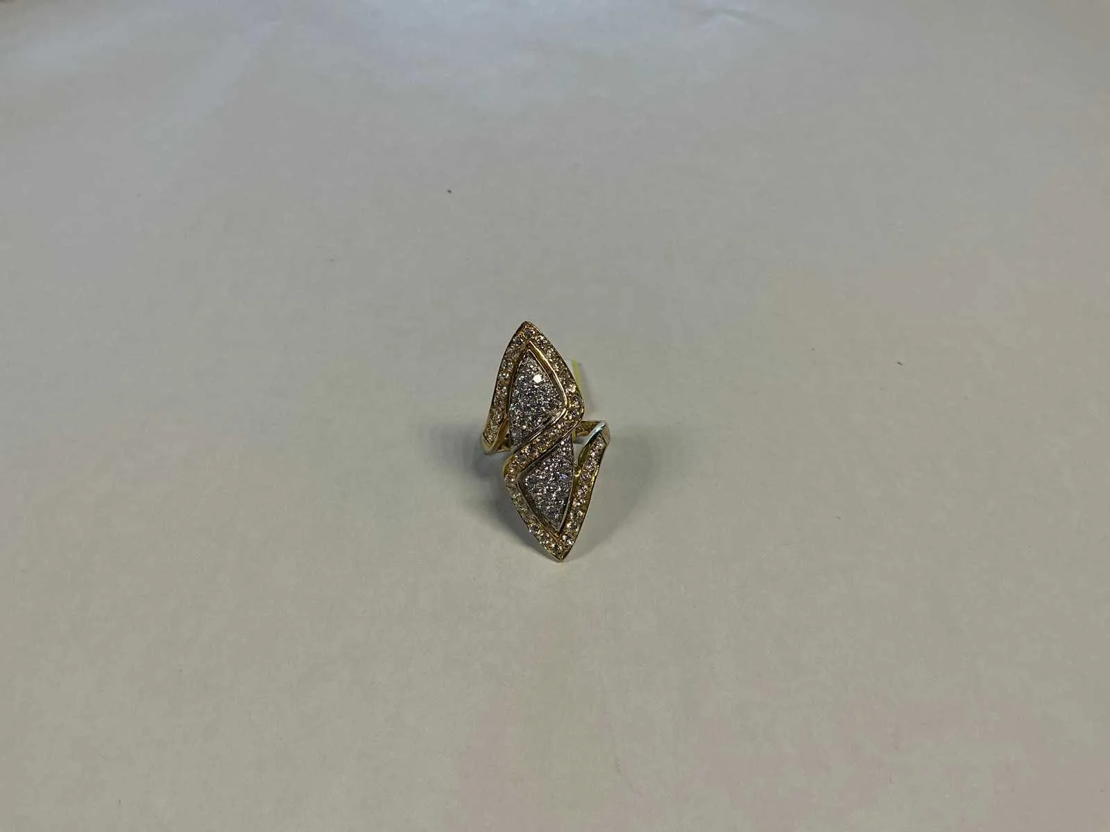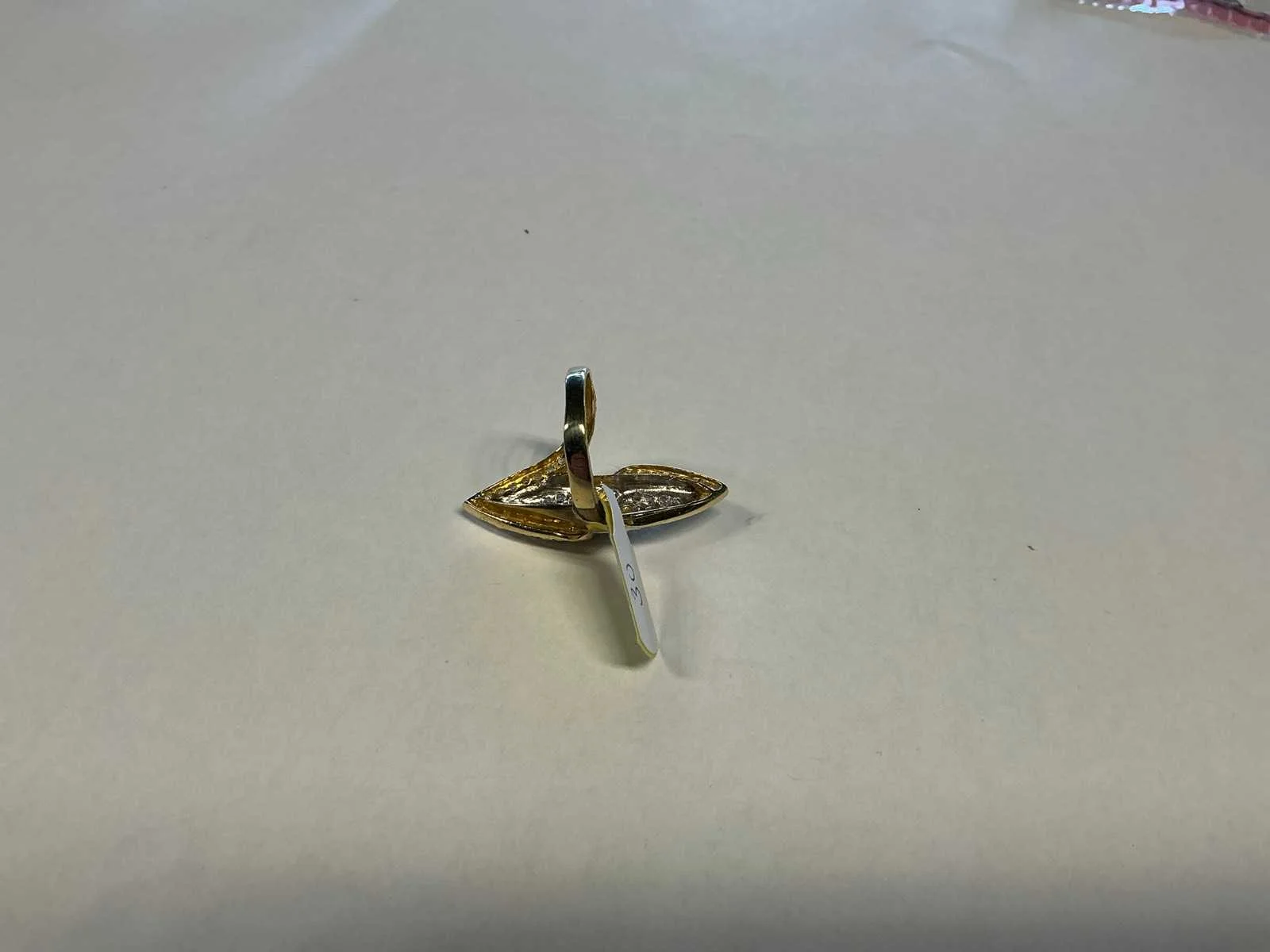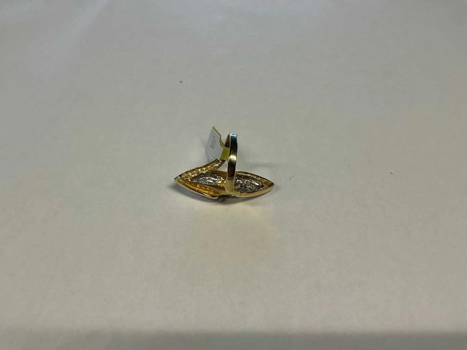 Een 14 karaats (585/000) wit- en geelgouden ring, grove markiesvormige kop bezet met zirkonia's. Bruto gewicht: 7,0 gram Product type: 14 krt wit- en geelgouden