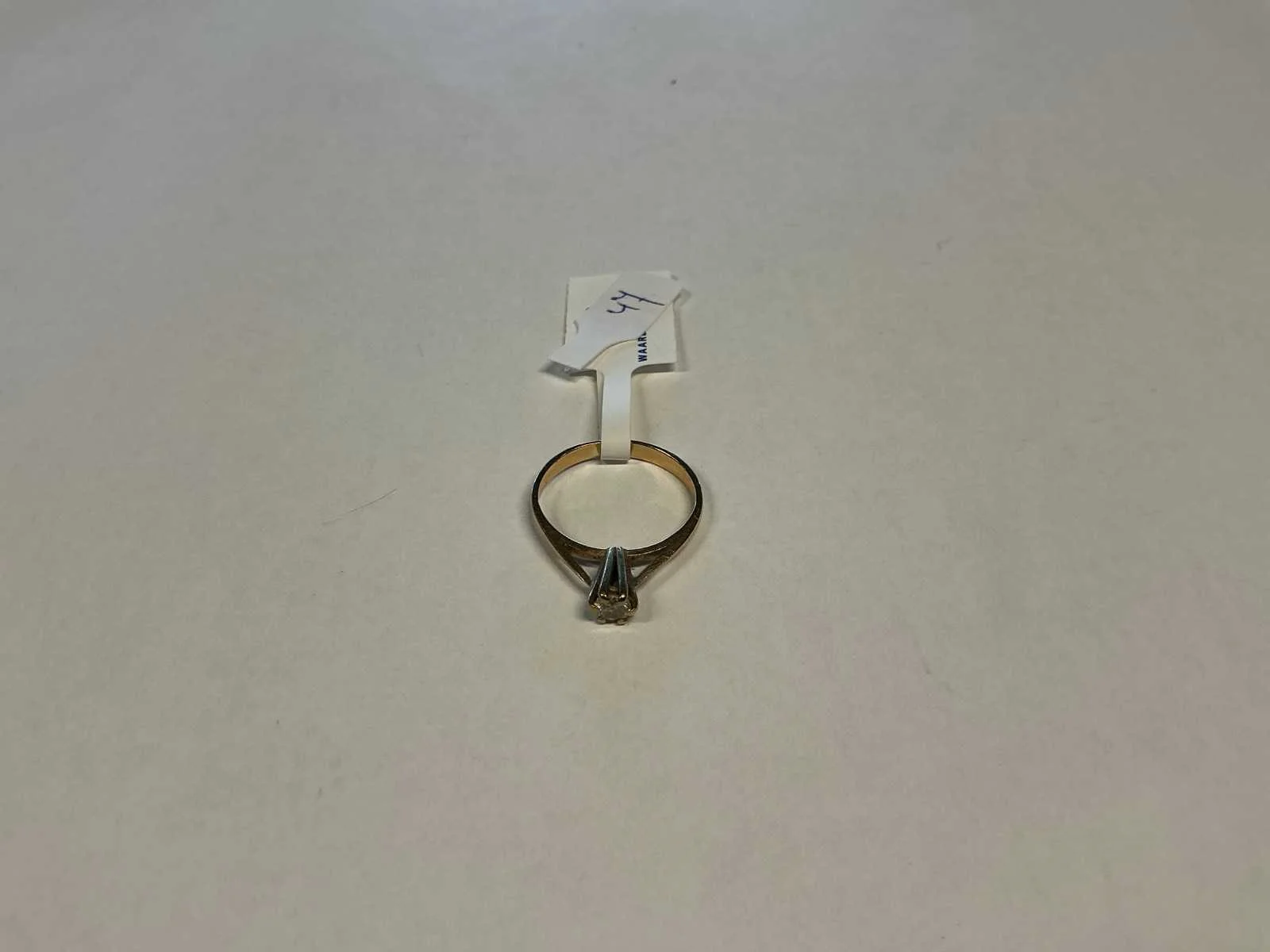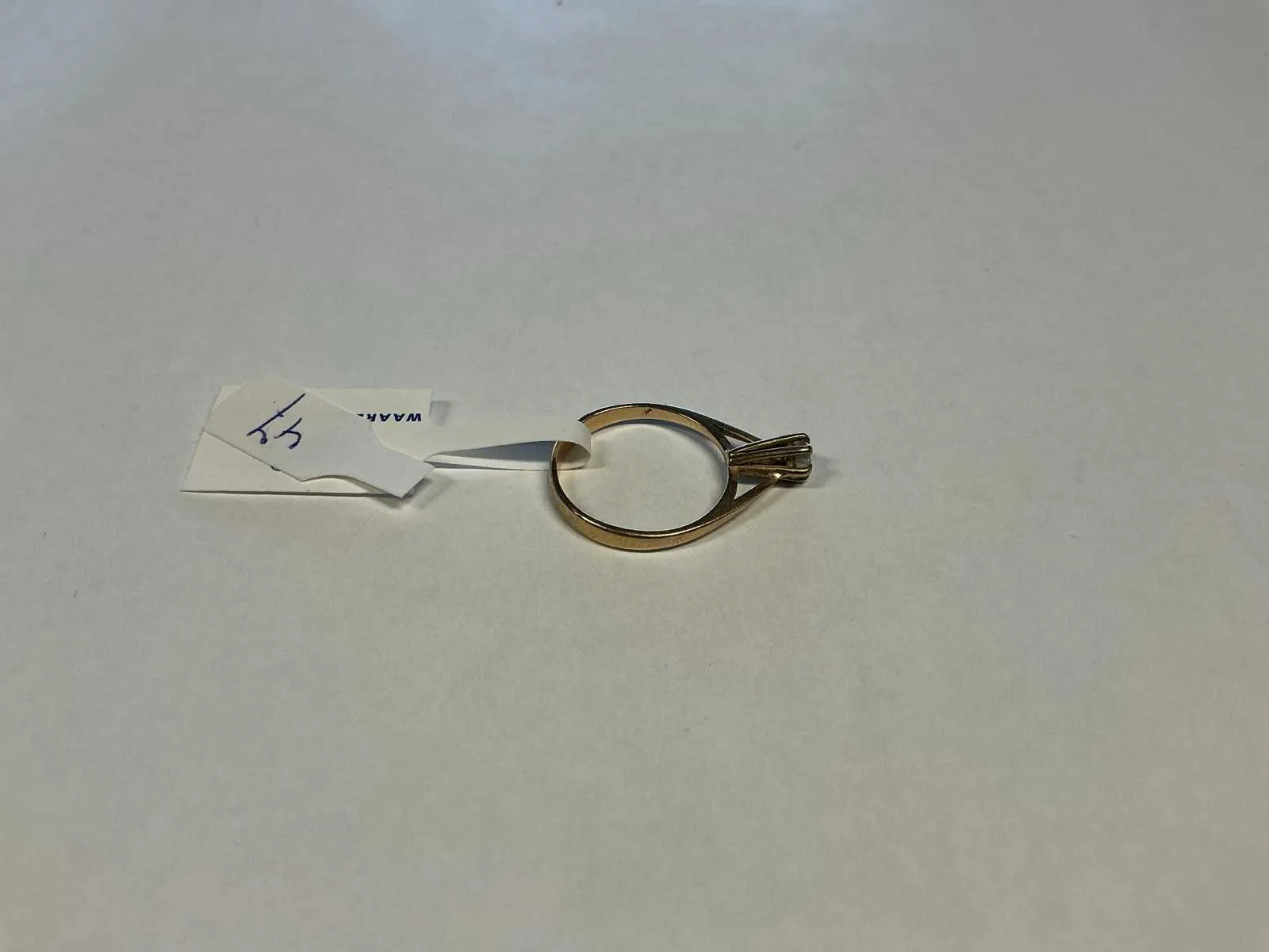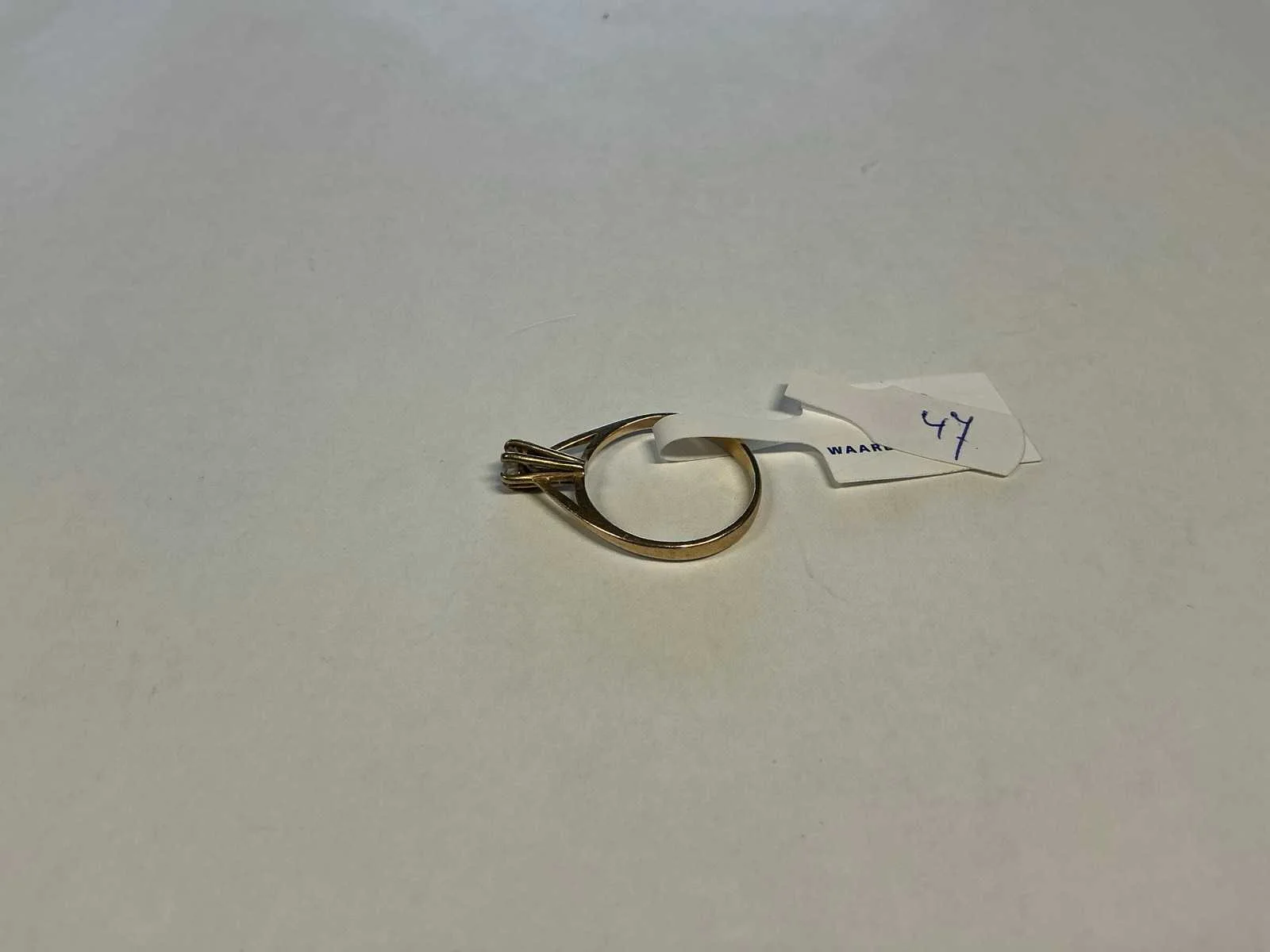Een beneden het wettelijk gehalte ( 420/000) geelgouden solitairring, bezet met een briljant geslepen diamant, ca. 0,22ct., kleur ca. H, zuiverheid ca. VSI. Bruto gewicht: 1,8 gram. Product type: 14 krt geelgouden