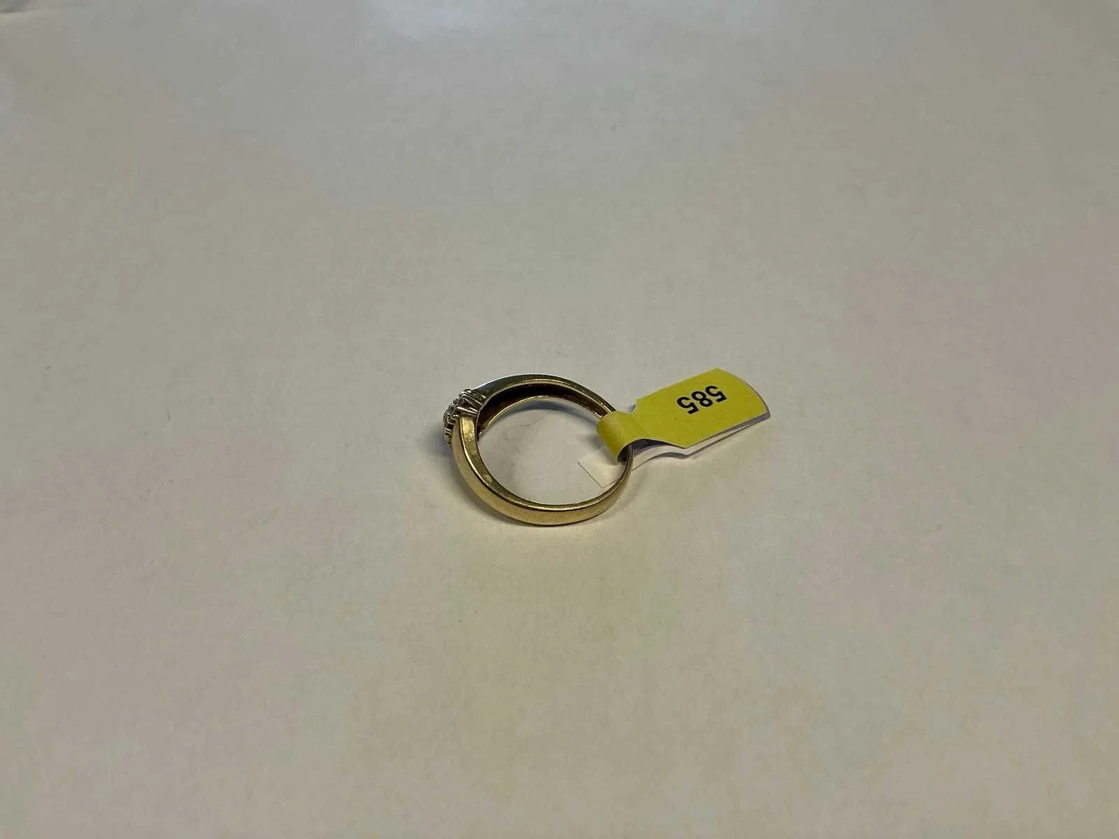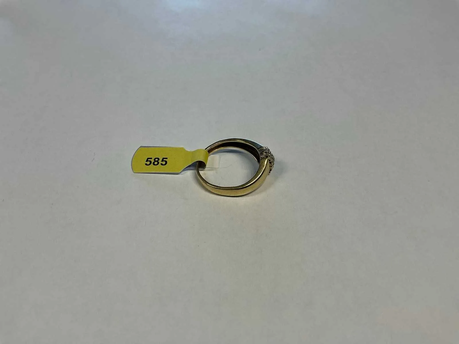 Een 14 karaats (585/000) geelgouden ring. Centraal een ovale vorm bezet met briljant geslepen diamanten. Bruto gewicht: 3,0 gram. Product type: 14 krt geelgouden
