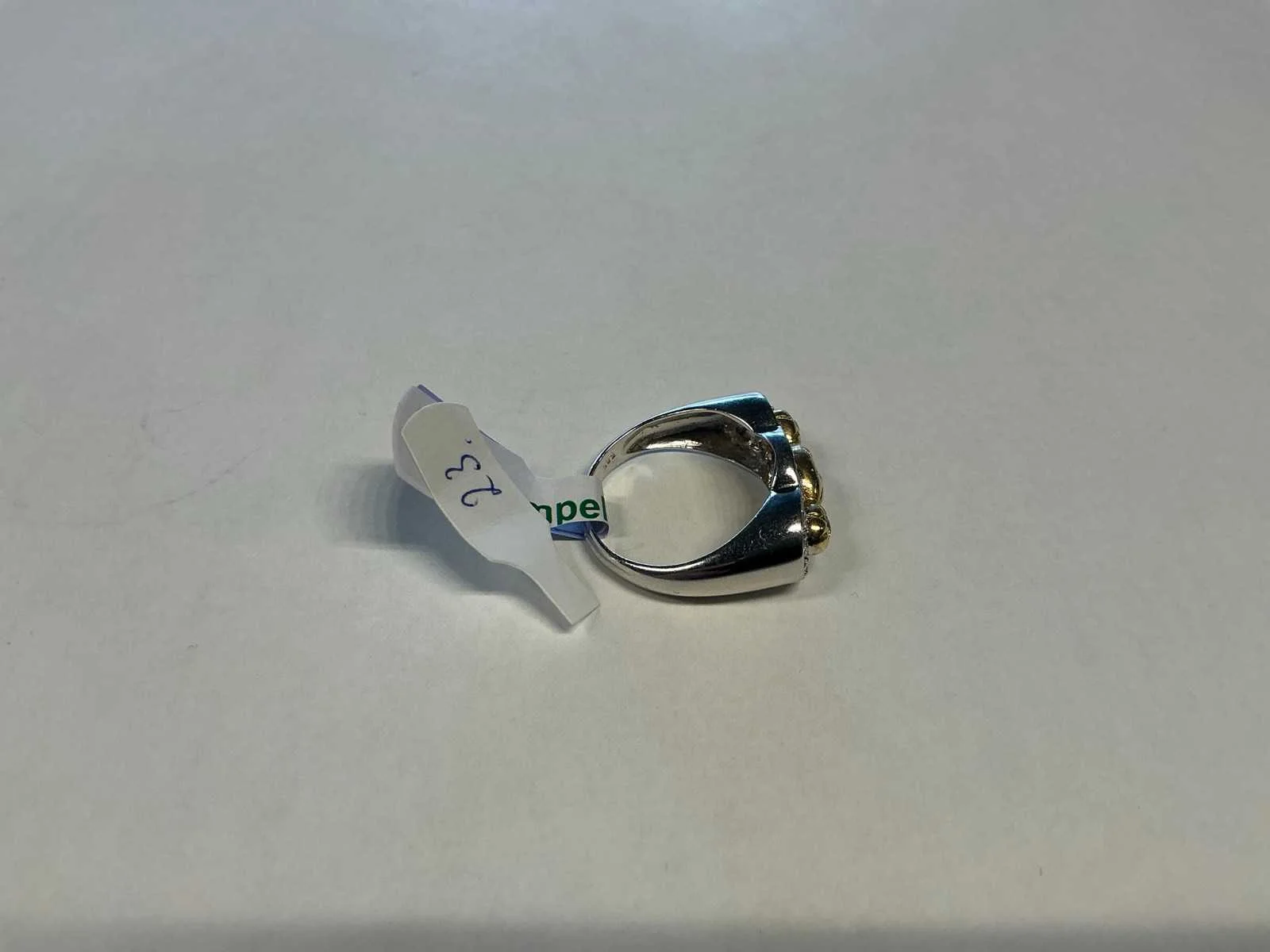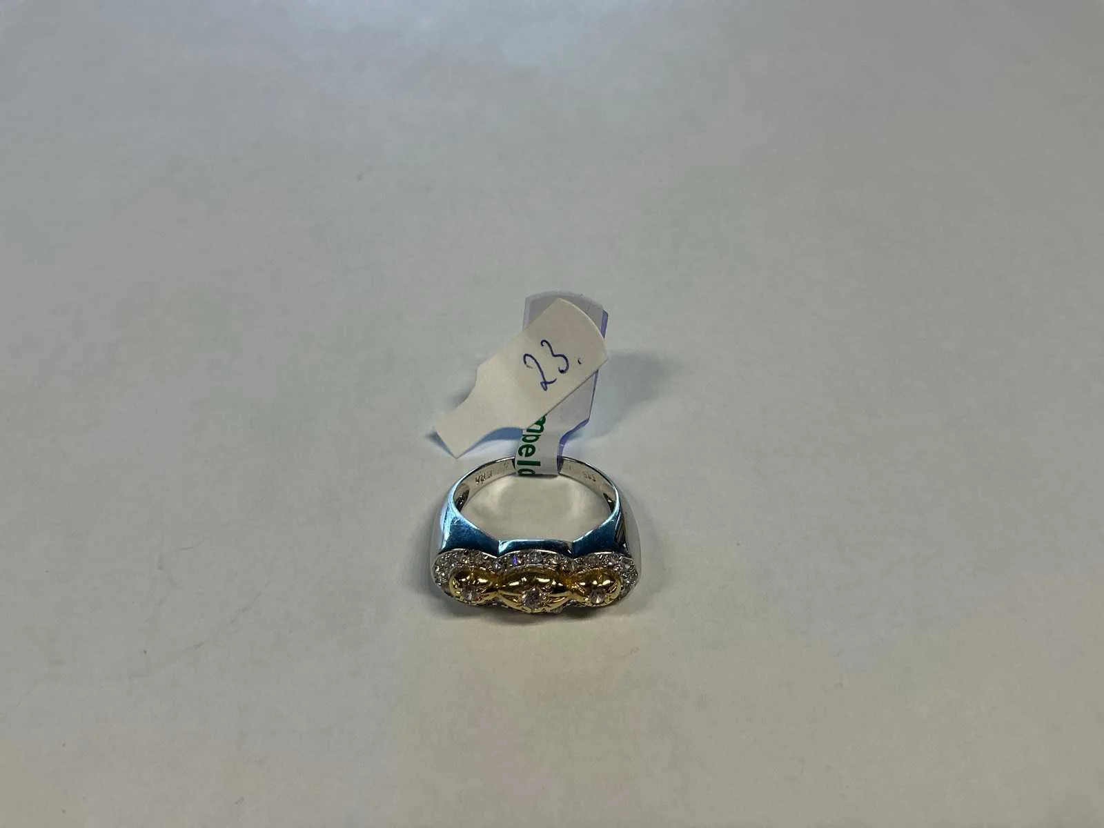 Een 14 karaats (585/000) wit- en geelgouden ring bezet met zirkonia's. Bruto gewicht: 4,3 gram. Product type: 14 krt geelgouden