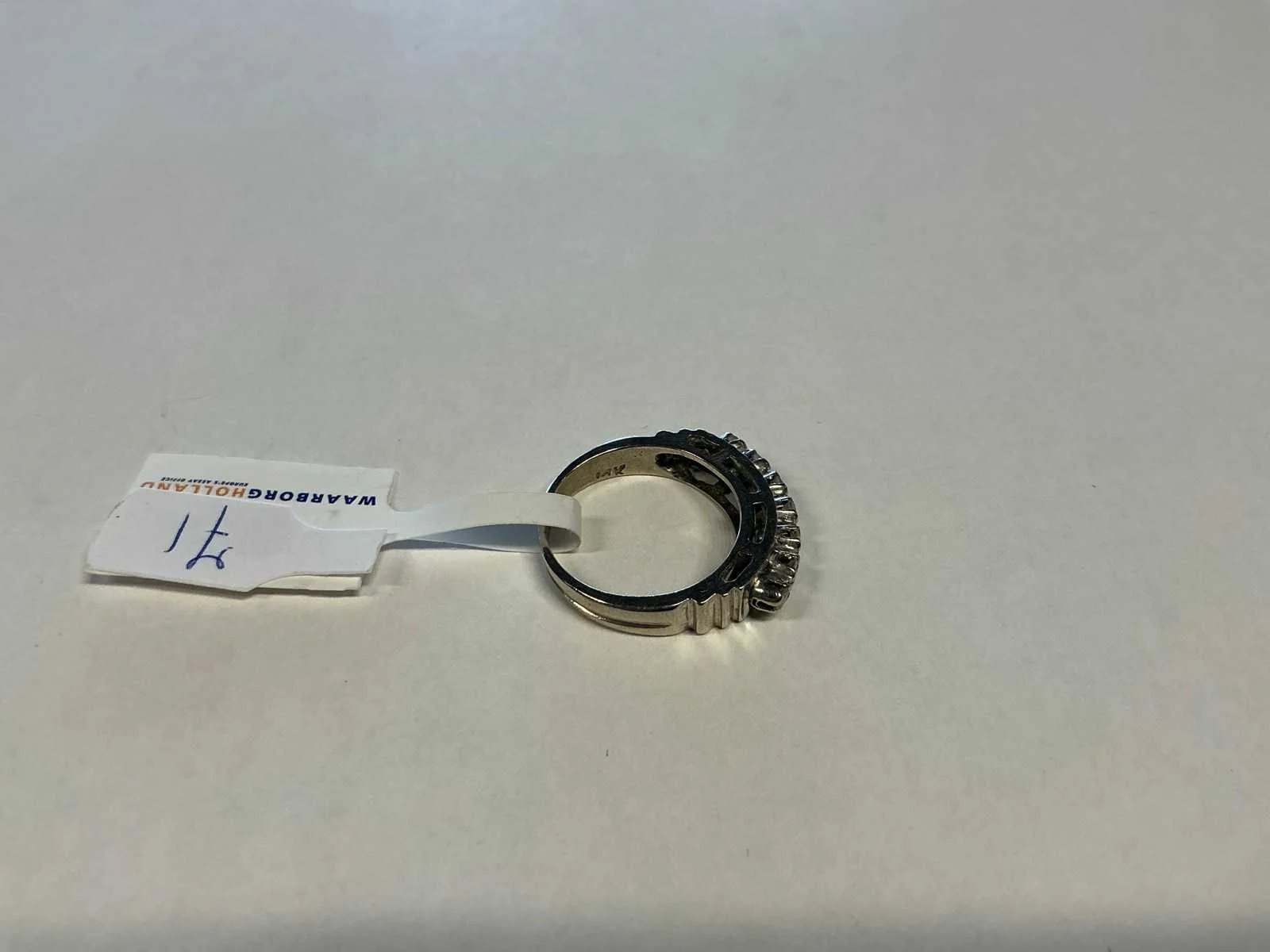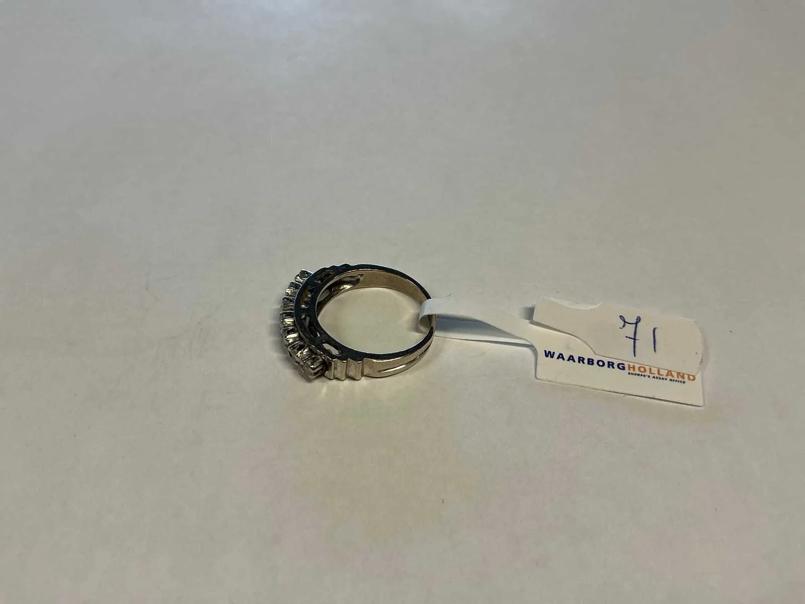 Een beneden het wettelijk gehalte (400/000) witgouden rijring, bezet met achtkant geslepen diamanten, Pique. Bruto gewicht: 3,8 gram. Product type: Witgouden