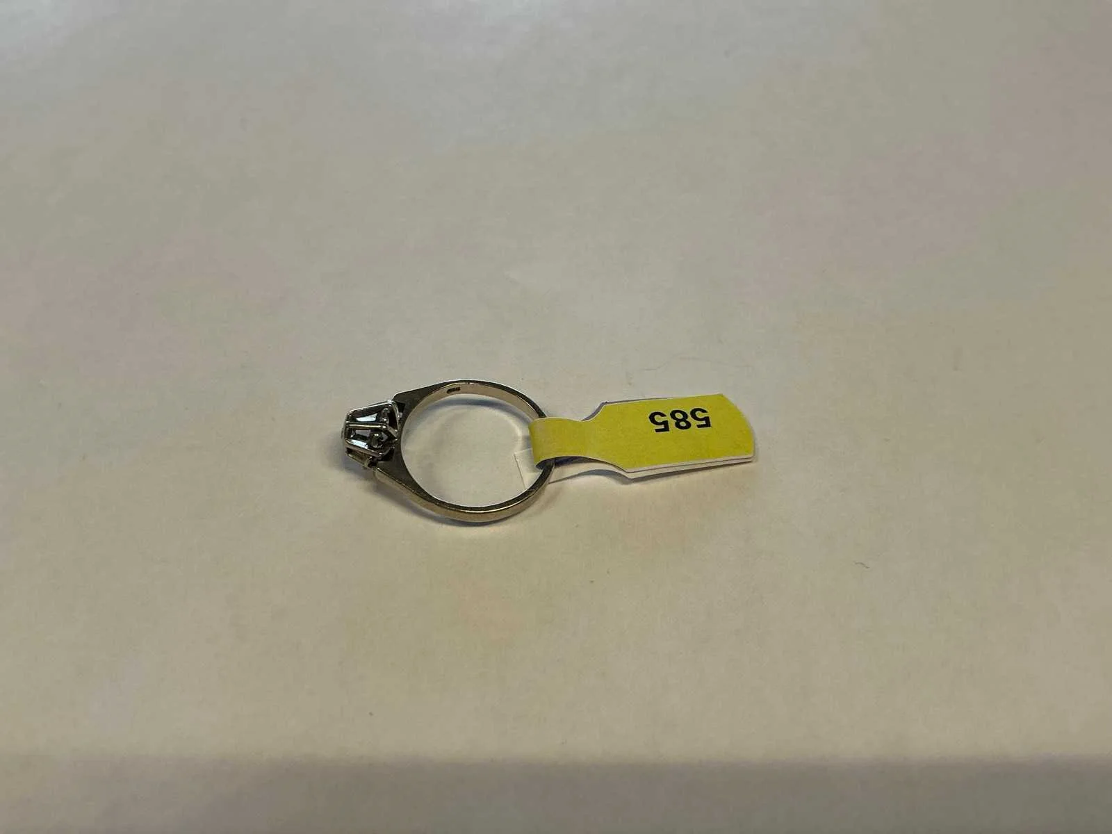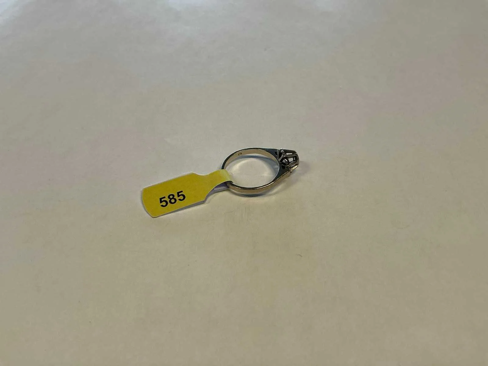 Een 14 karaats (585/000) witgouden ring, bezet met een kleine briljant geslepen diamant. Bruto gewicht: 2,0 gram. Product type: 14 krt witgouden