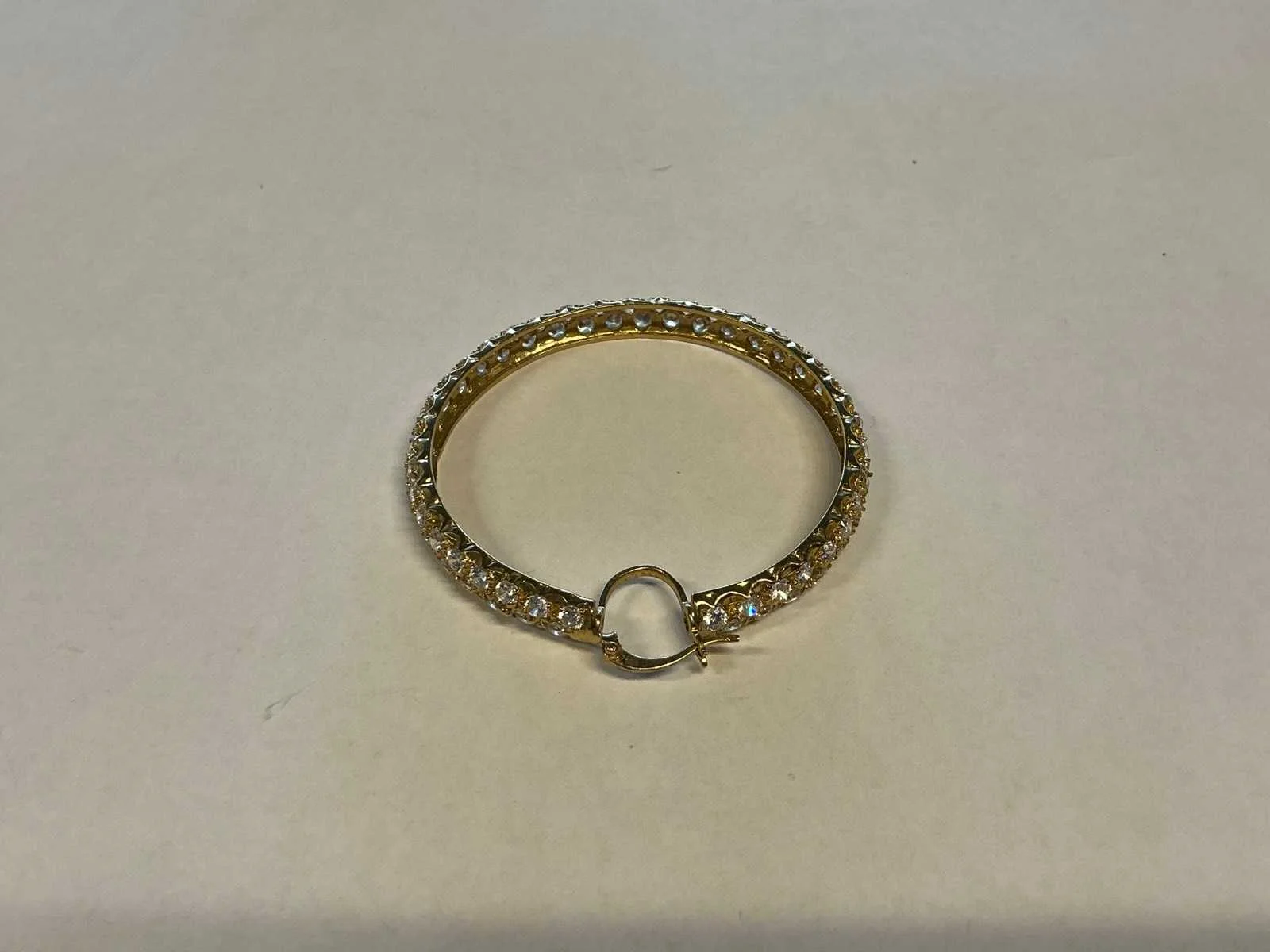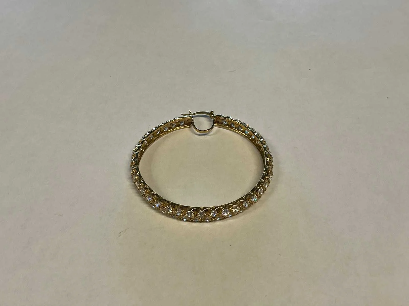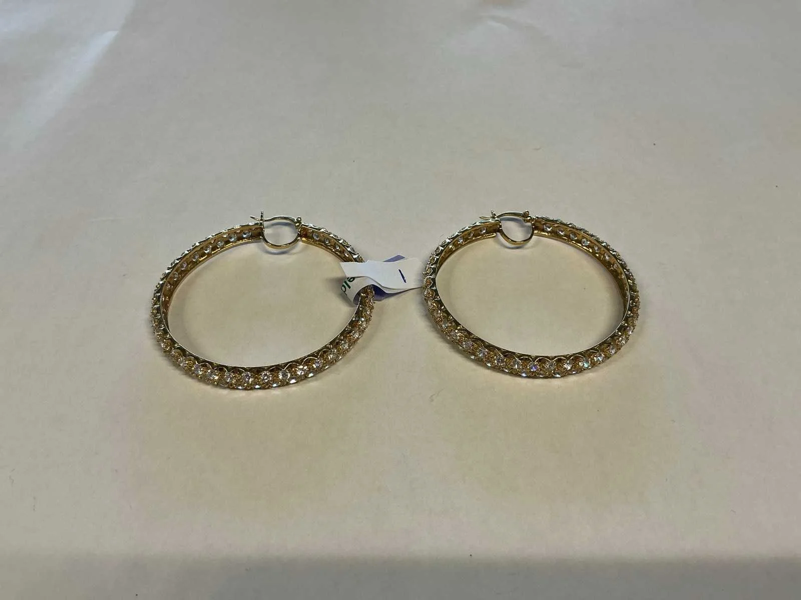 Een paar 14 karaats (585/000) geelgouden oorringen rijkelijk bezet zirkonia's. Bruto gewicht: 19,1 gram. Product type: 14 krt geelgouden