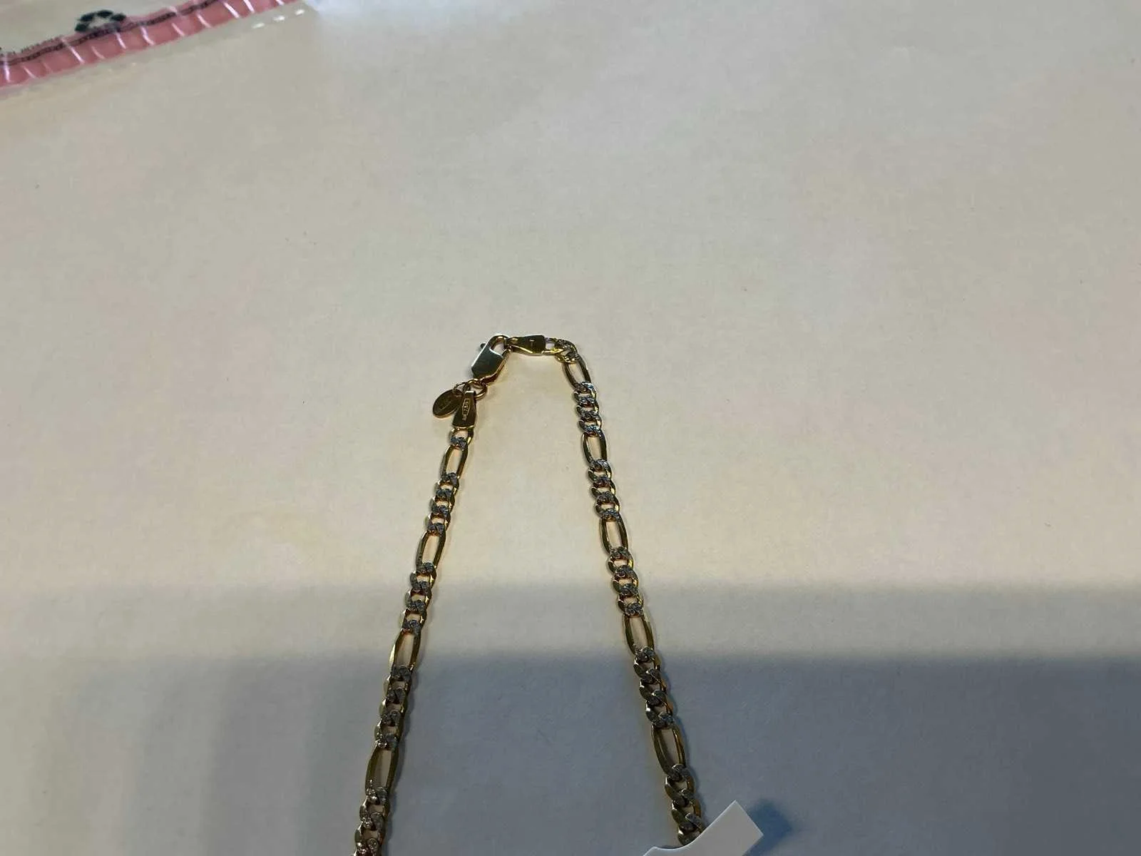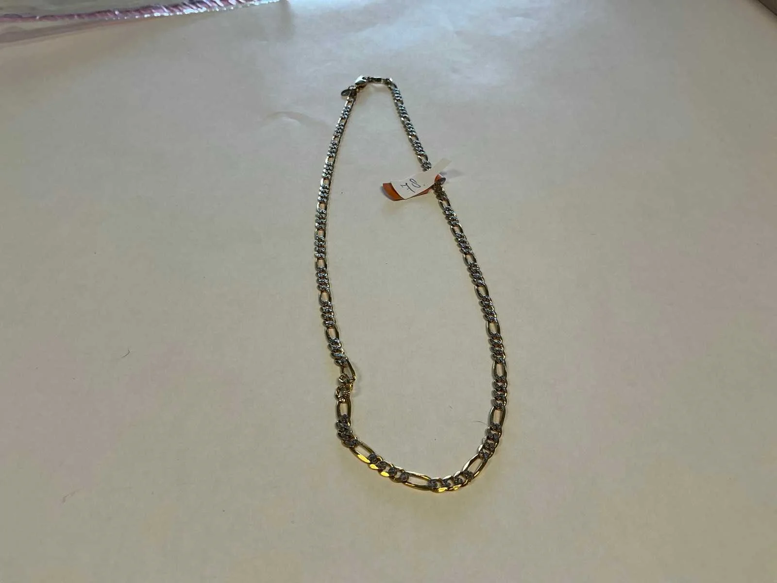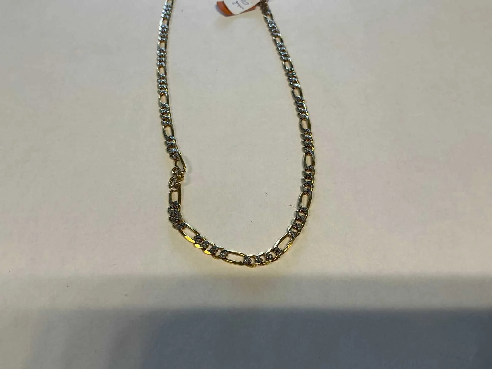 Een 18 karaats (750/000) wit- en geelgouden collier, figaroschakels. Bruto gewicht: 13,0 gram. Product type: 18 krt wit- en geelgouden