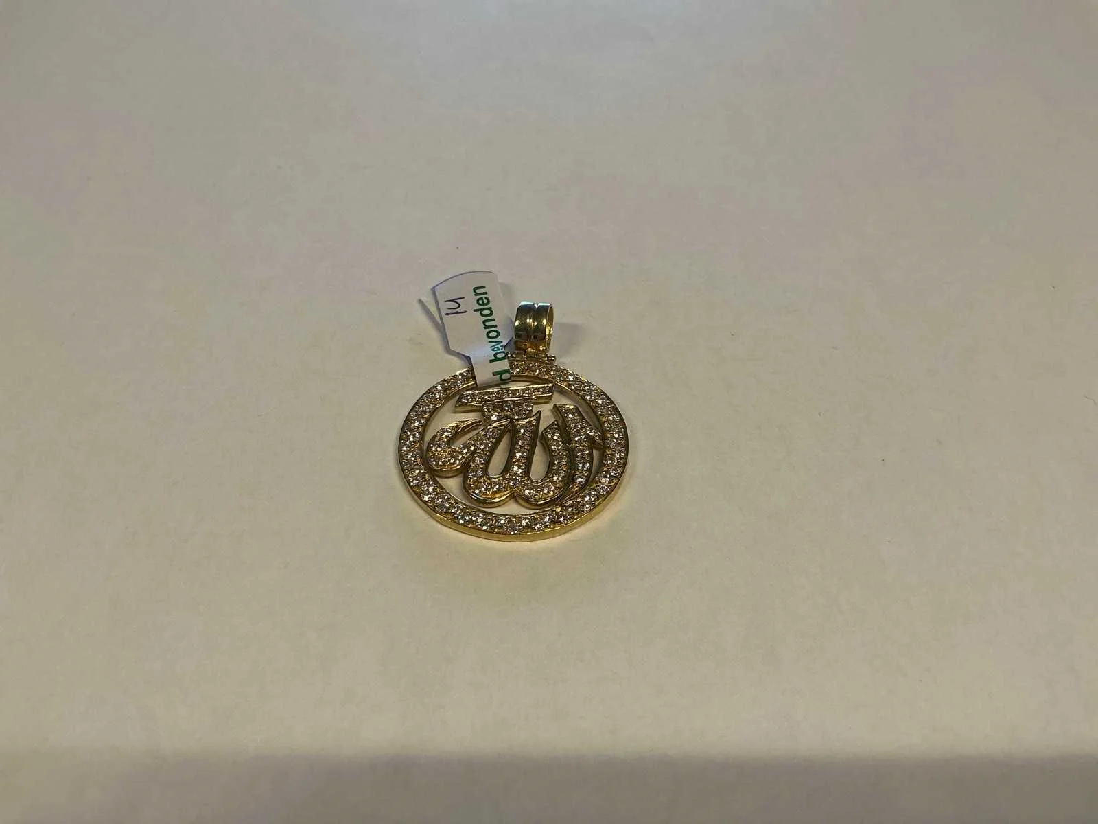 Een 14 karaats (585/000) geelgouden hanger, met Arabische karakter, geheel bezet met zirkonia's (mist één). Bruto gewicht: 7,3 gram. Model: 14 krt geelgouden