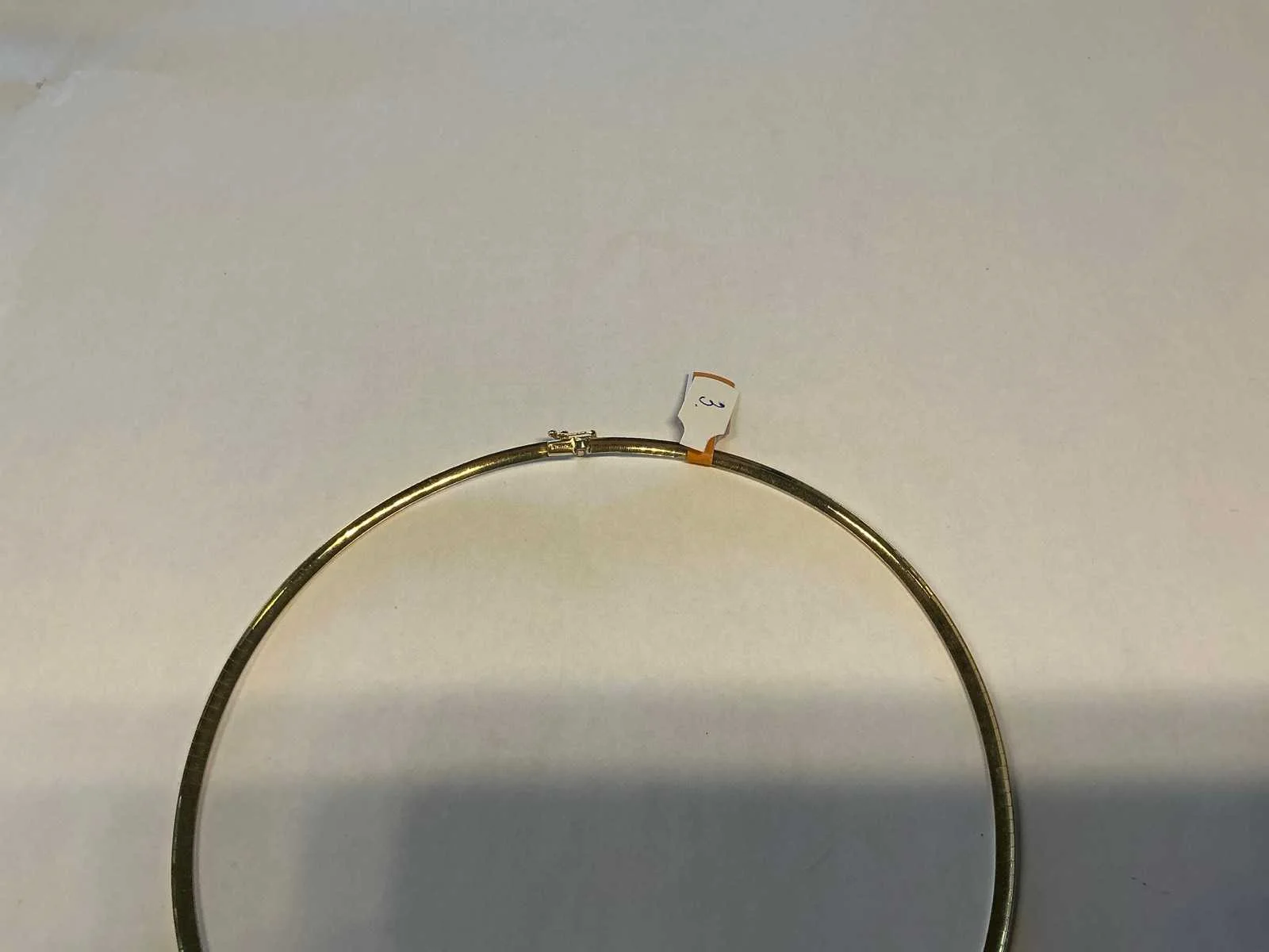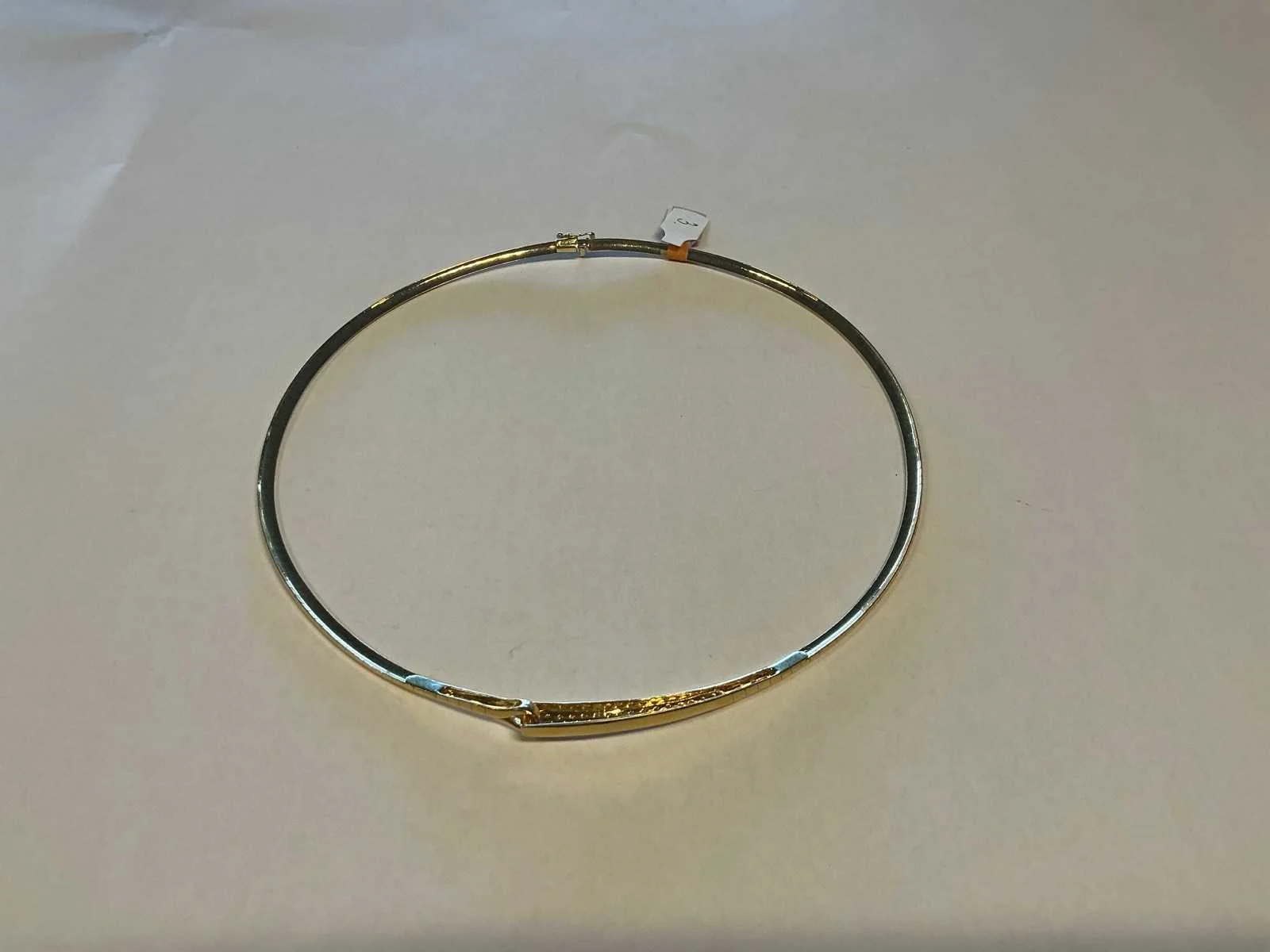 Een 18 karaats (750/000) geelgouden choker. In het midden in elkaar gehaakt. Eén zijde loopt wijder uit en pavé bezet met briljant geslepen diamanten. Bruto gewicht: 2,7 gram. Model: 18 krt geelgouden